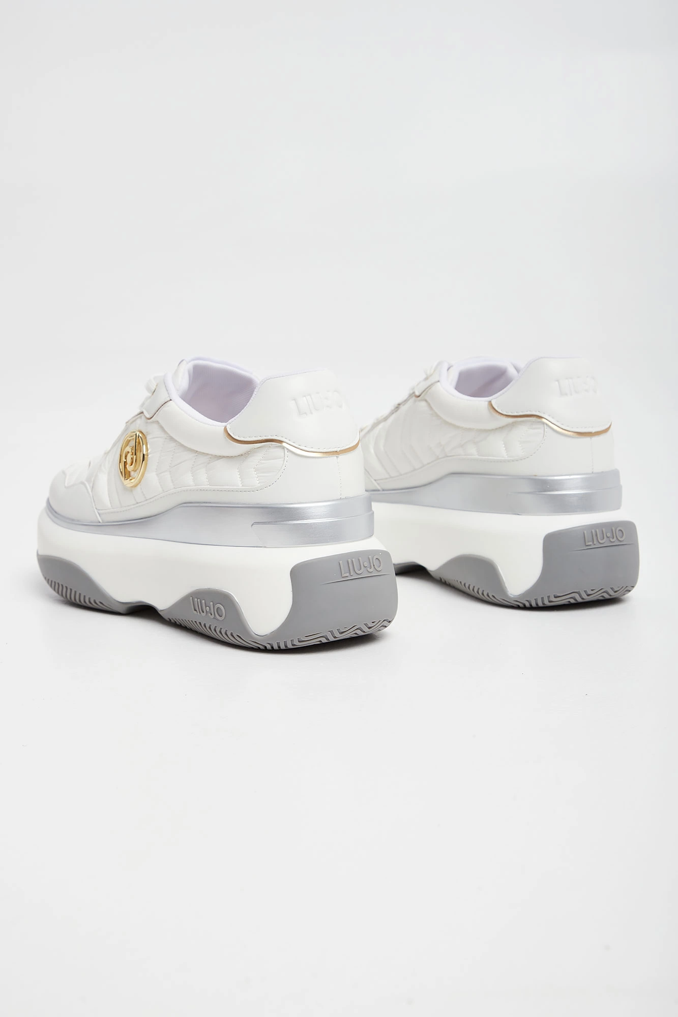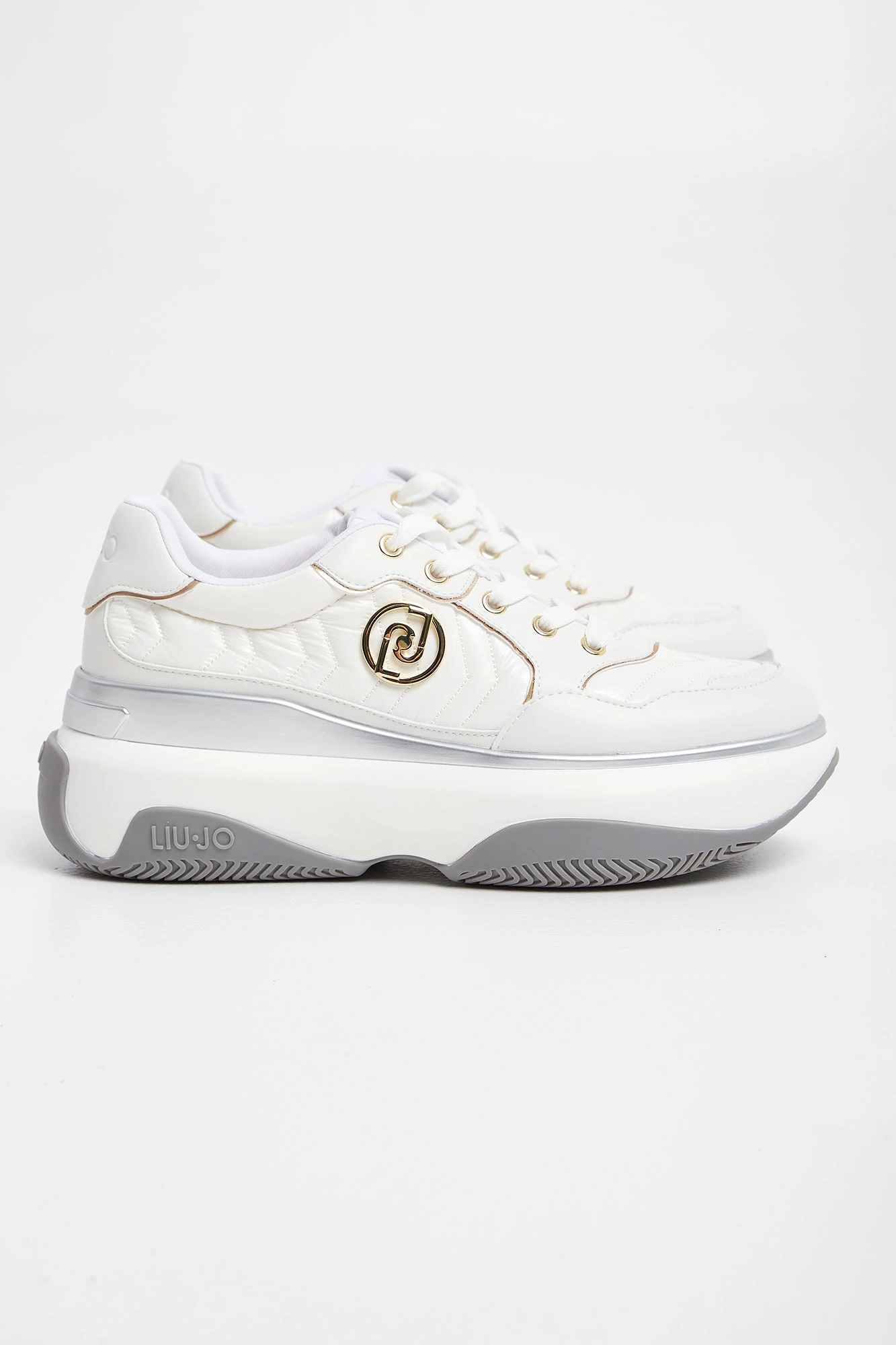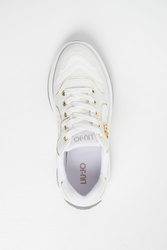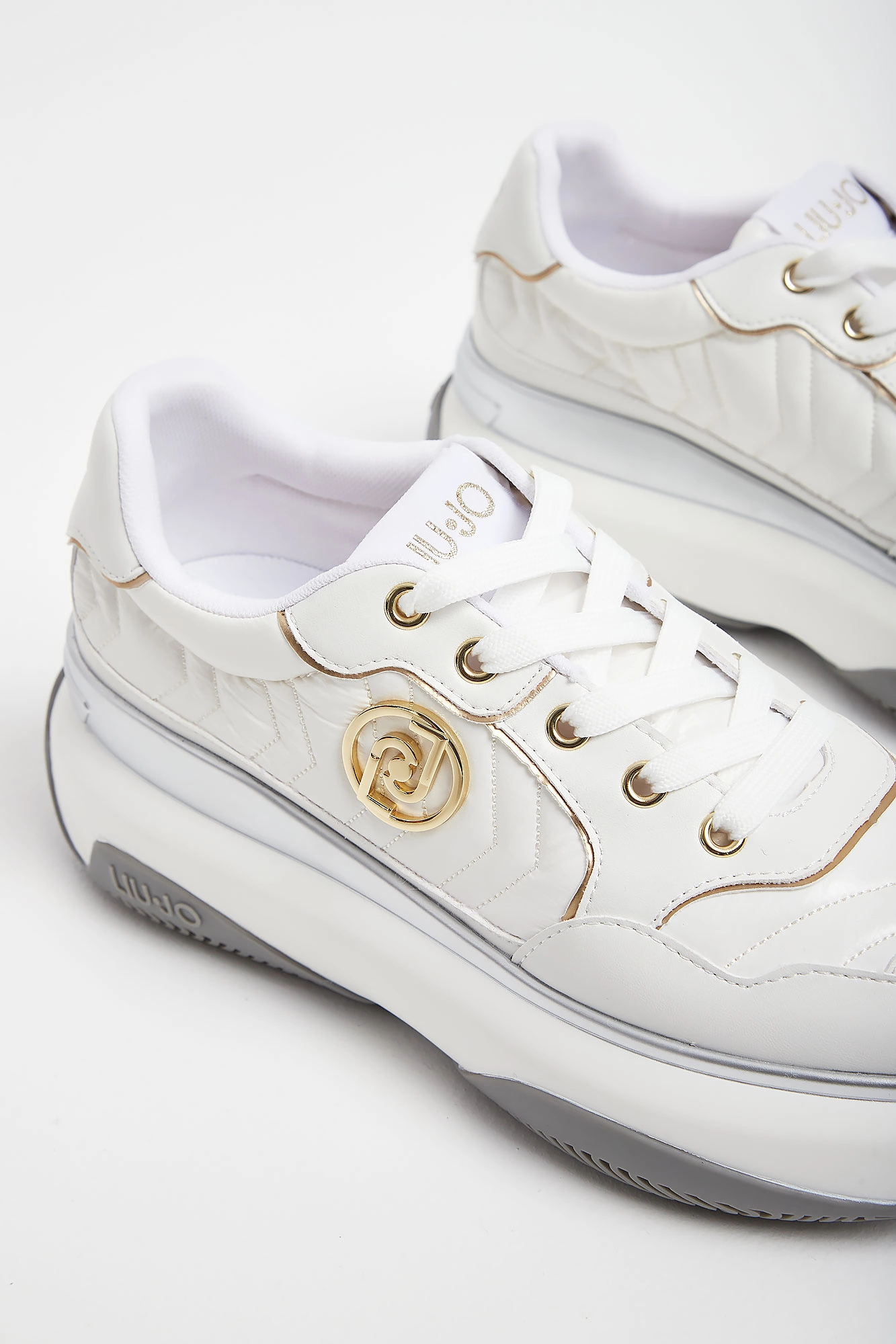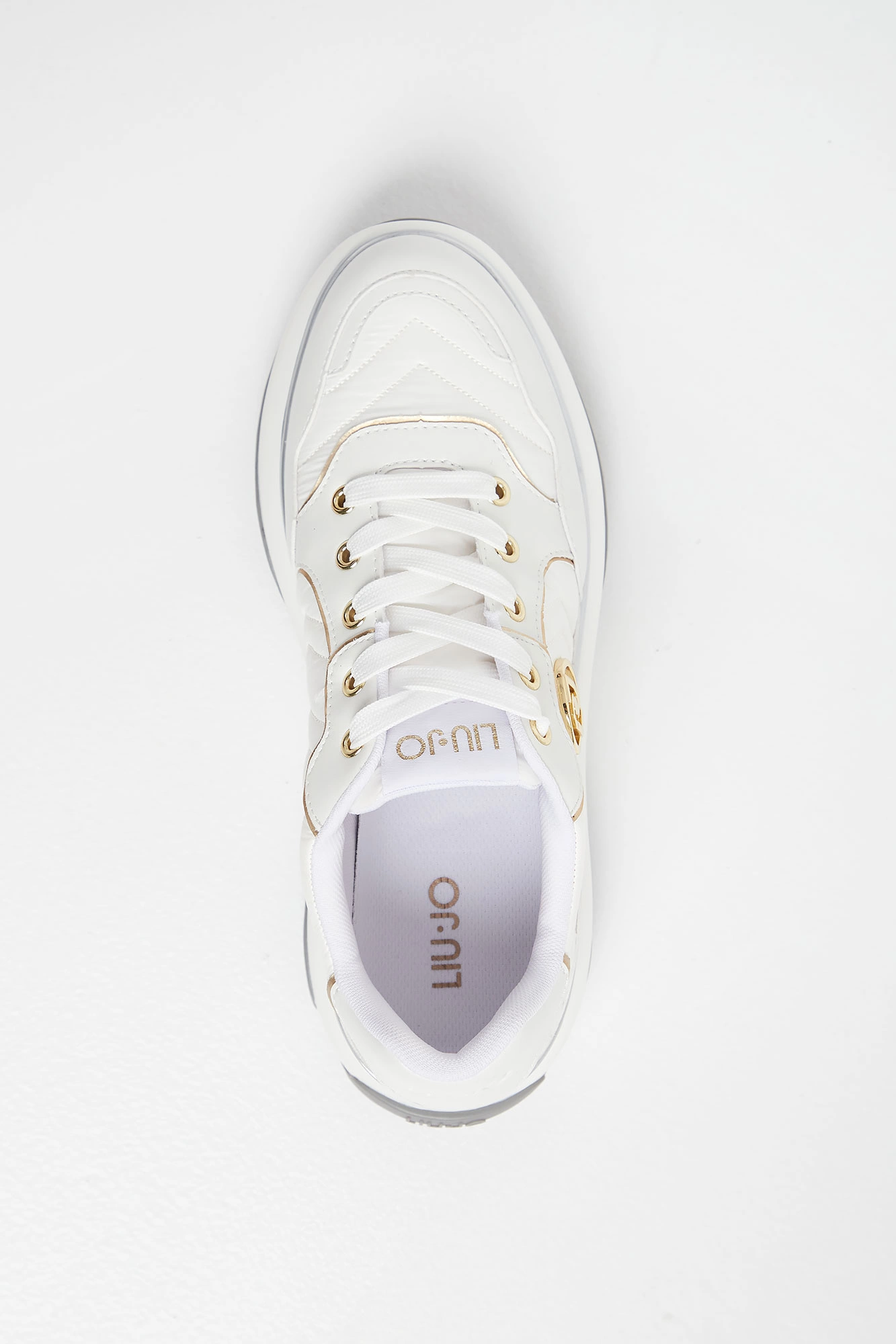 Sneakersy marki Liu Jo w białym kolorze. Na całości ozdobne pikowania i wstawki złotej skóry. Po boku metalowa aplikacja w kształcie monogramu marki w złotym kolorze. Na języku naszywka z nazwą marki. Wiązane za pomocą sznurówek Nieco zaokrąglony nosek, Z tyłu tłoczona nazwa marki, Wysoka, sygnowana podeszwa w szaro-białym kolorze.