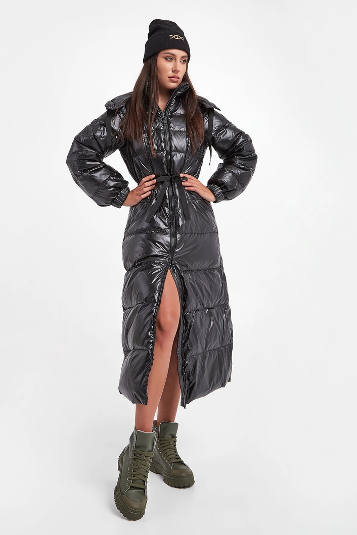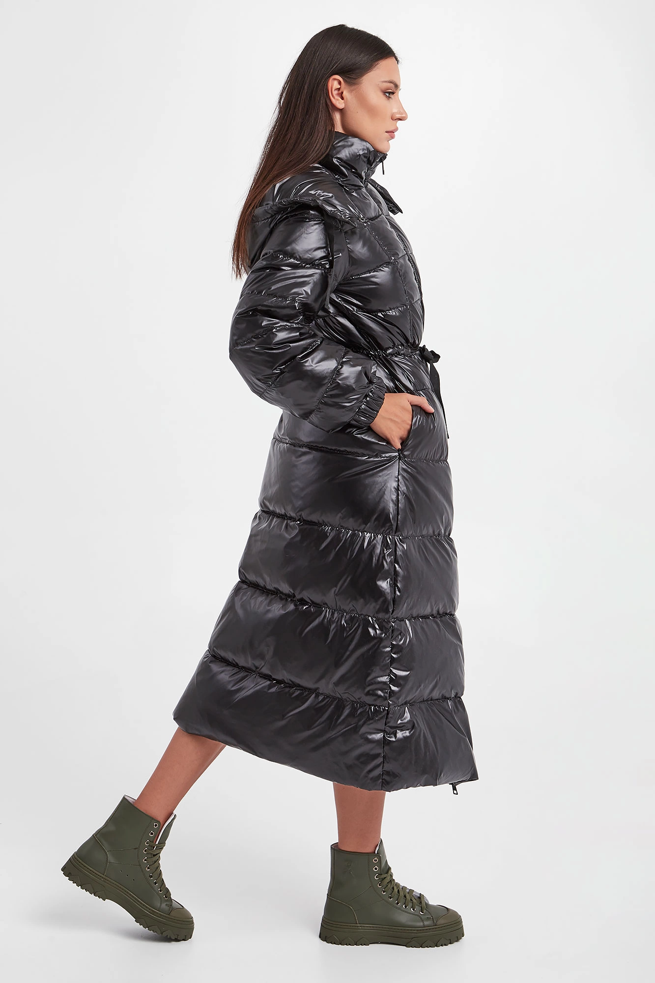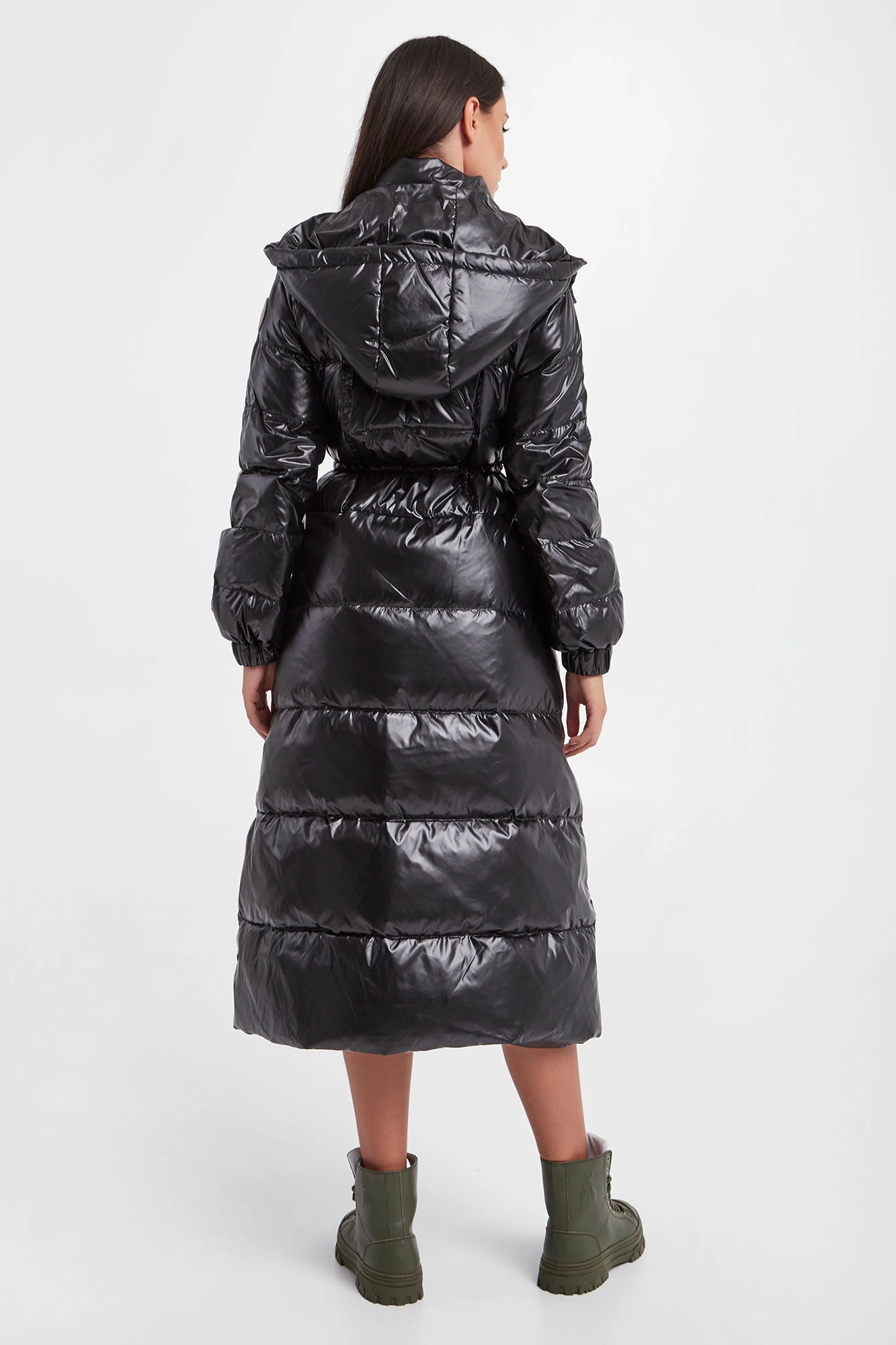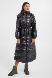Długi płaszcz z kapturem marki Twinset w kolorze czarnym. Zapinany na podwójny zamek. Na całości poziome pikowania. Po bokach dwie kieszenie zapinane na zamek. Kaptur odpinany, z tasiemkami, umożliwiającymi regulację. W pasie regulowany ściągacz. Na rękawie nadruk z logo marki. Rękawy wykończone ściągaczem. Fason typu regular fit.