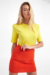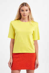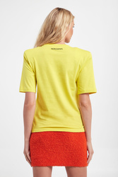 T-shirt marki Patrizia Pepe w żółtym kolorze. Dekolt typu o-neck zakończony ściągaczem. Krótkie rękawy i dół wykończone lamówką. Na linii karku czarny nadruk z logo. Ramiona wzmocnione poduszkami. Fason regular fit. Wykonany ze stuprocentowej bawełny.