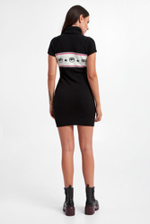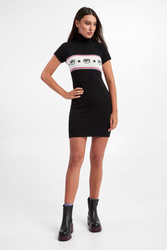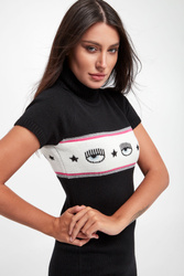 Sukienka z golfem marki Chiara Ferragni w kolorze czarnym. Długość mini. Z krótkim rękawem. Przez środek przebiega nadruk w postaci paska z charakterystycznym dla marki oczkiem i gwiazdką. Golf, rękawy i dół wykończone elastycznym ściągaczem prążkowanym. Fason typu slim fit.