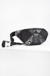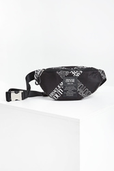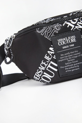 Nerka marki Versace Jeans Couture w czarnym kolorze. Jednokomorowa. Na całości biały nadruk z nazwą marki. Zapinana za pomocą zamka. Do noszenia na materiałowym pasku, zapinany za pomocą metalowej klamry. Z przodu naszywka z ekologicznej skóry z białym nadrukiem. Wewnątrz dodatkowa kieszeń i sygnowana wyściółka.