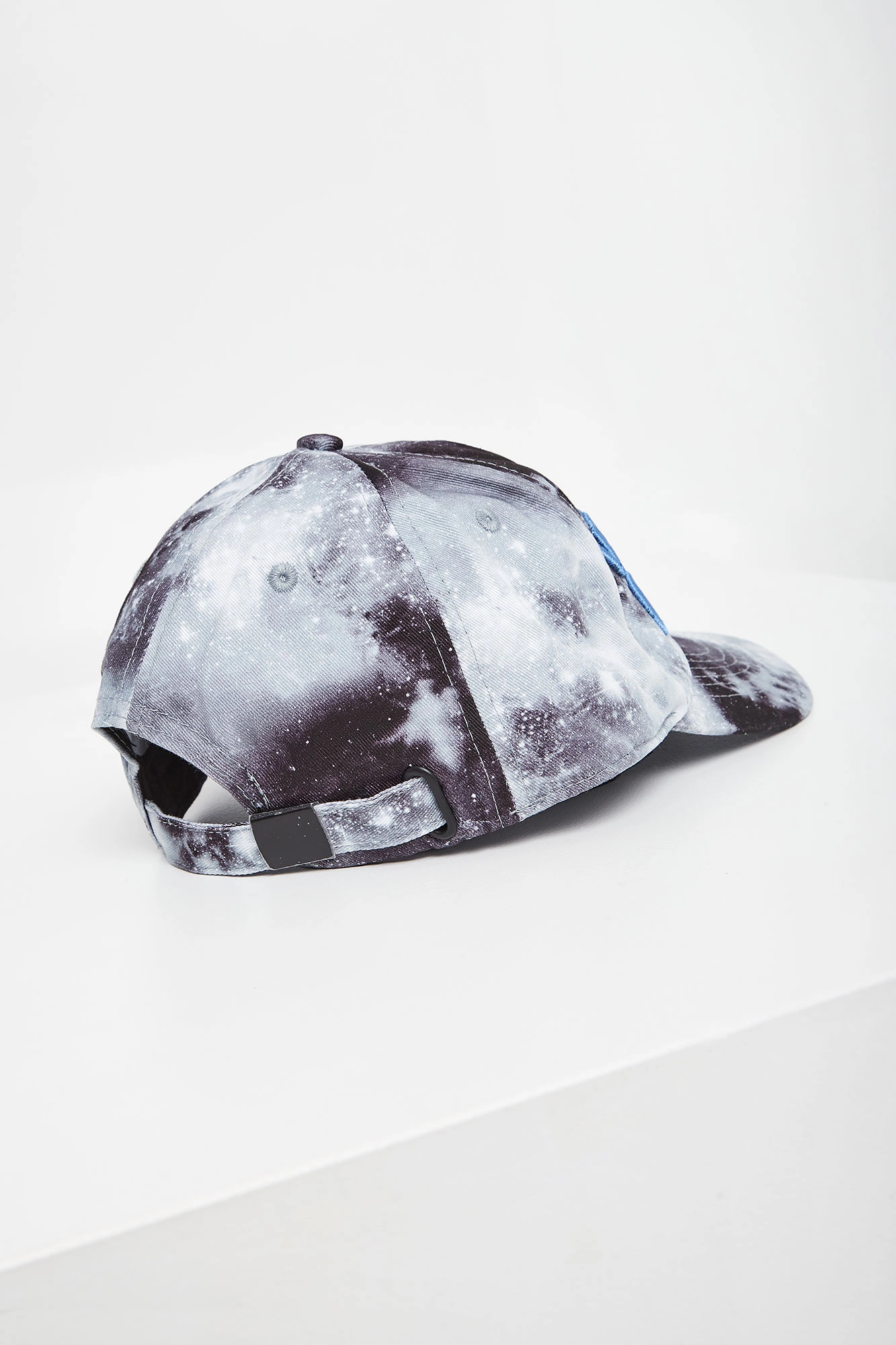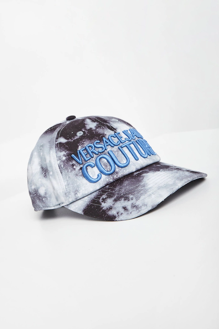 Czapka z daszkiem marki Versace Jeans Couture. Na całości czarno-szary nadruk z motywem galaktyki. Na froncie haftowane, niebieskie logo. Z tyłu regulowane zapięcie. Na całości przeszycia. Wykonana ze stuprocentowej bawełny.