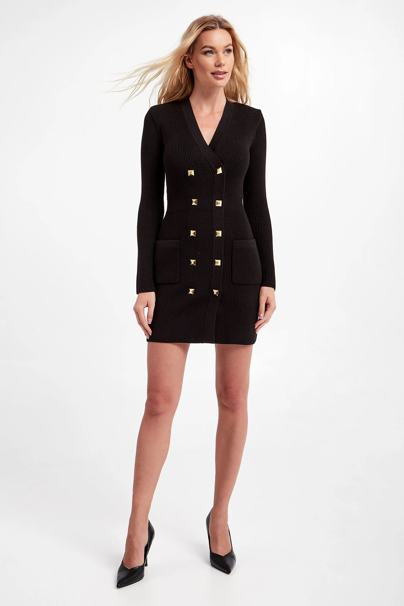 Dzianinowa sukienka marki Elisabetta Franchi w czarnym kolorze. Całość prążkowana. Fason typu slim fit, długość mini. Dekolt typu v-neck. Z przodu dwie wpuszczane kieszenie. Zapinana za pomocą złotych, sygnowanych zatrzasków. Długie, przylegające rękawy.