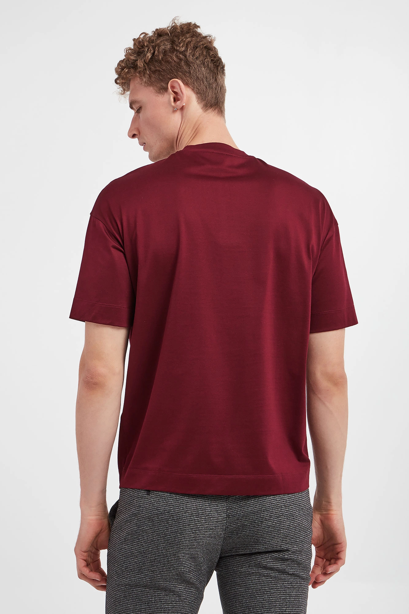 T-shirt marki Emporio Armani w bordowym kolorze. Na froncie czarne, aksamitne logo marki. Dekolt typu o-neck zakończony ściągaczem. Krótkie rękawy i dół wykończone lamówką. Fason typu regular. Wykonany z czystej, merceryzowanej bawełny.