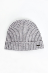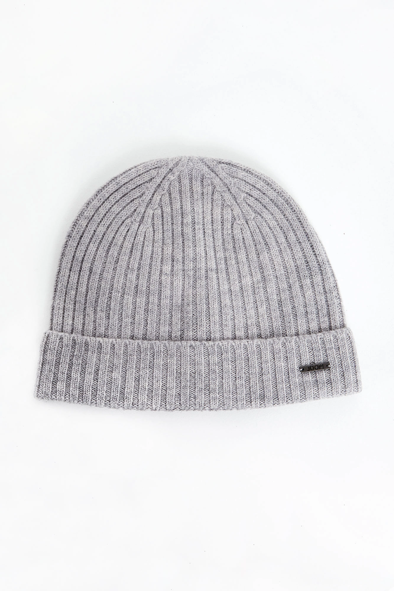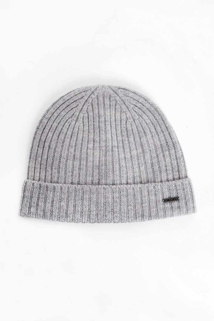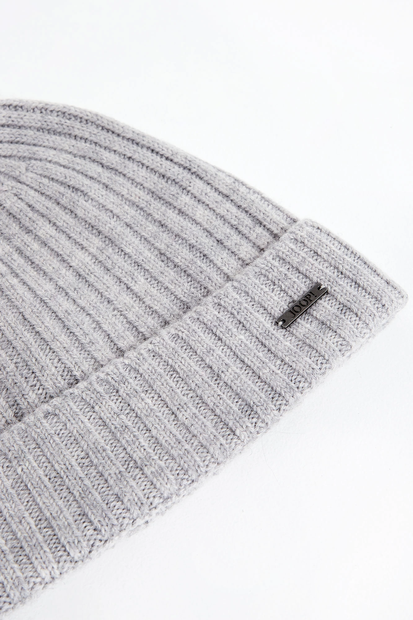 Wełniana czapka marki Joop! w jasnoszarym kolorze. Na całości prążki. Zakończona wywijanym ściągaczem. Na ściągaczu znajduje się nieduża plakietka z nazwą marki. Czapka zapewni ciepło i komfort w zimne dni.