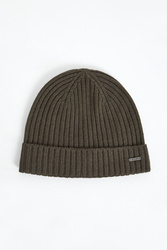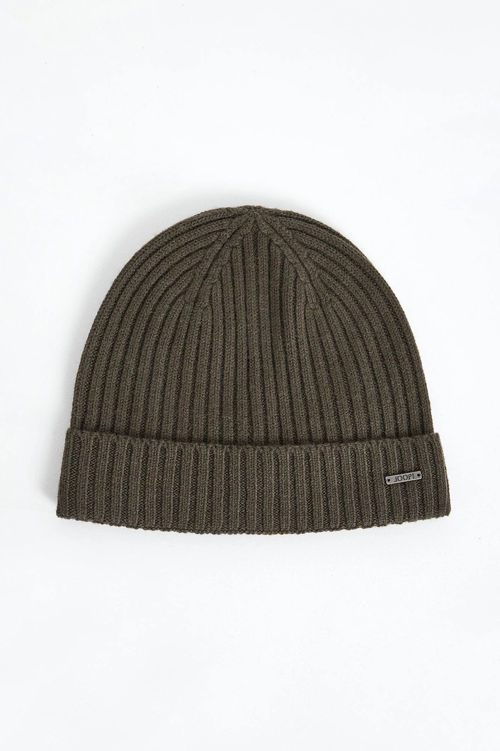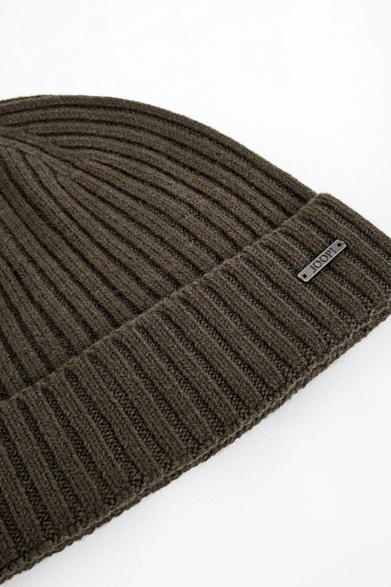 Wełniana czapka marki Joop! w kolorze khaki. Na całości prążki. Zakończona wywijanym ściągaczem. Na ściągaczu znajduje się nieduża plakietka z nazwą marki. Czapka zapewni ciepło i komfort w zimne dni.