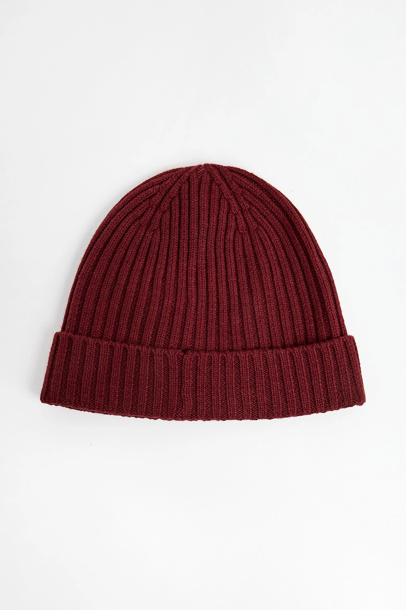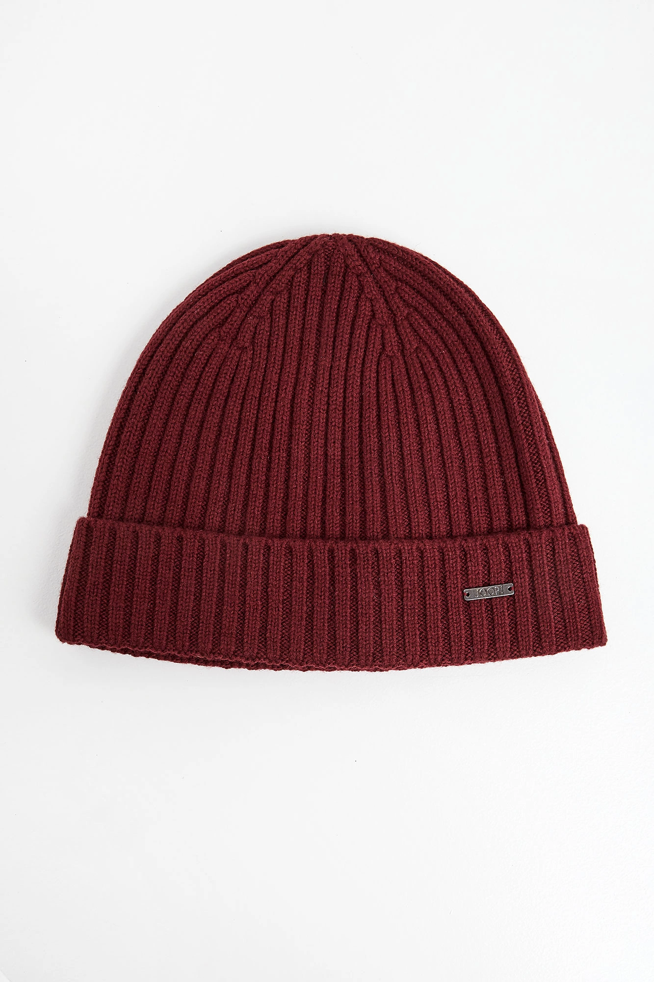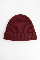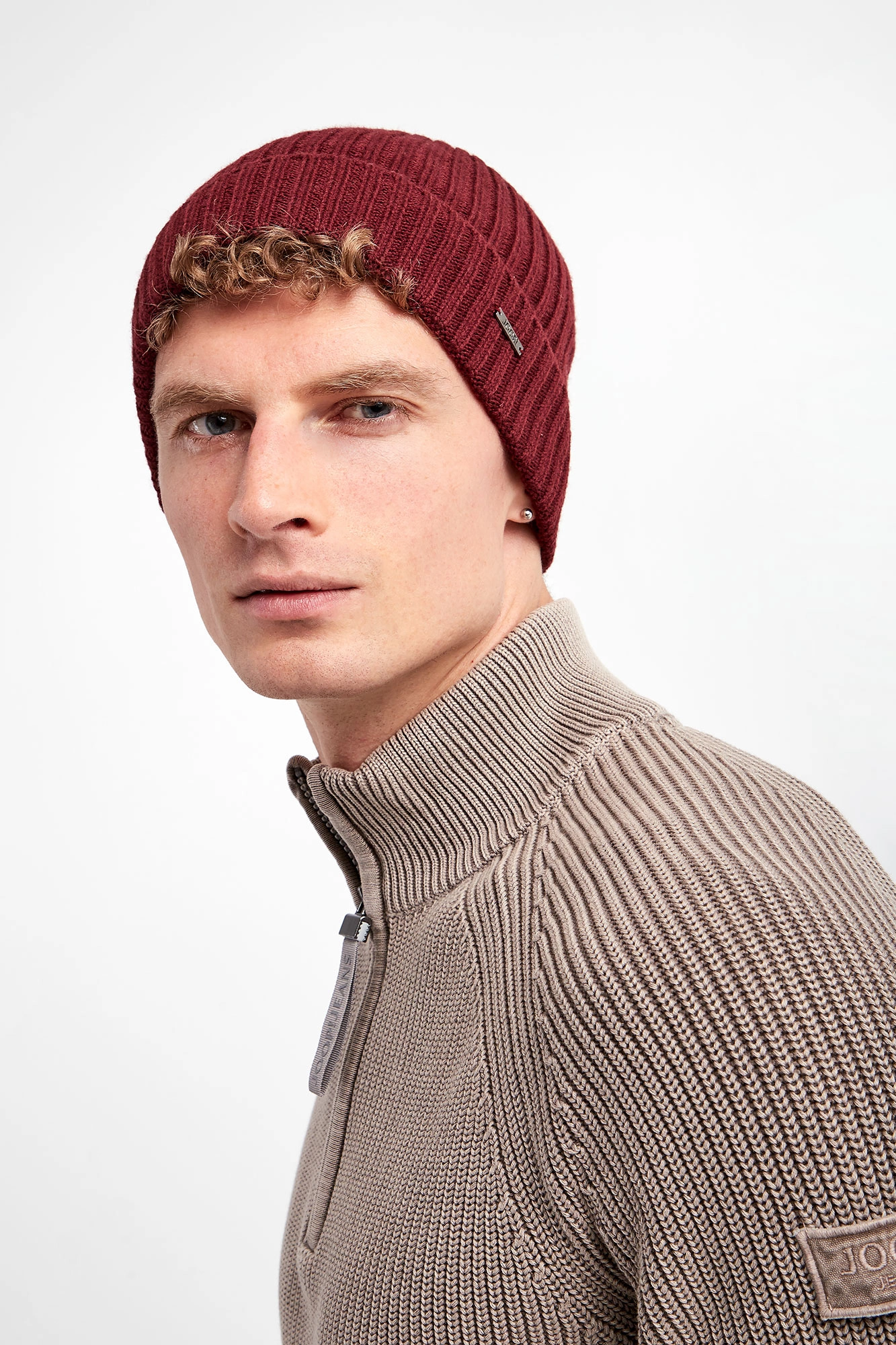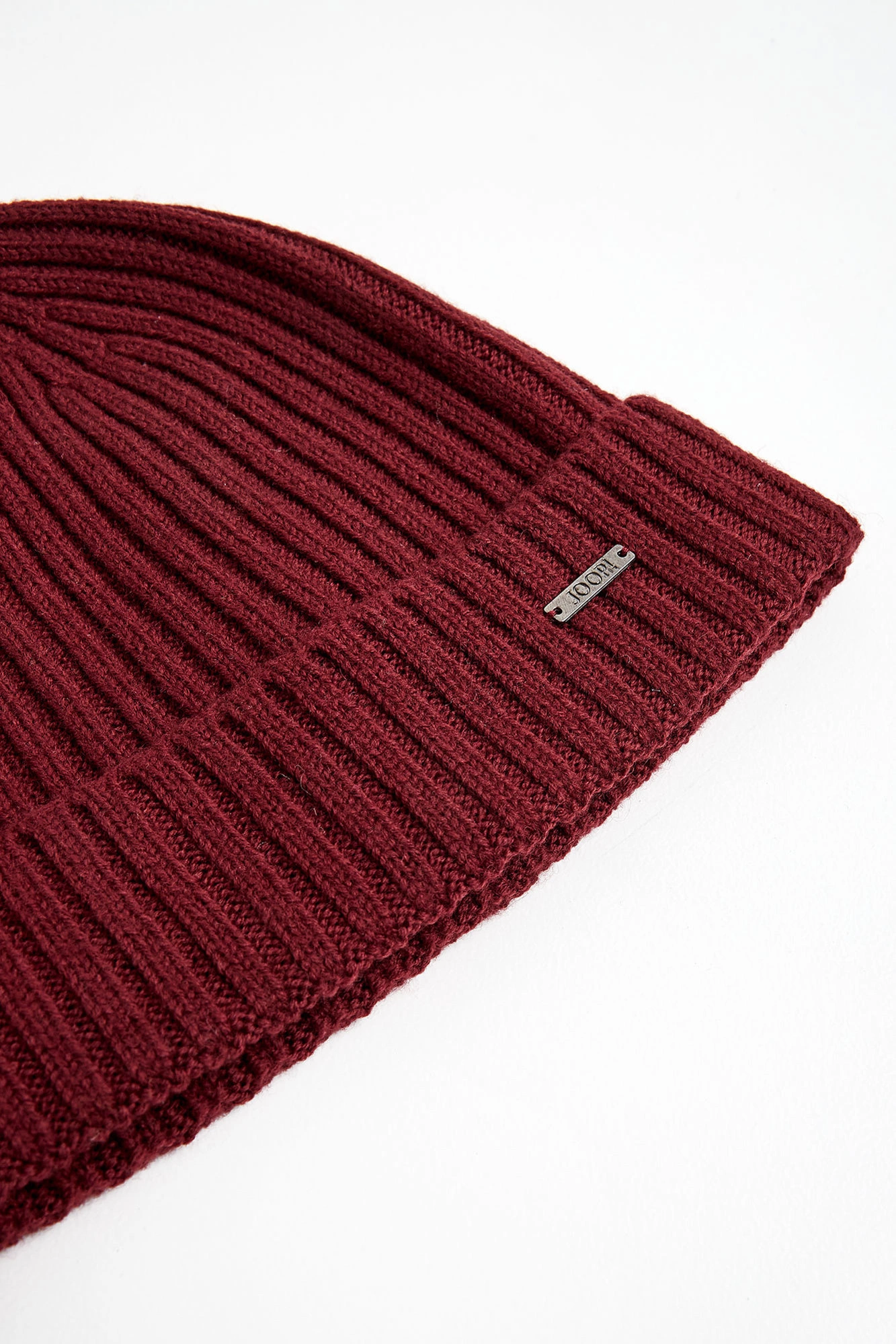 Wełniana czapka marki Joop! w bordowym kolorze. Na całości prążki. Zakończona wywijanym ściągaczem. Na ściągaczu znajduje się nieduża plakietka z nazwą marki. Czapka zapewni ciepło i komfort w zimne dni.