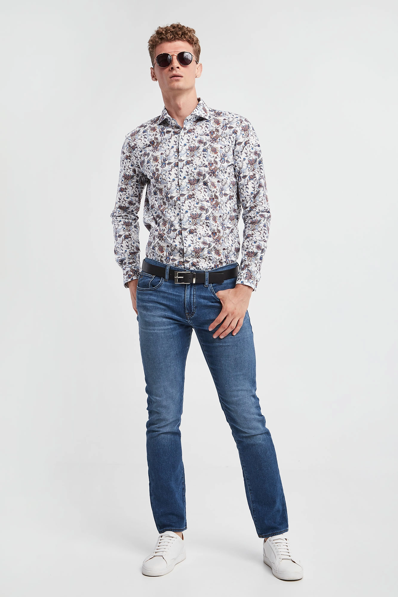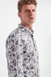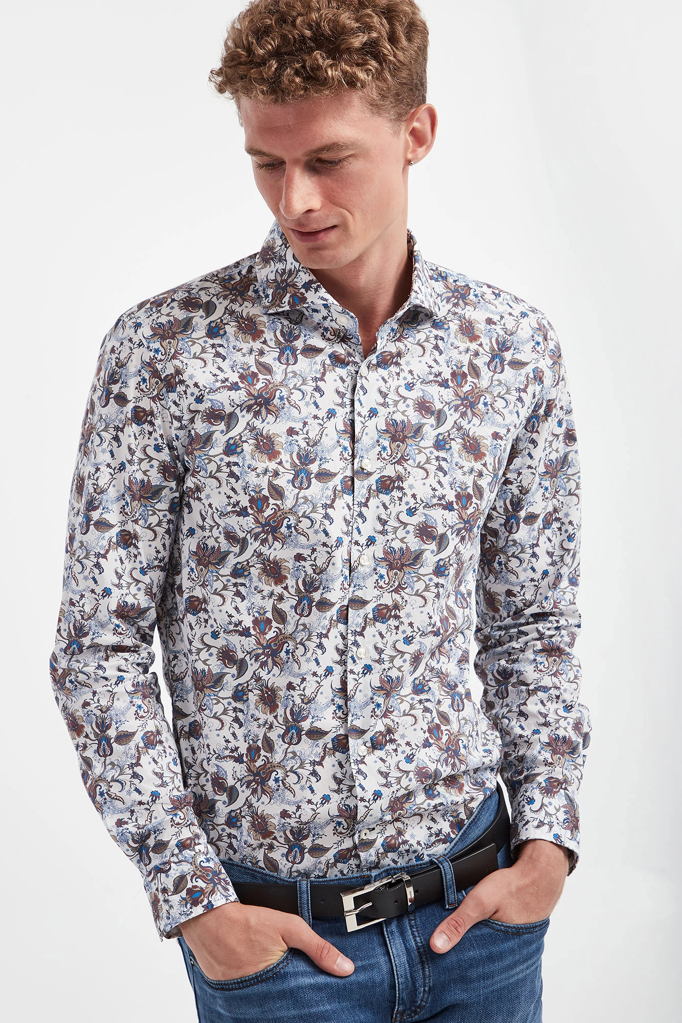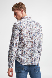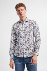 Koszula marki Joop! w białym kolorze. Na całości kolorowe, kwiatowe wzory. Zapinana za pomocą perłowych guzików. Dekolt z klasycznym kołnierzem. Długie rękawy zakończone zapinanymi mankietami. Zaokrąglony dół. Fason typu slim. Wykonana z bawełnianej tkaniny z domieszką elestanu.