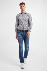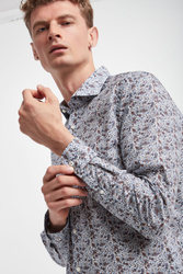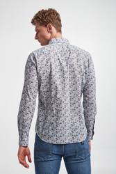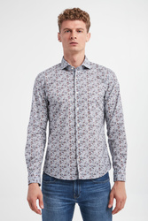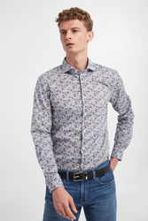 Koszula marki Joop! w białym kolorze. Na całości kolorowe, kwiatowe wzory. Zapinana za pomocą perłowych guzików. Dekolt z klasycznym kołnierzem. Długie rękawy zakończone zapinanymi mankietami. Zaokrąglony dół. Fason typu slim. Wykonana z bawełnianej tkaniny z domieszką elestanu.