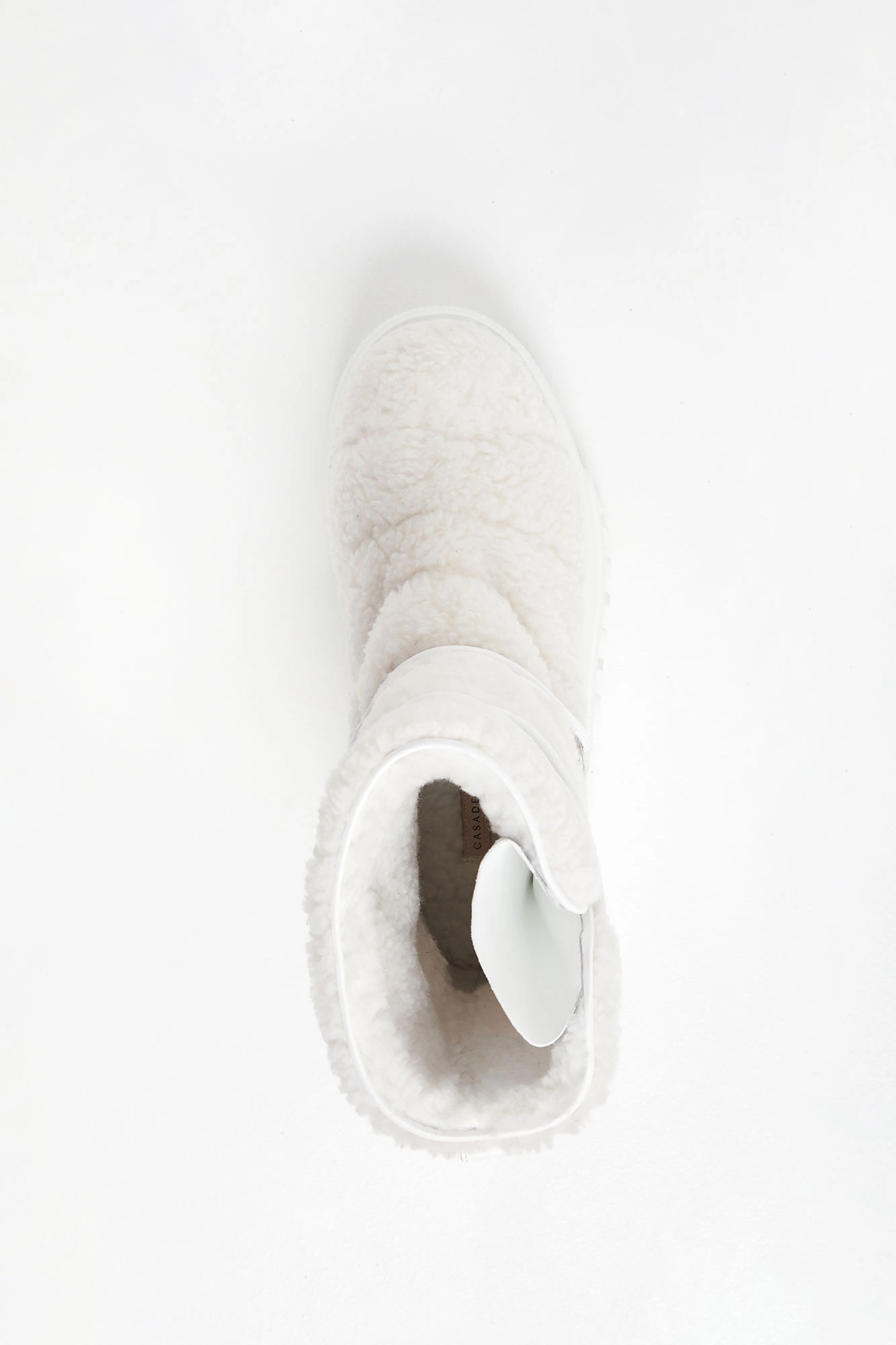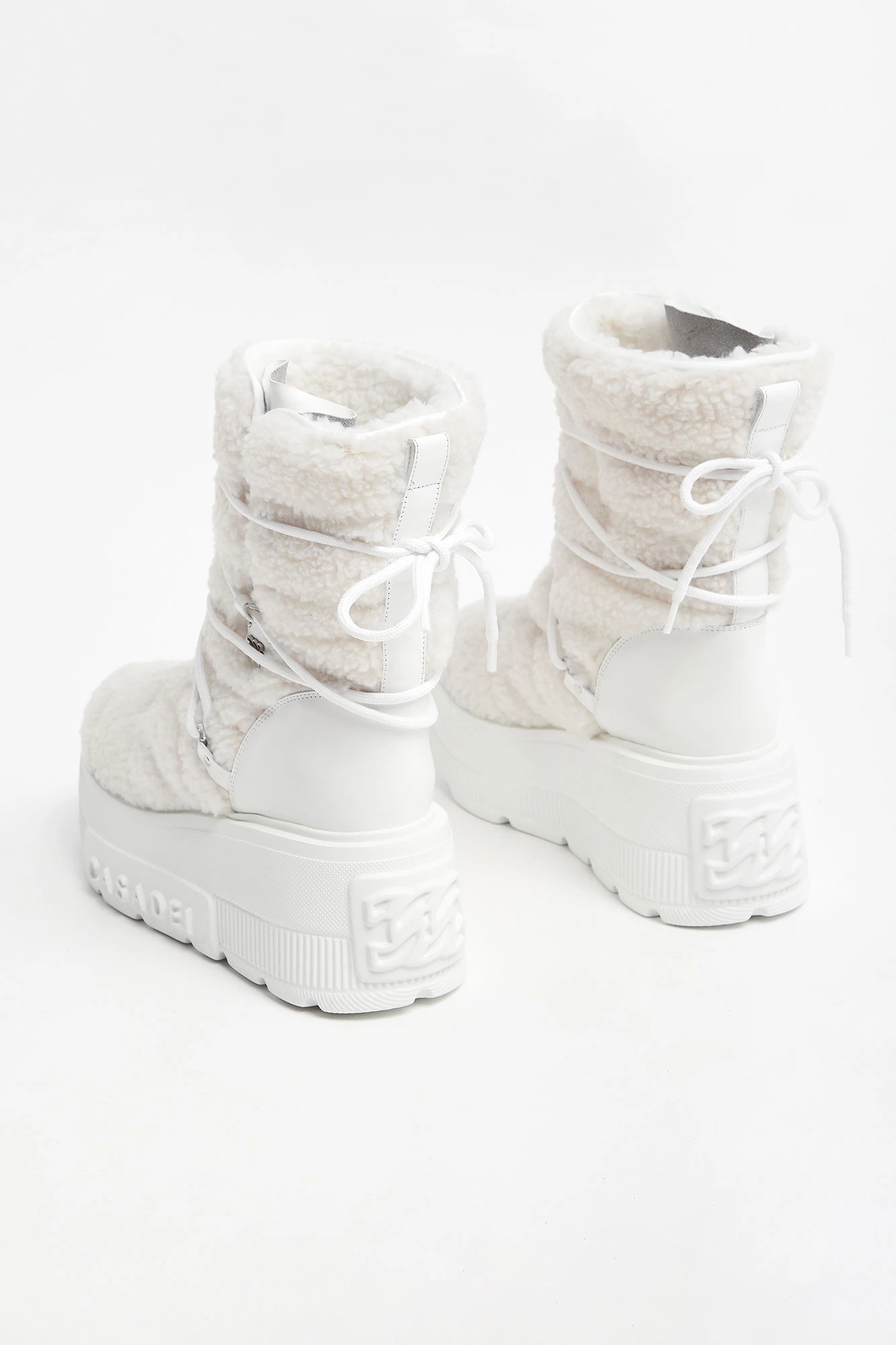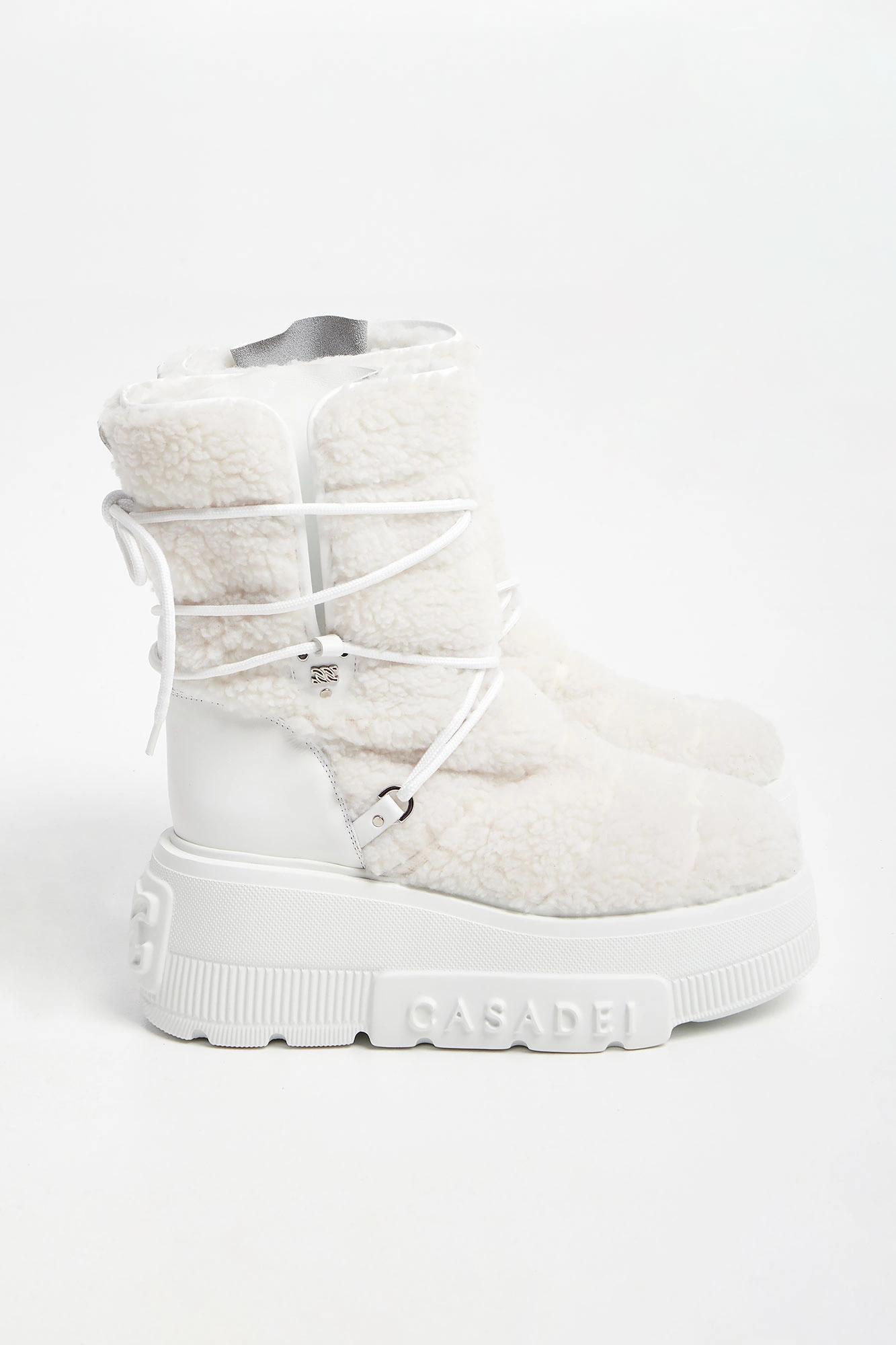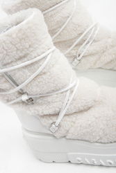 Śniegowce marki Casadei w kolorze złamanej bieli. Wykończone miękkim futerkiem. Wiązane naokoło kostki. Wstawki ze skóry zamszowej. U boku niewielkie sygnowanie. Wnętrze ocieplone futerkiem. Podeszwa gruba, z sygnowaniem i połączeniem różnych tekstur.