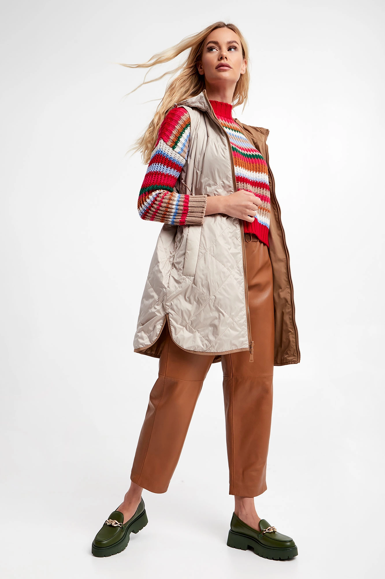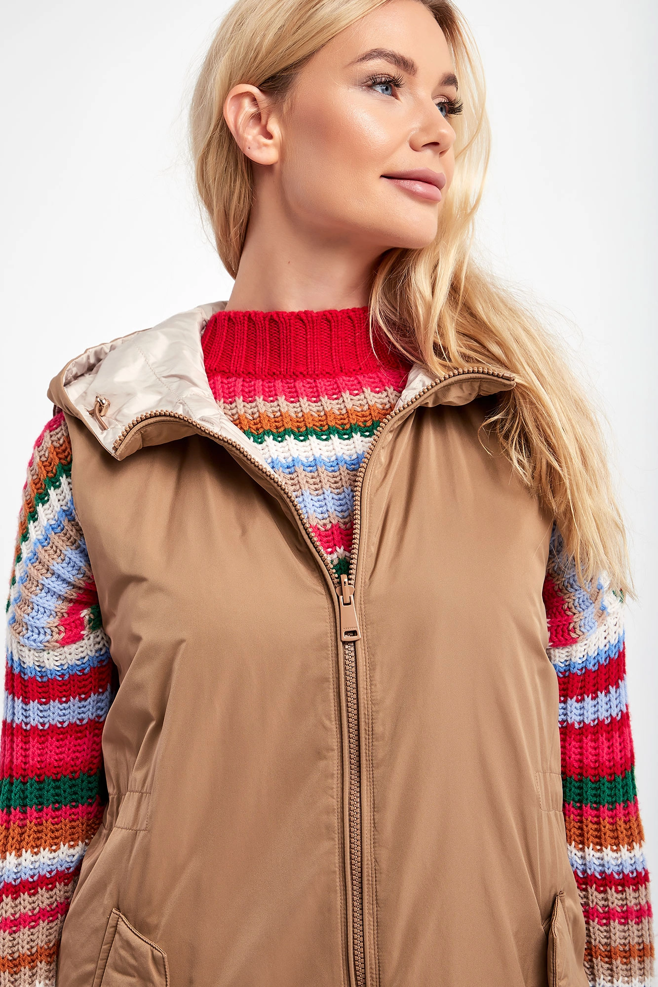 Dwustronna kamizelka z kapturem marki Weekend Max Mara kamelowym kolorze. Zapinana na dwukierunkowy zamek. Jedna strona gładka, z kieszeniami zapinanymi na napy. Przy kapturze ściągacz ze stoperami. Na drugiej, beżowej stronie geometryczne pikowania. Dwie kieszenie na froncie. W pasie ściągacz z możliwością regulacji. Obie strony z plakietką z logo marki pod linią karku. W składzie kaszmir Luxepad z dodatkiem włókien poliestrowych pochodzących z recyklingu, które mają większe właściwości izolacyjne niż materiały pierwotne, a ich wytworzenie nie prowadzi do dalszego zużycia surowców. Fason typu regular.
