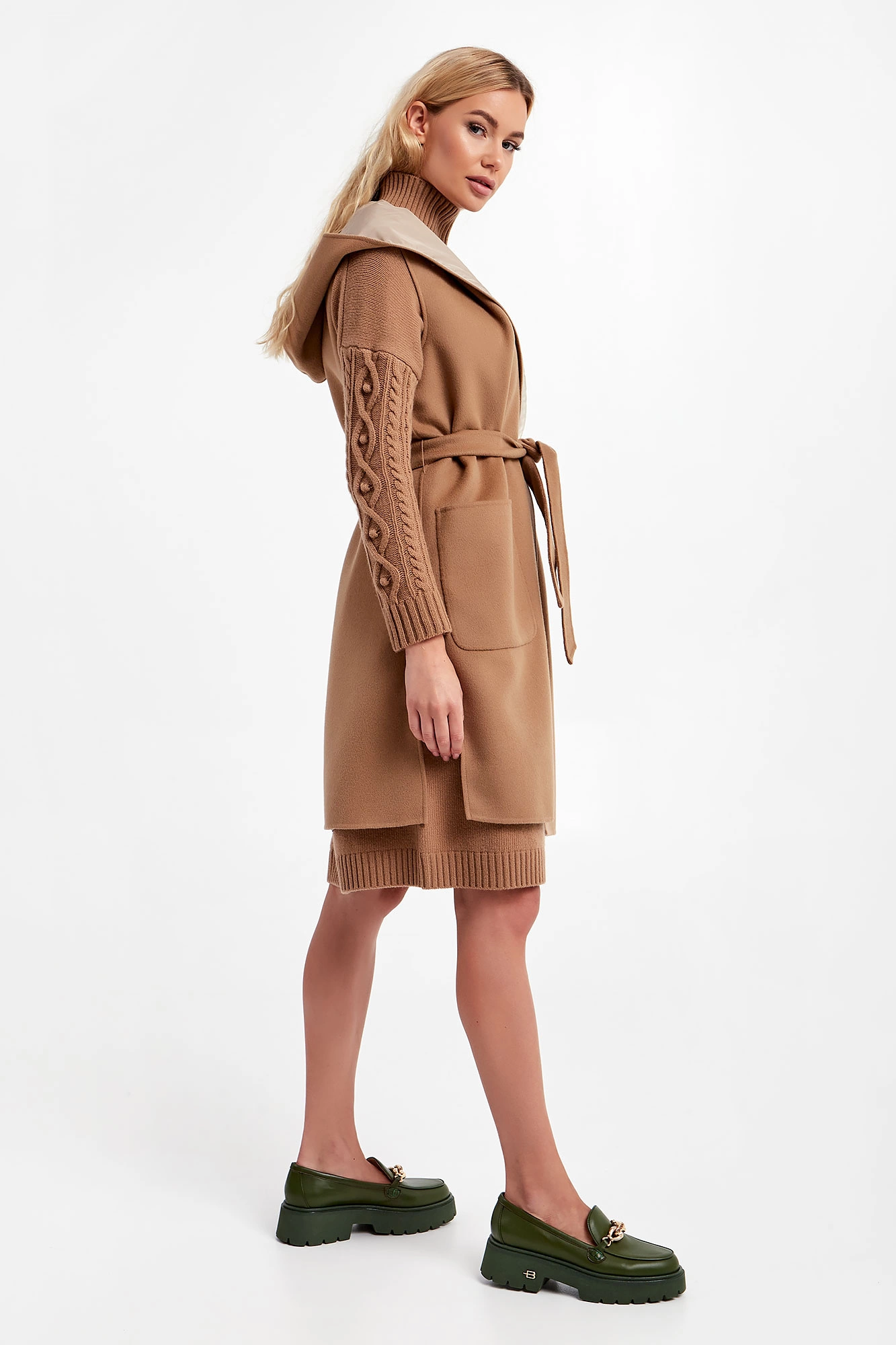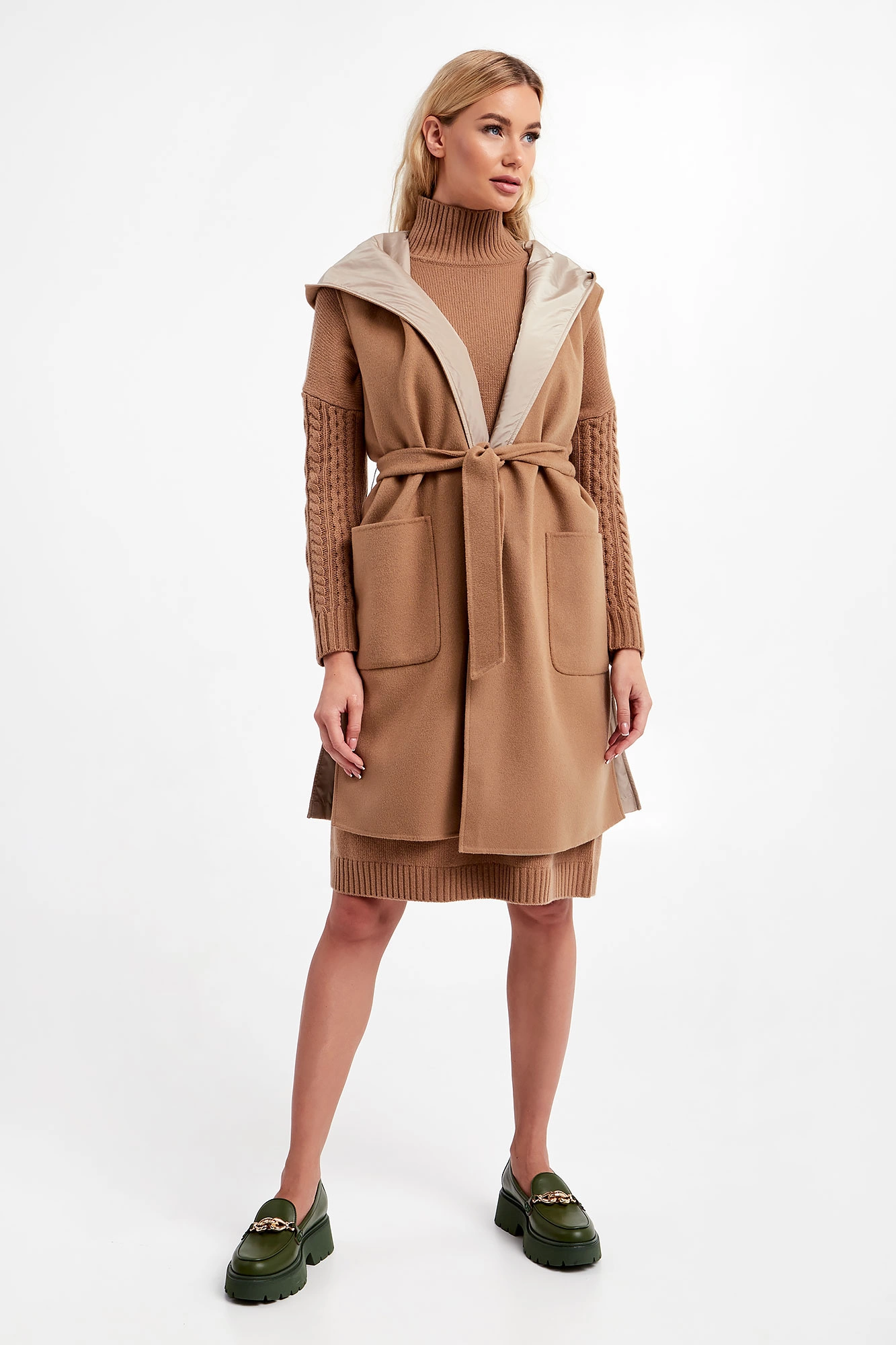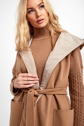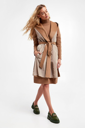 Dwustronna kamizelka marki Weekend Max Mara. Z jednej strony wełniana, kamelowa. Z drugiej gładka w chłodnym odcieniu beżu. Z każdej strony po dwie kieszenie. Po bokach rozcięcia. Dodatkowo kamelowy pasek. Fason typu regular.