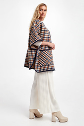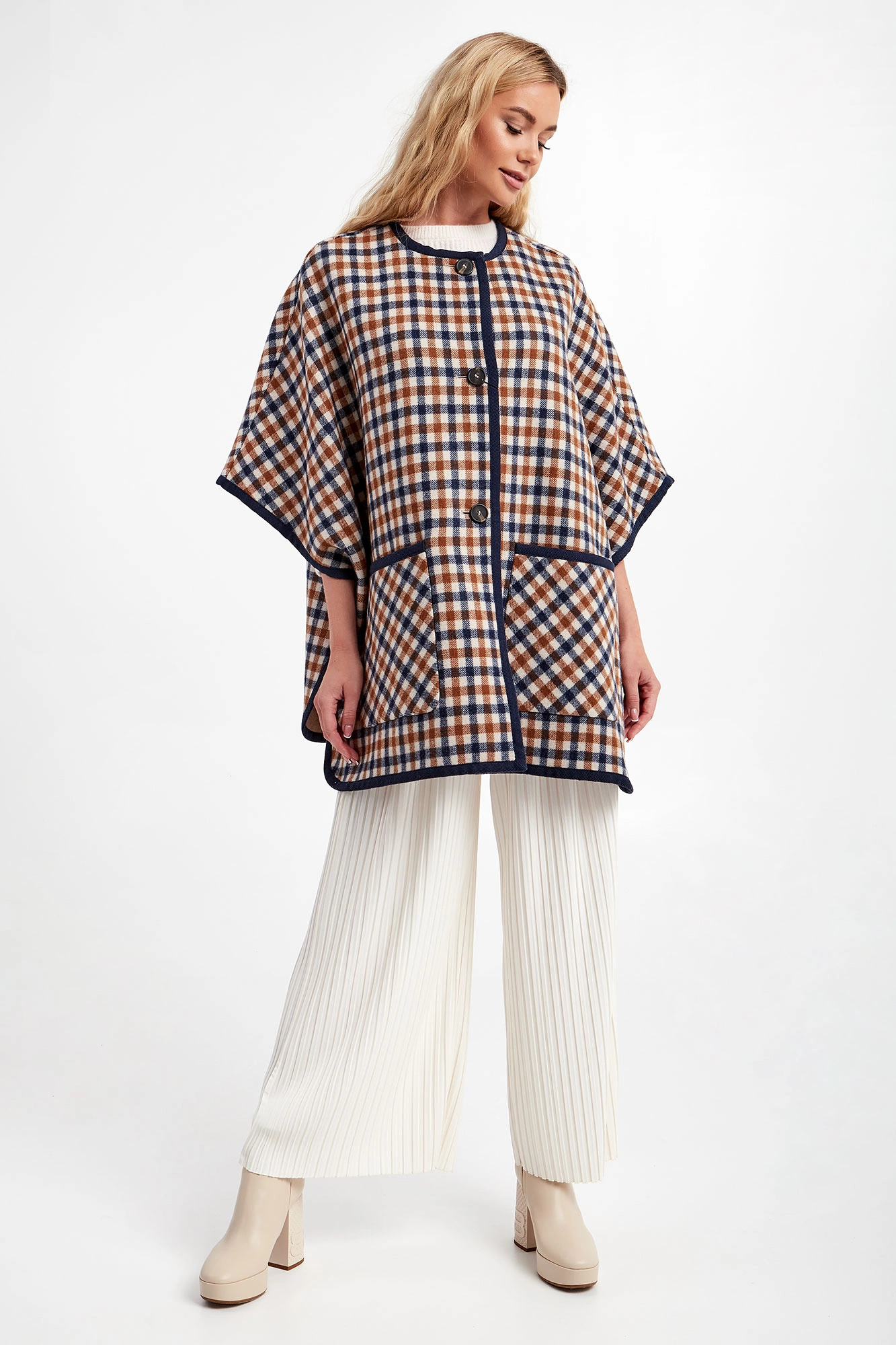 Wełniane ponczo dwustronne marki Weekend Max Mara. Zapinane na guziki. Jedna strona w wielokolorową kratę, druga w beżowym kolorze. Dwie kieszenie po każdej ze stron. Brzegi wykończone granatową lamówką. Po bokach guziki umożliwiające spięcie brzegów. Fason oversize.