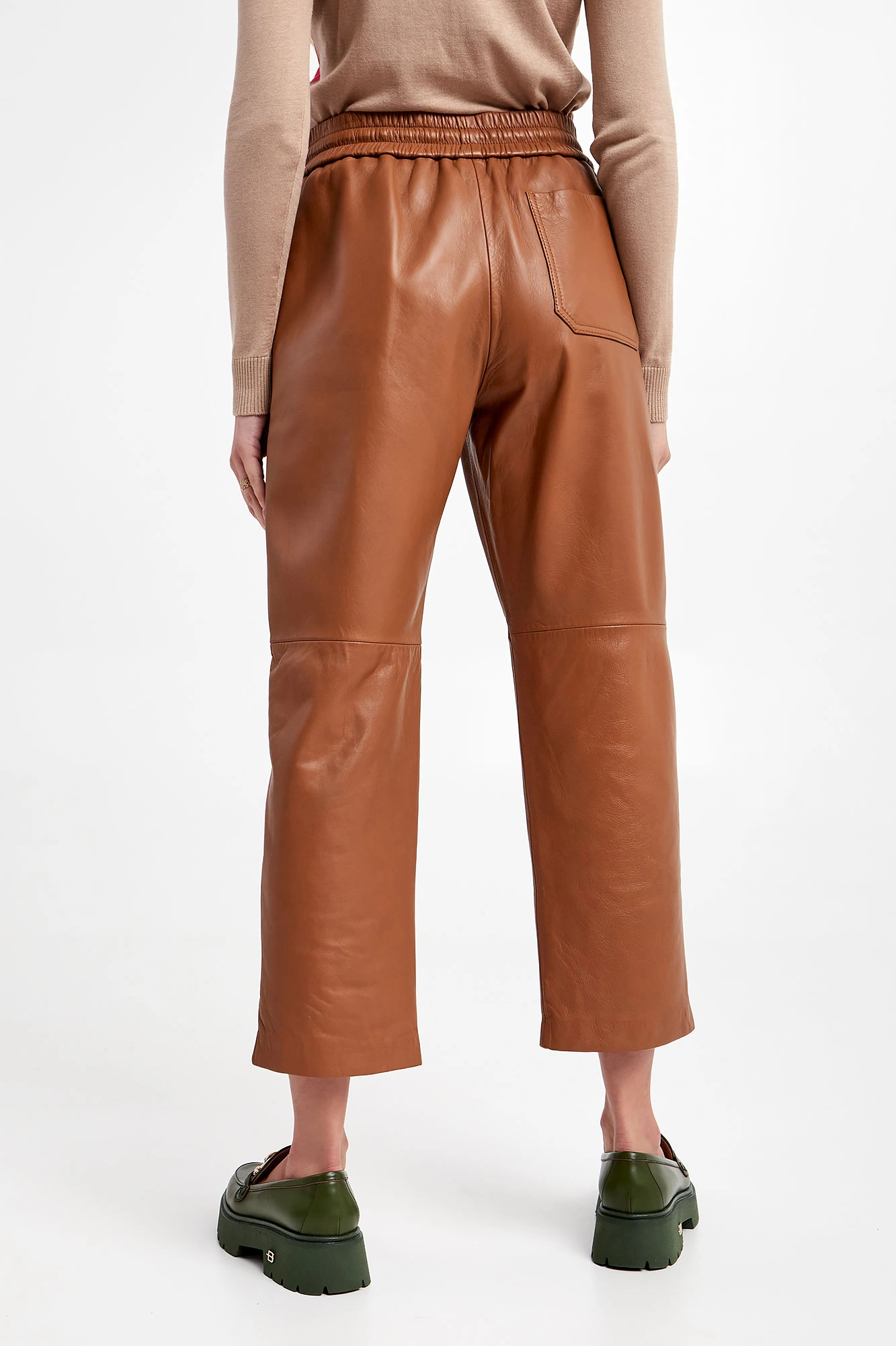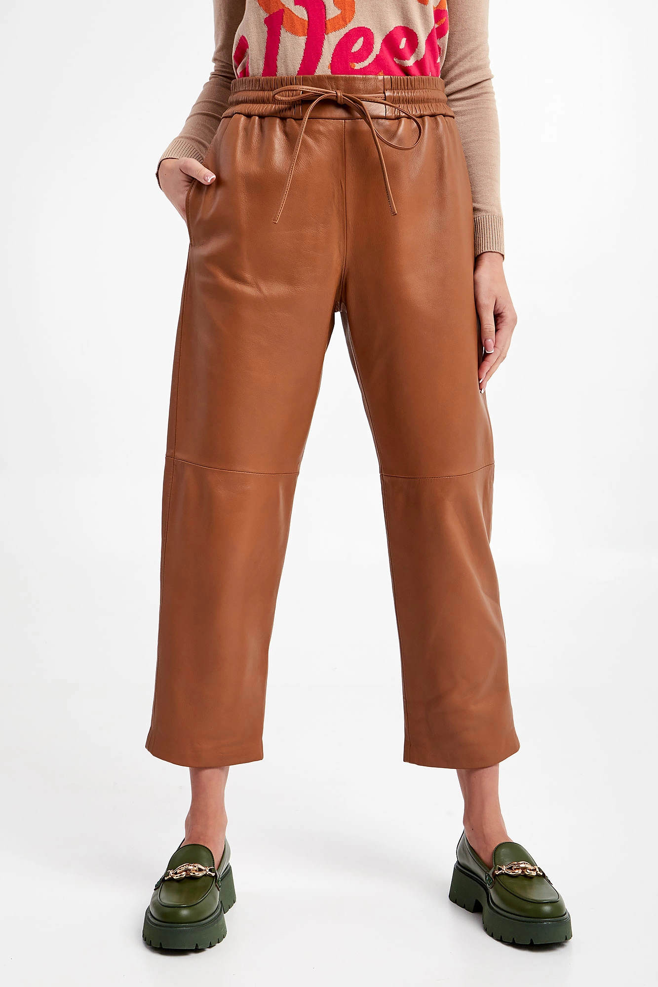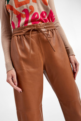Skórzane spodnie marki Weekend Max Mara w kamelowym kolorze. Model z dwiema kieszeniami z przodu i jedną z tyłu. W pasie ściągacz z troczkami, umożliwiającymi regulację. Po środku nogawek poziome przeszycia. Wewnątrz podszewka z delikatnego materiału. Fason typu straight.