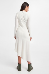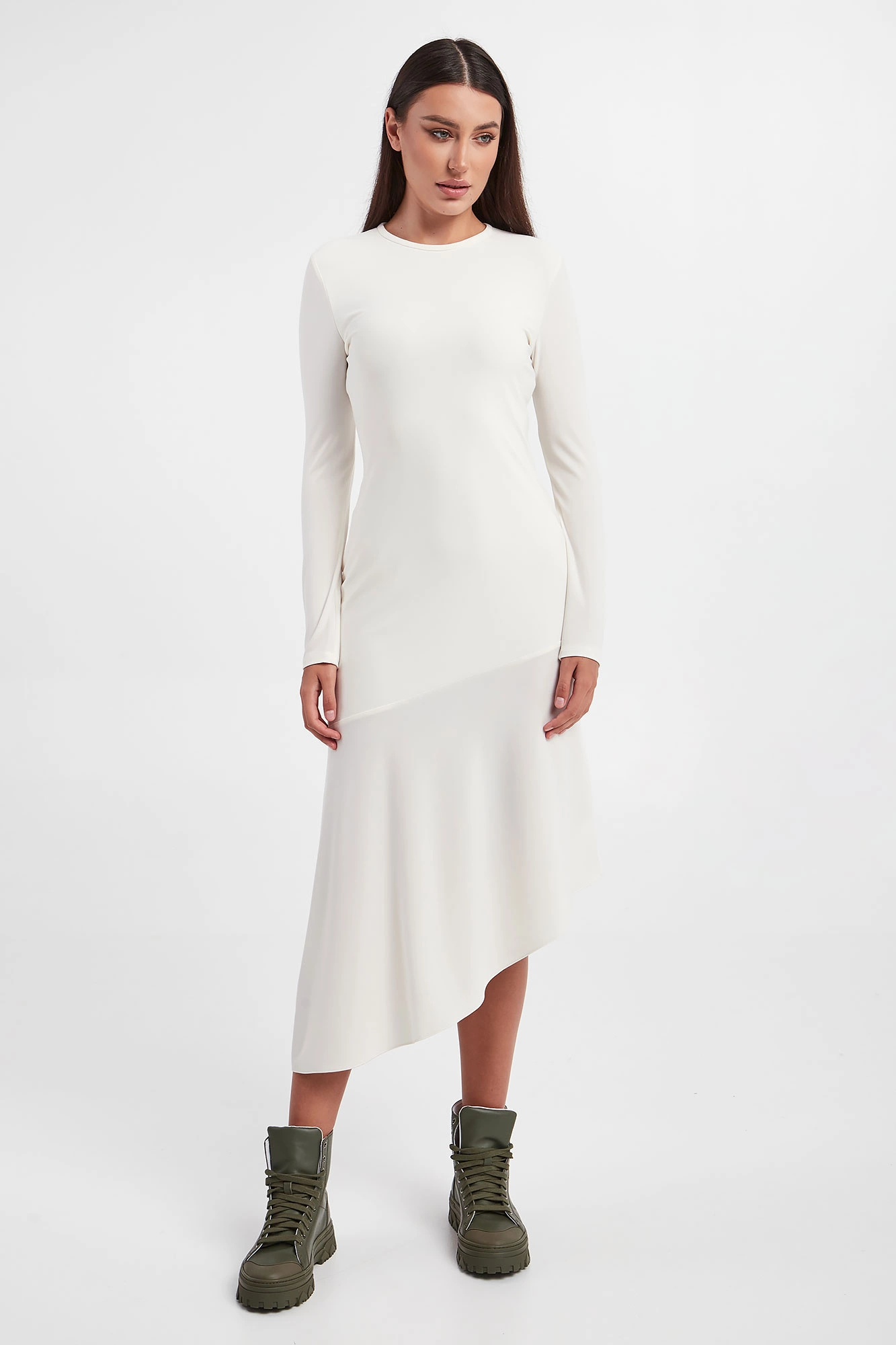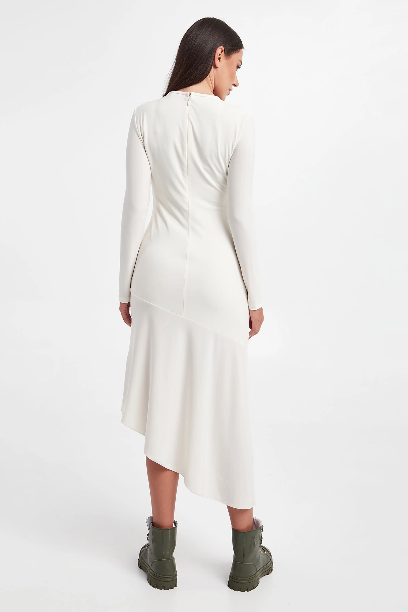 Sukienka marki Max Mara Leisure w kolorze ecru. Zapinana z tyłu, na zamek i haftkę. Z długim rękawem. Dekolt typu o-neck. Górna część sukienki wykonana z dwóch warstw materiału. Dół o asymetrycznym wykończeniu. Fason typu slim, długość midi.