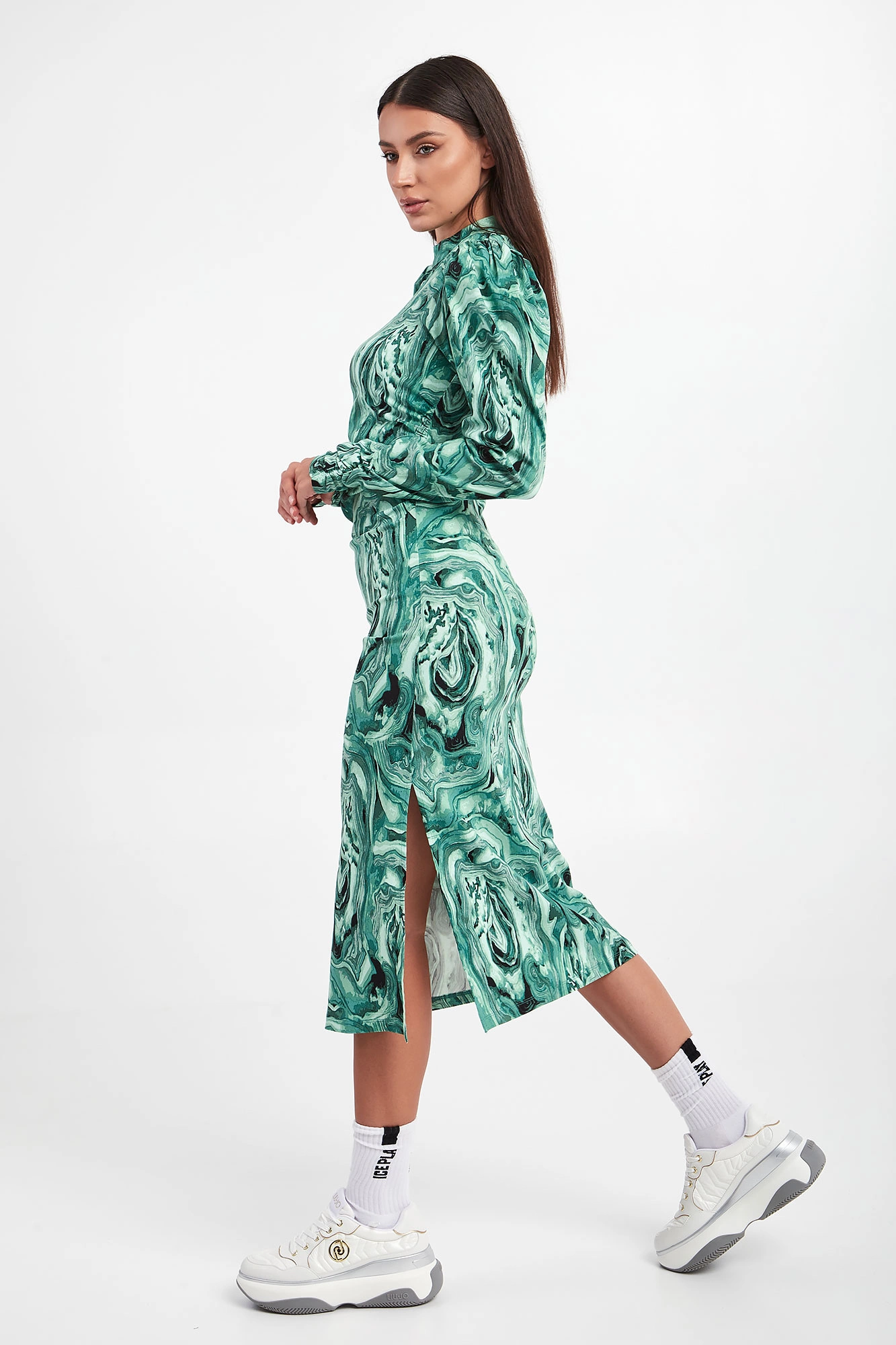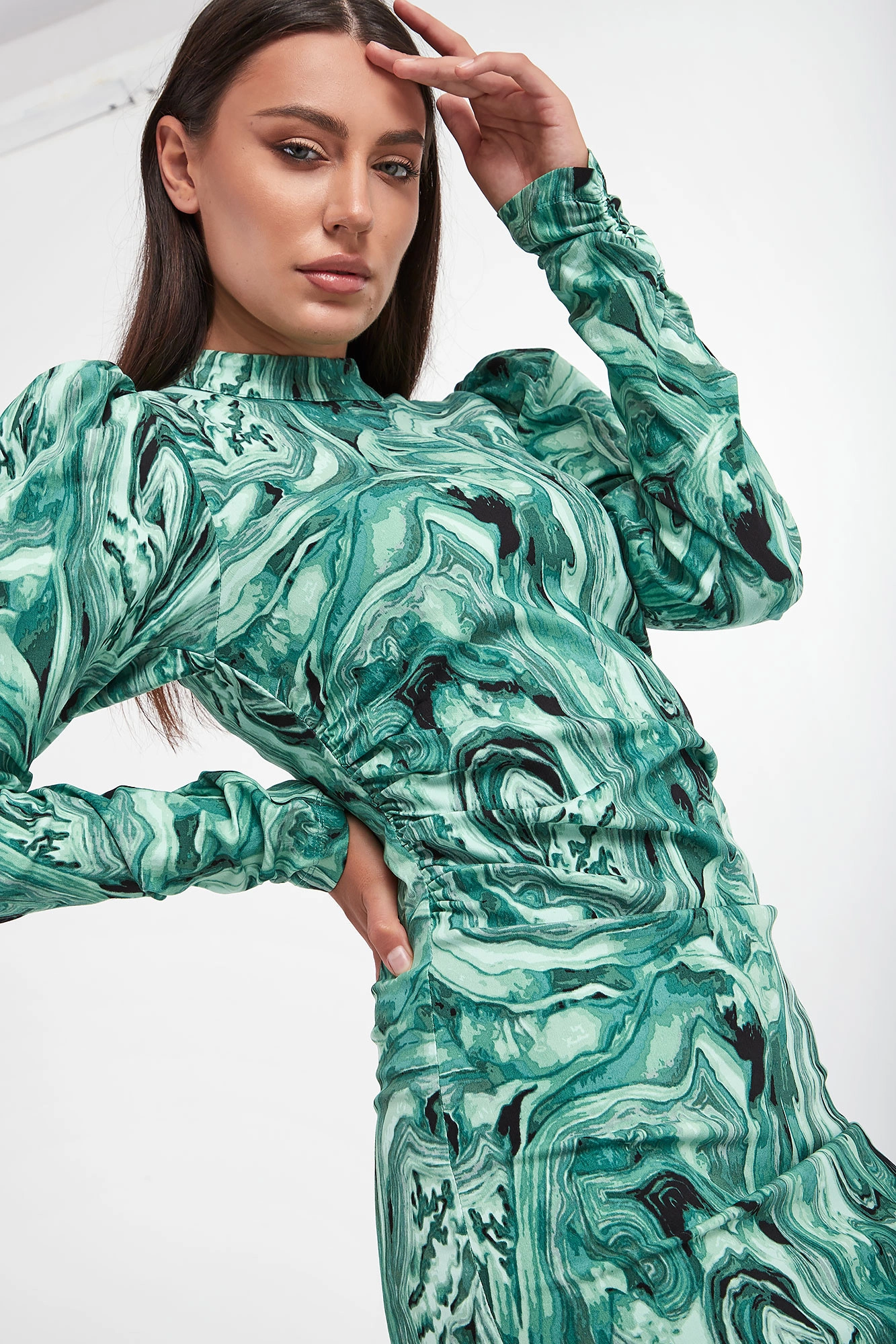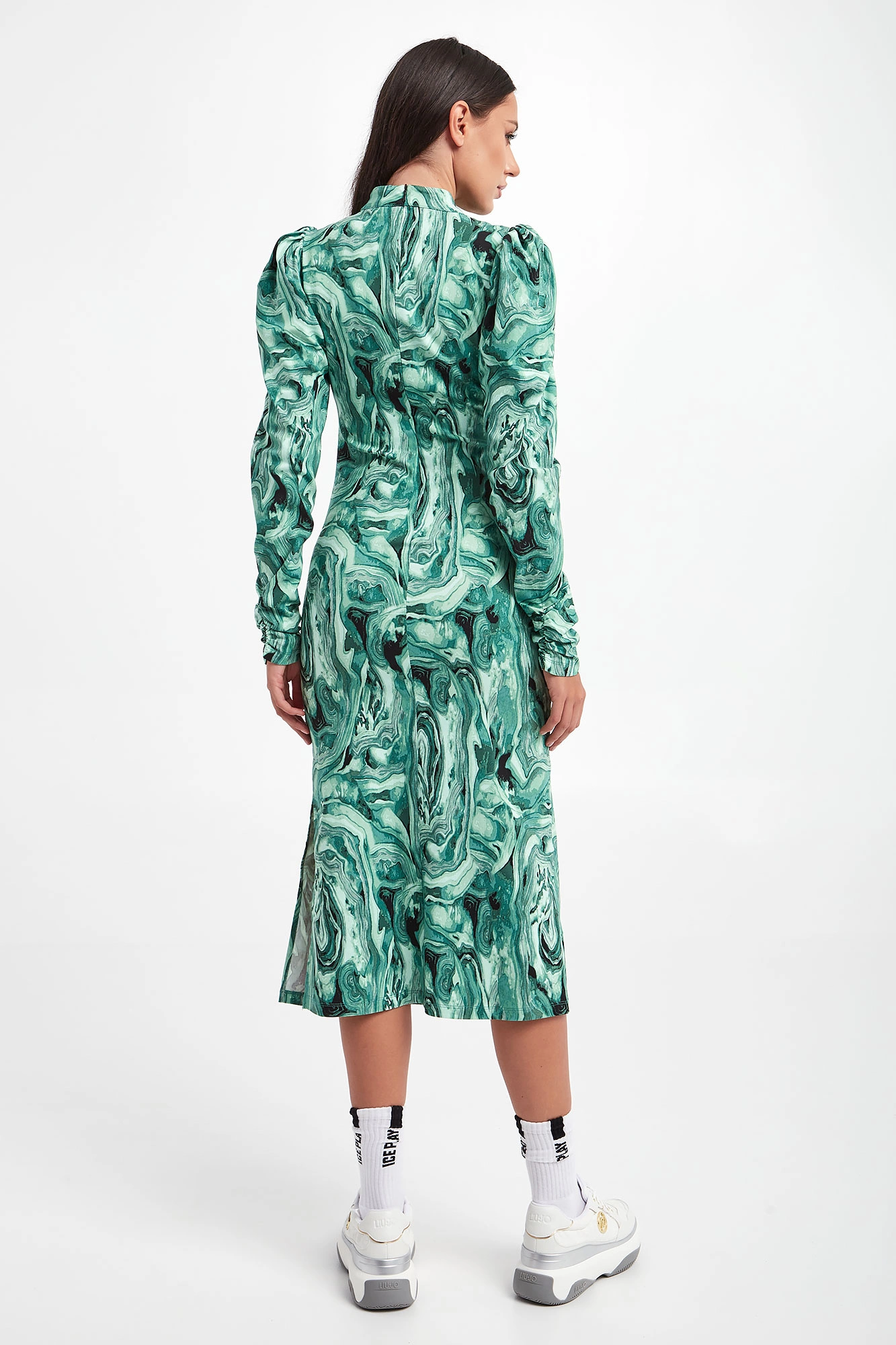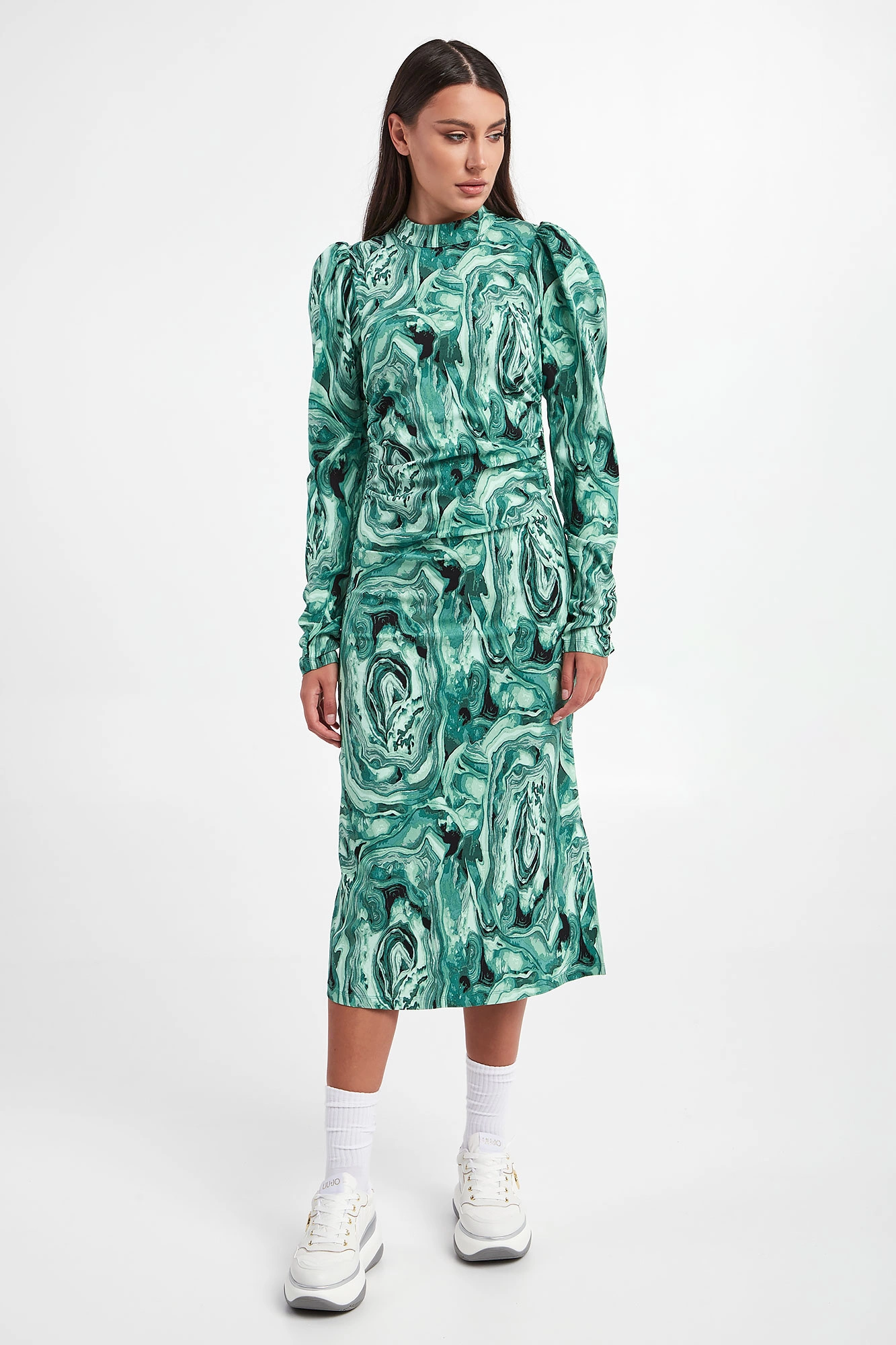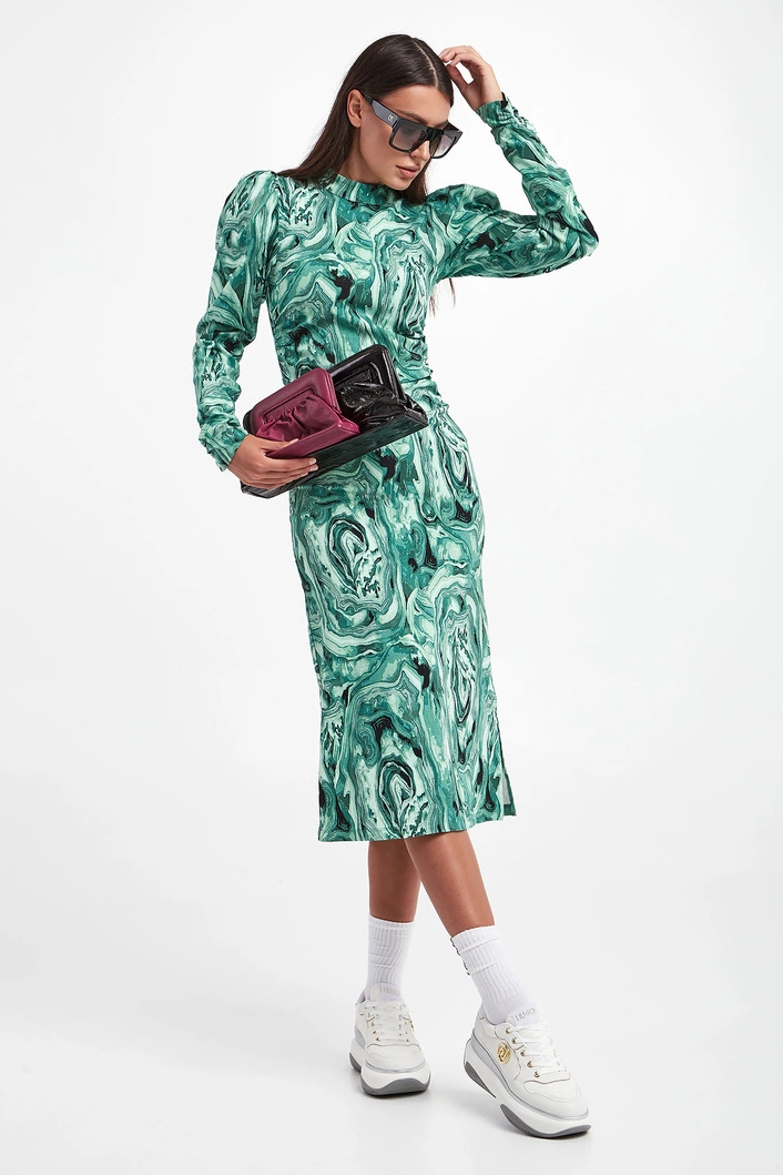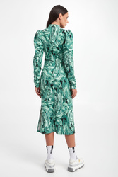 Sukienka marki Gestuz we wzory w odcieniach zieleni oraz czerni. Dekolt ze stójką. Na długich, bufiastych rękawach i po bokach marszczenia. Zapinana z tyłu za pomocą zamka. Po boku rozcięcie. Wiskoza w składzie pochodzi z włókien LENZING™ ECOVERO™, pozyskiwanych zgodnie z zasadą zrównoważonego rozwoju. Dopasowany fason slim fit, długość midi.