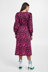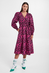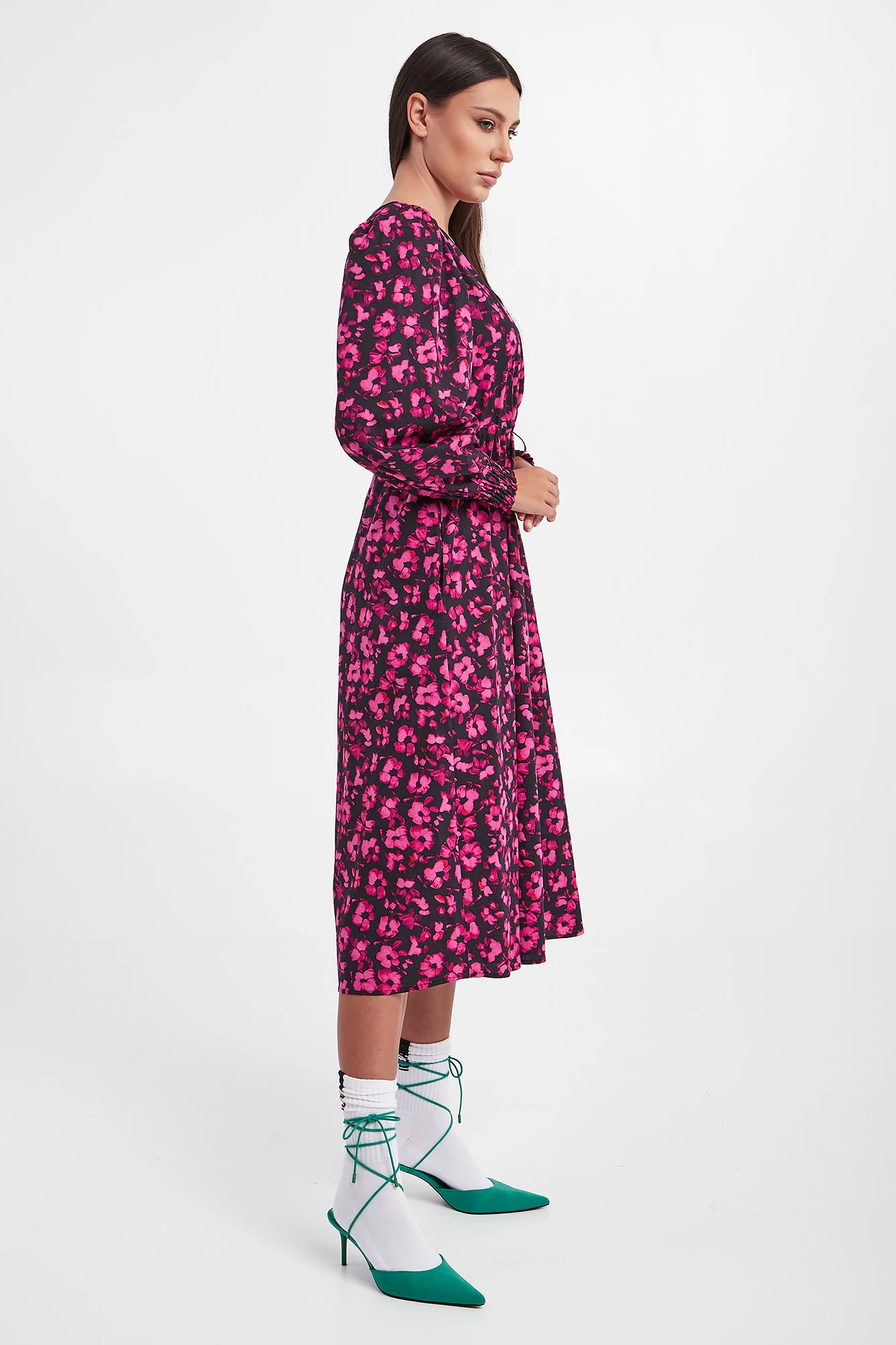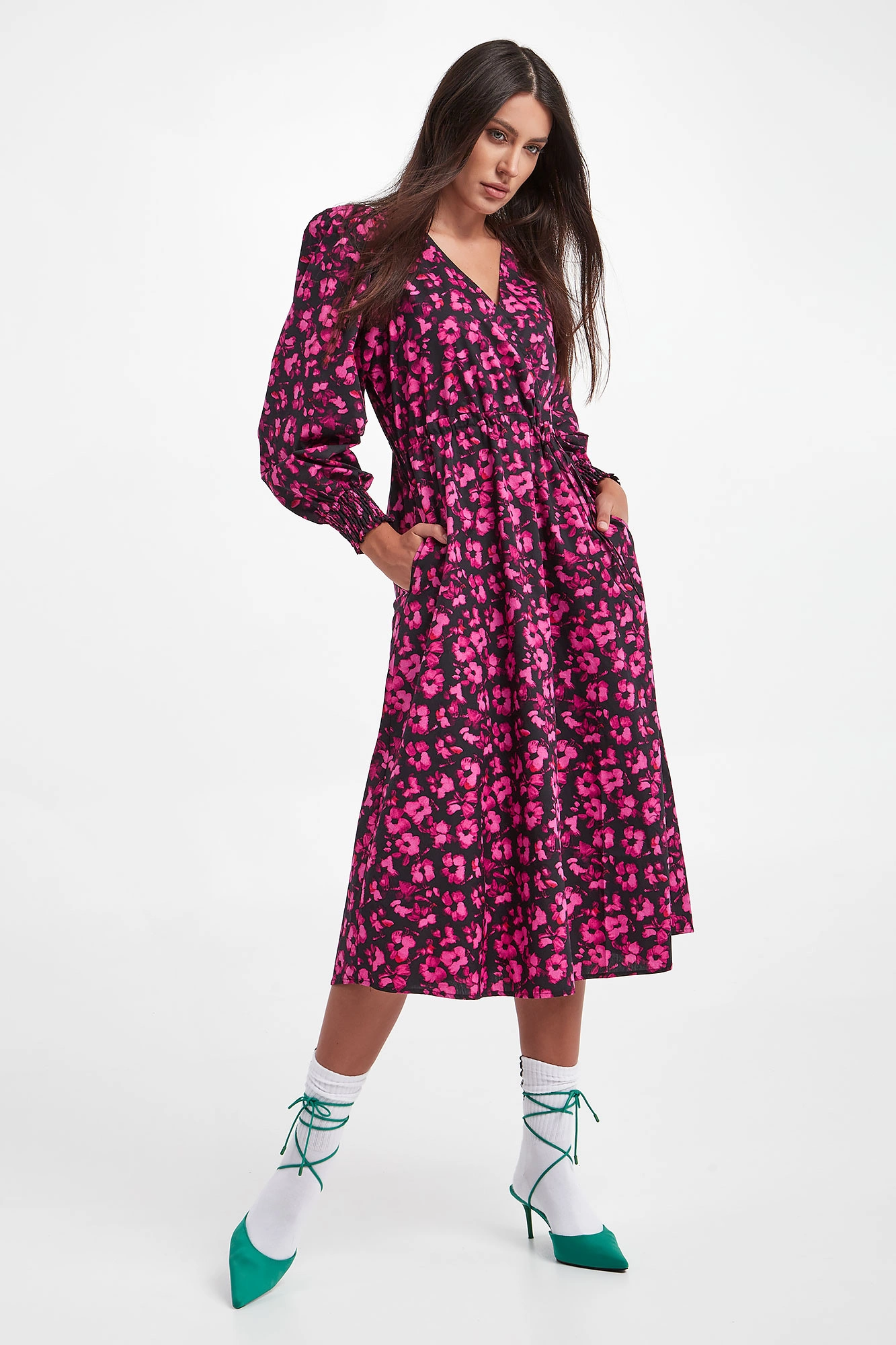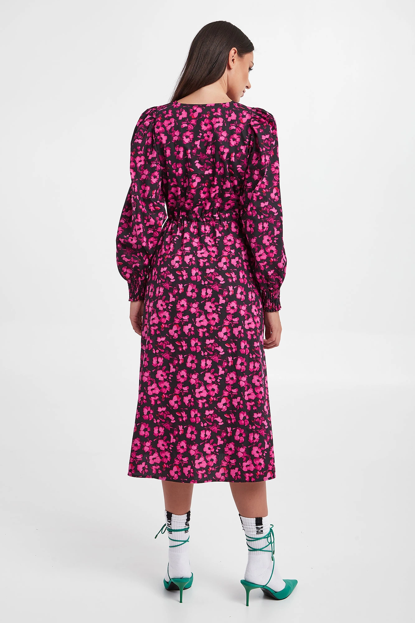 Sukienka marki Gestuz w czarnym kolorze. Na całości kwiatowy, fuksjowy wzór. Kopertowy dekolt. Pod nim ściągacz regulowany za pomocą troczków. Delikatnie bufiaste rękawy zakończone prążkowanymi ściągaczami. Dwie boczne kieszenie. Fason regular fit, długość midi. Wykonana z czystej bawełny pochodzącej z odpowiedzialnych upraw.