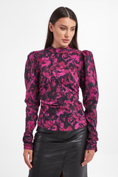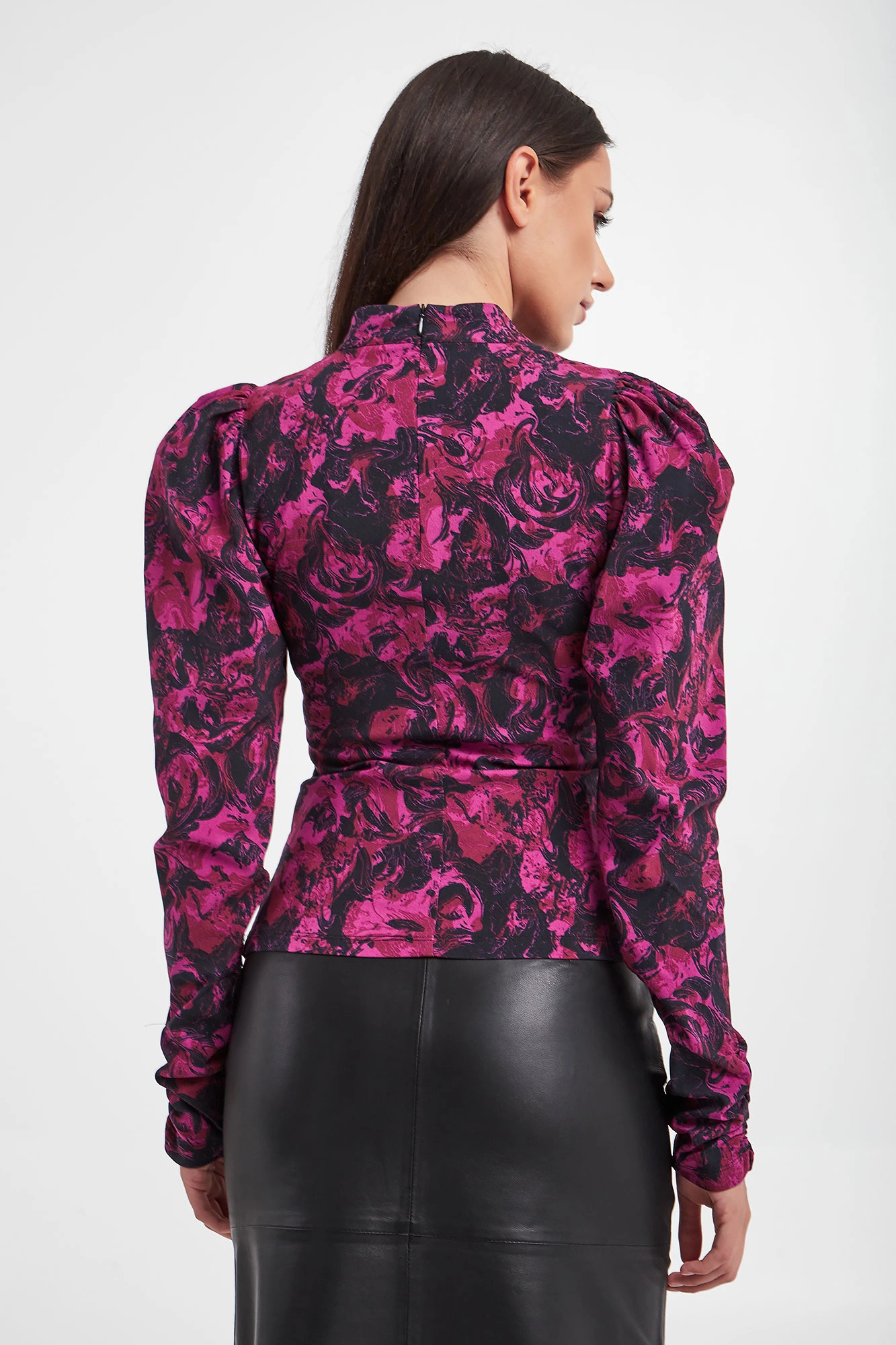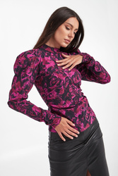 Bluzka marki GesTuz we wzory w odcieniach fuksji oraz czerni. Dekolt ze stójką. Na długich, bufiastych rękawach i po bokach marszczenia. Zapinana z tyłu za pomocą zamka. Wiskoza w składzie pochodzi z włókien LENZING™ ECOVERO™, pozyskiwanych zgodnie z zasadą zrównoważonego rozwoju. Dopasowany fason slim fit.