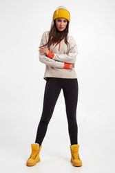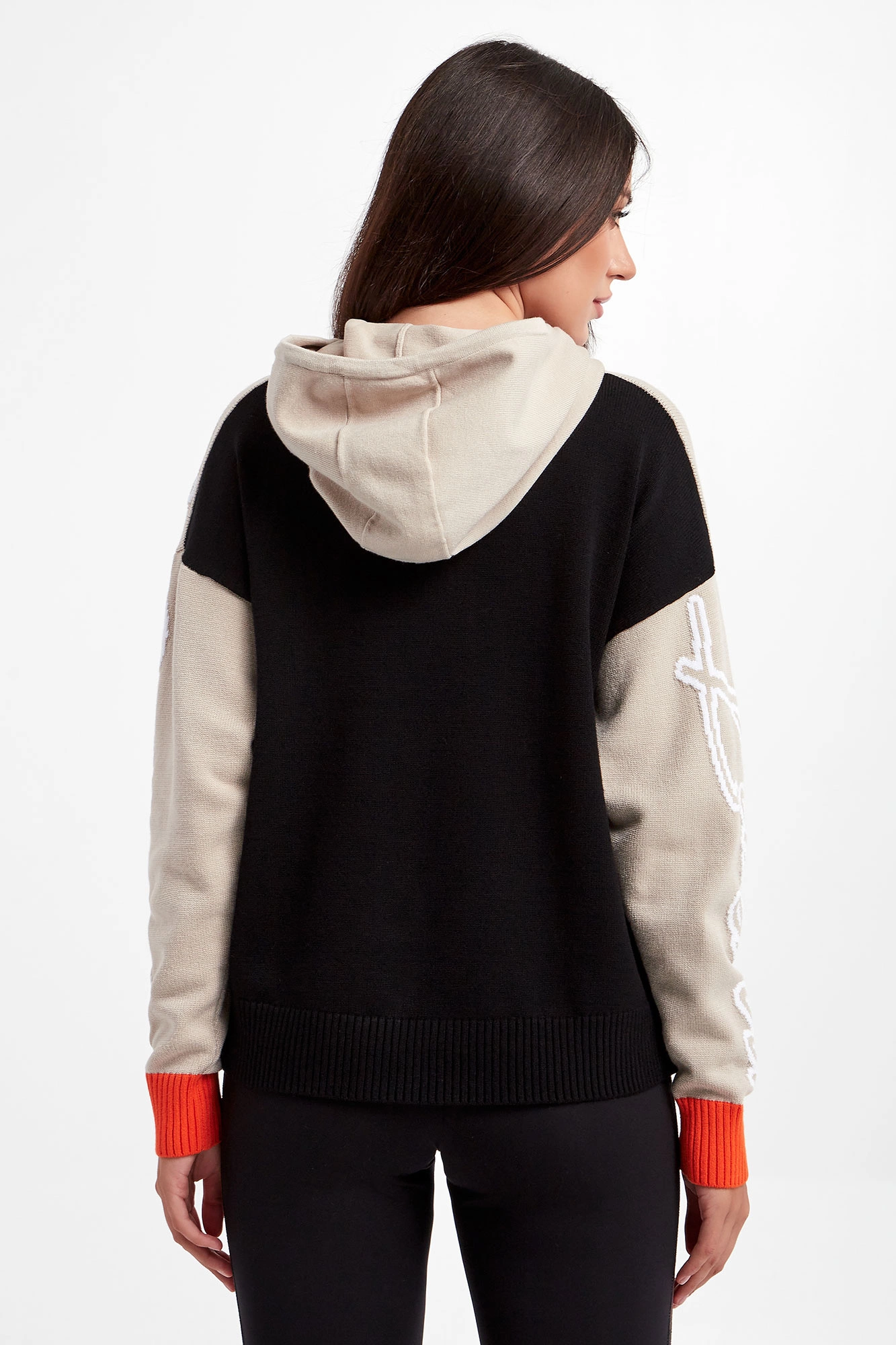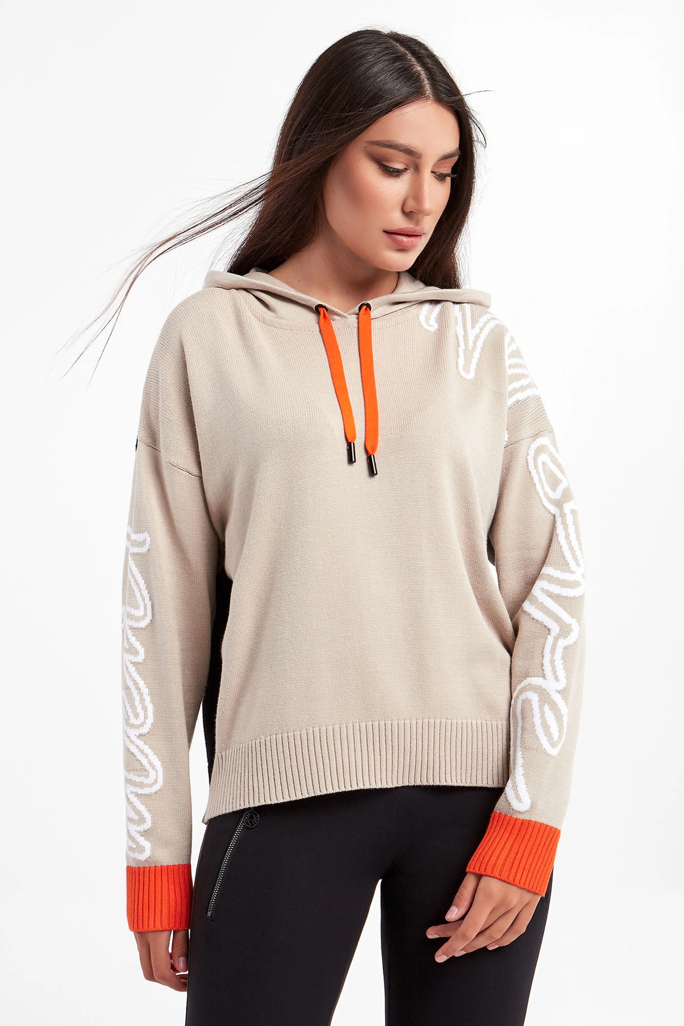 Sweter z kapturem marki Sportalm w beżowym kolorze. Na rękawach napisy w białym kolorze. Tył czarny. Przy kapturze troczki, w kontrastowym kolorze. Rękawy i dół wykończone ściągaczem prążkowanym. U dołu haft w postaci logo marki. Fason typu relaxed. Wiskoza w składzie pochodzi z włókien LENZING™ ECOVERO™, pozyskiwanych zgodnie z zasadą zrównoważonego rozwoju.