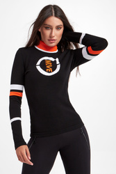 Sweter marki Sportalm w czarnym kolorze. Z półgolfem. Na całości biało-pomarańczowy nadruk. Długie rękawy i dół wykończony zawinięciem. Z tyłu haft w postaci logo marki w srebrnym kolorze. Fason typu slim. Wykonany z elastycznej wiskozy, która pochodzi z włókien LENZING™ ECOVERO™, pozyskiwanych zgodnie z zasadą zrównoważonego rozwoju.