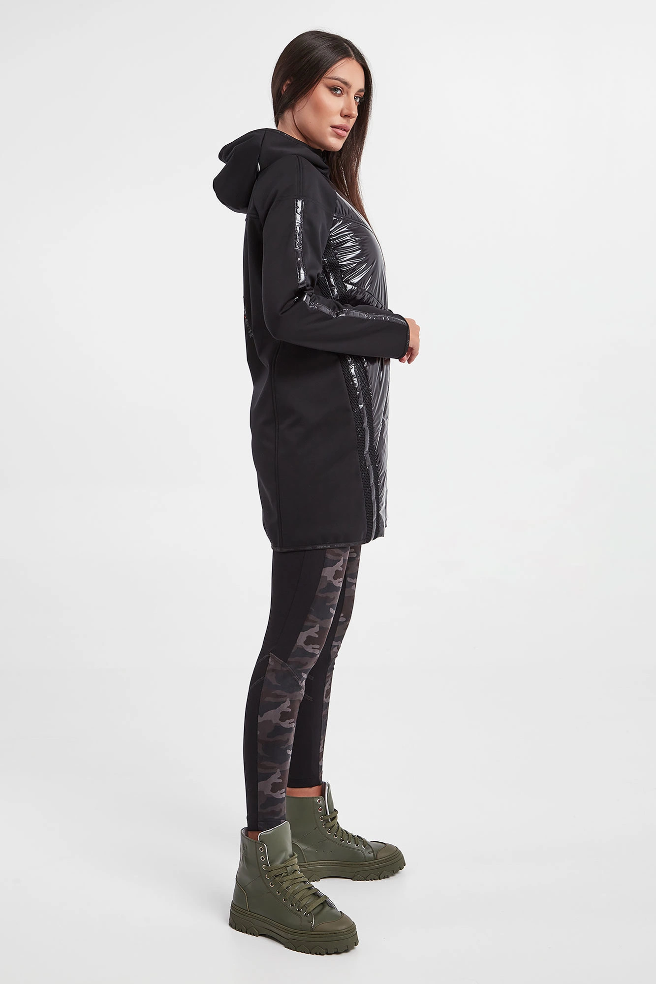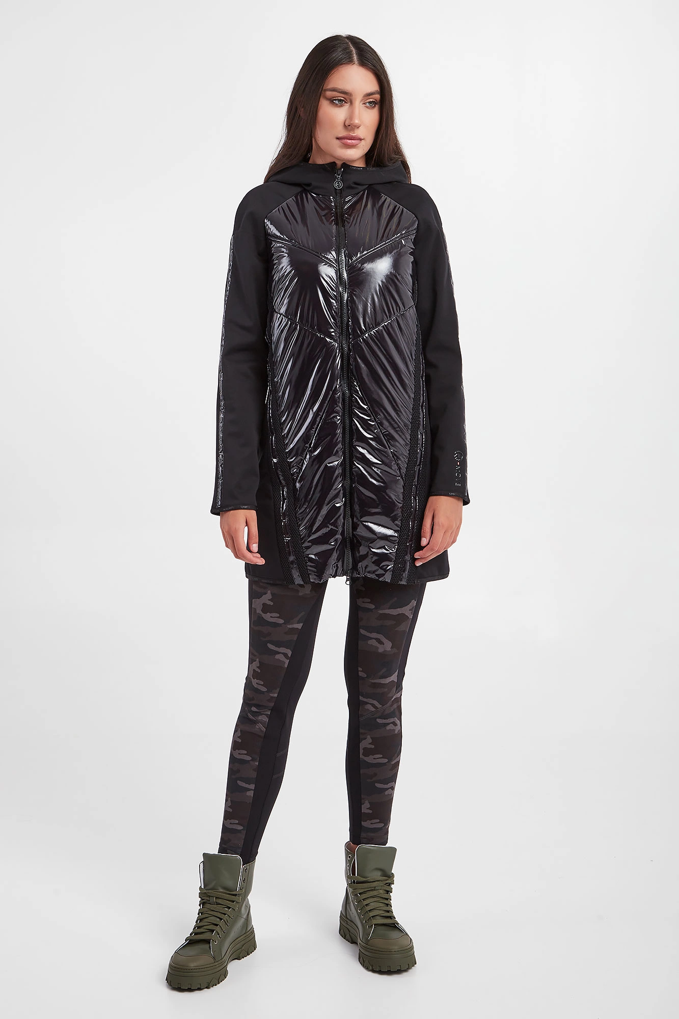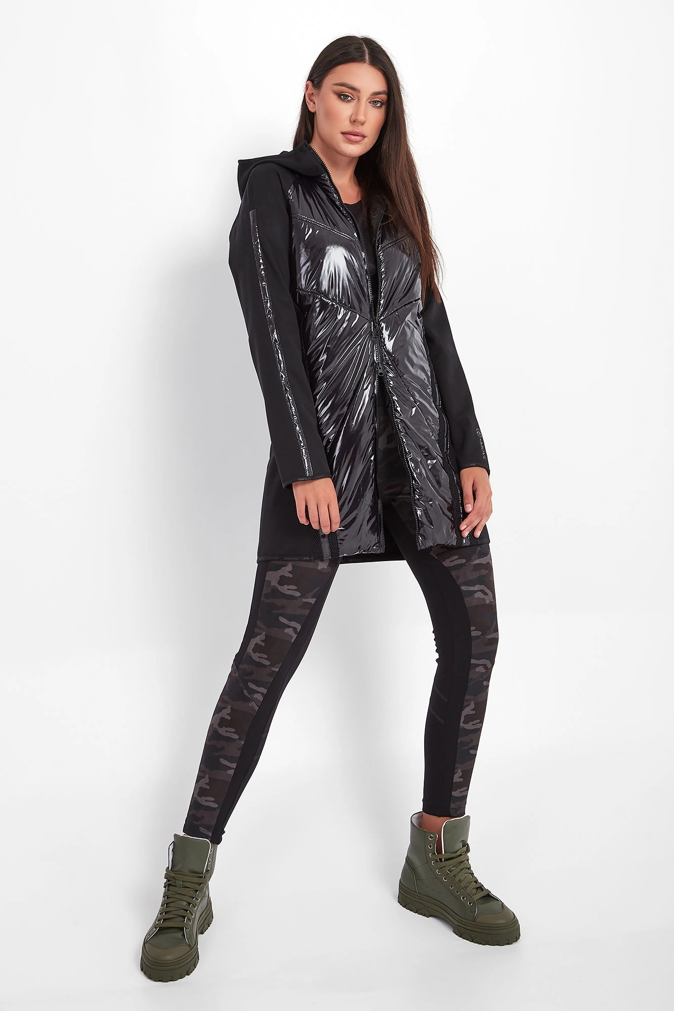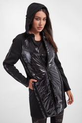 Płaszcz marki Sportalm w czarnym kolorze. Z kapturem. Na froncie pikowanie z połyskującego materiału oraz wstawki z siatki. Zapinany za pomocą dwustronnego zamka z logowaną zawieszką. Dwie boczne, zamykane kieszenie. Na długich rękawach lakierowane lampasy. Z tyłu nadruk z logo. Fason regular.