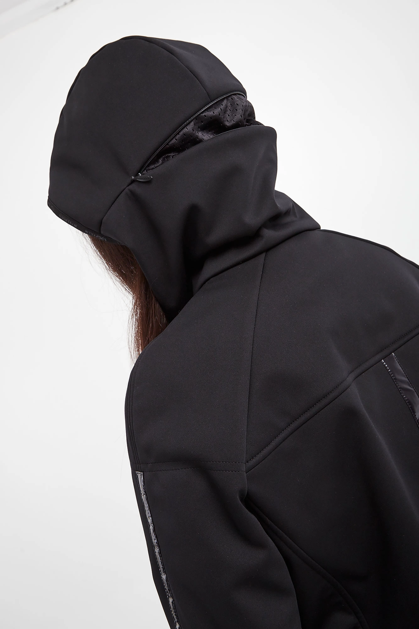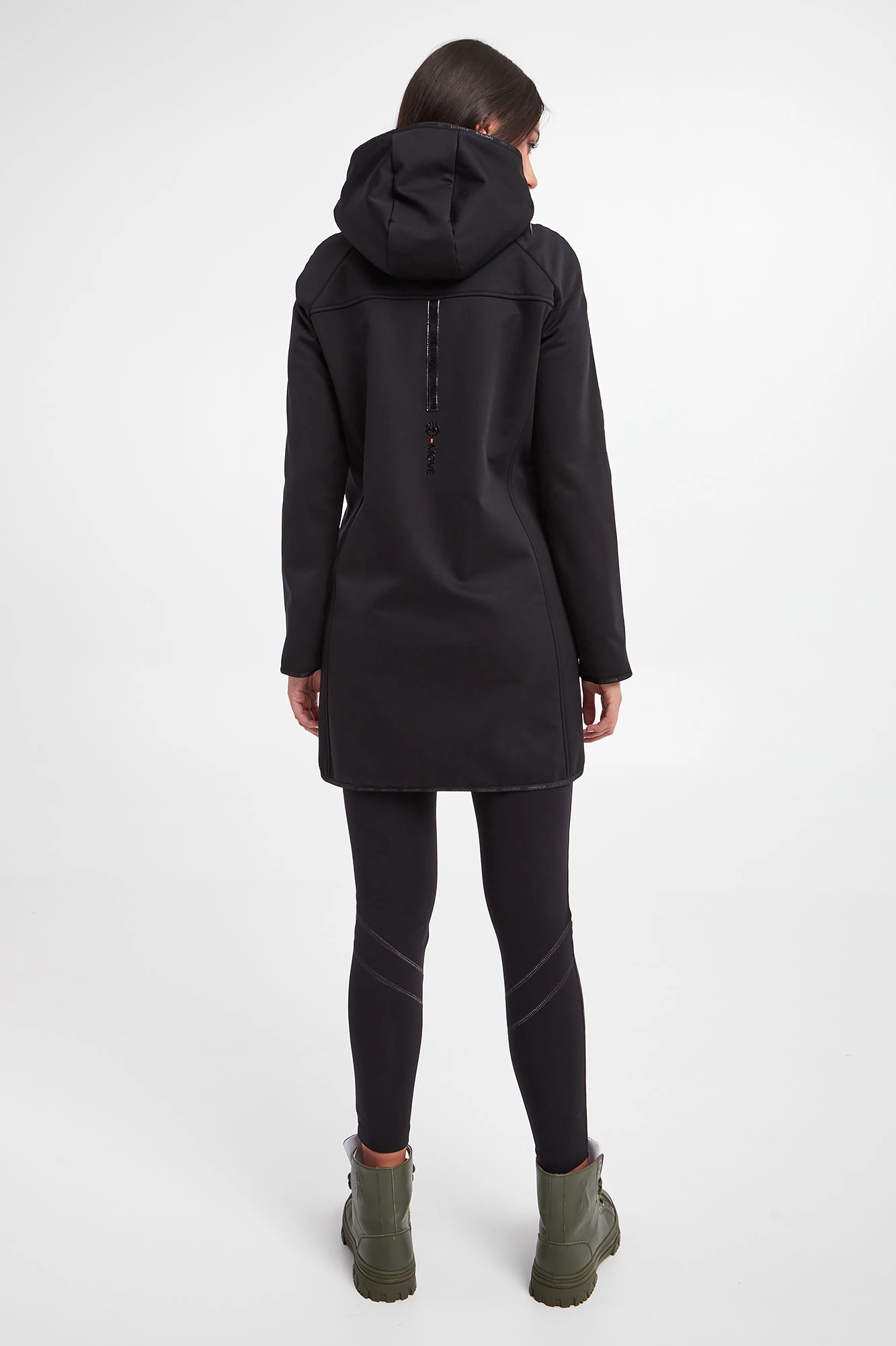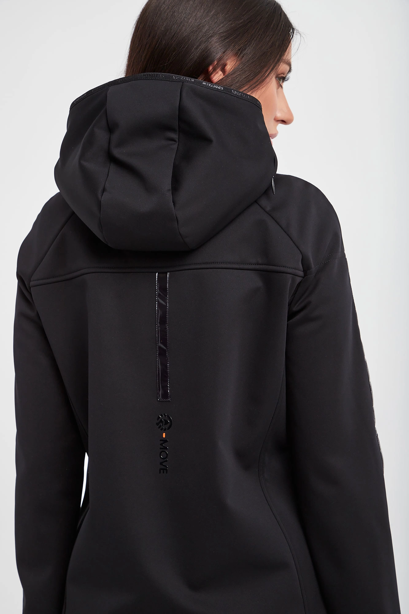 Płaszcz marki Sportalm w czarnym kolorze. Z kapturem. Na froncie pikowanie z połyskującego materiału oraz wstawki z siatki. Zapinany za pomocą dwustronnego zamka z logowaną zawieszką. Dwie boczne, zamykane kieszenie. Na długich rękawach lakierowane lampasy. Z tyłu nadruk z logo. Fason regular.
