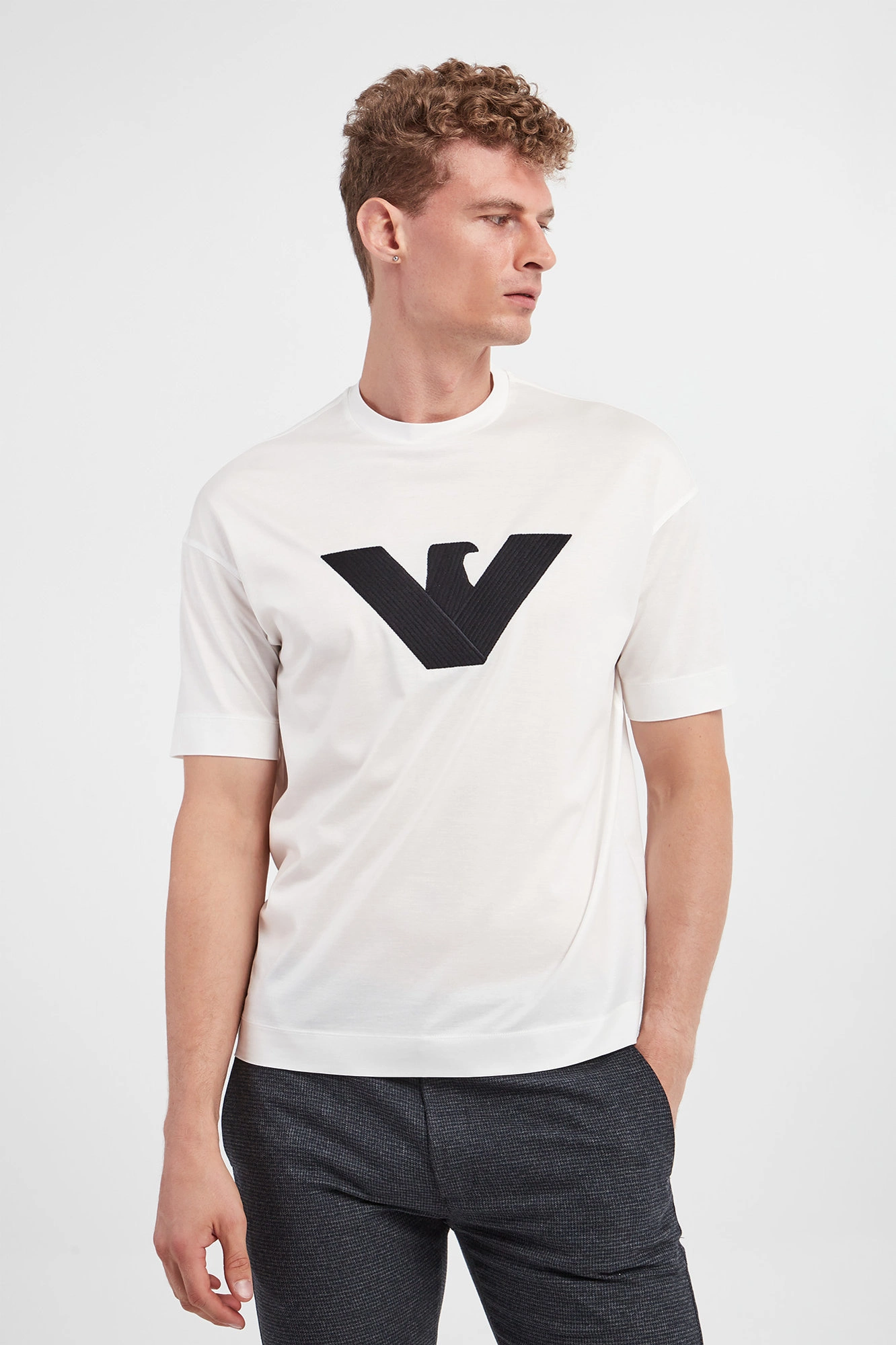 T-shirt marki Emporio Armani w kolorze złamanej bieli. Na froncie czarne, kontrastujące logo marki. Dekolt typu o-neck zakończony ściągaczem. Krótkie rękawy i dół wykończone lamówką. Fason typu regular. Wykonany z bawełnianej, merceryzowanej tkaniny.