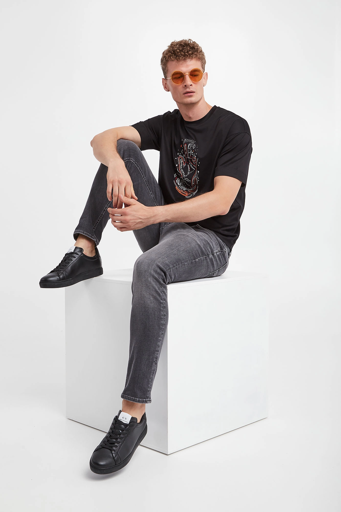 T-shirt marki Emporio Armani w czarnym kolorze. Na froncie kolorowe hafty i nadruki. Dekolt typu o-neck wykończony elastycznym ściągaczem. Rękawy i dół zakończone lamówką. Fason typu relaxed. Wykonany z przyjemnej w dotyku mieszanki bawełny oraz lyocellu.