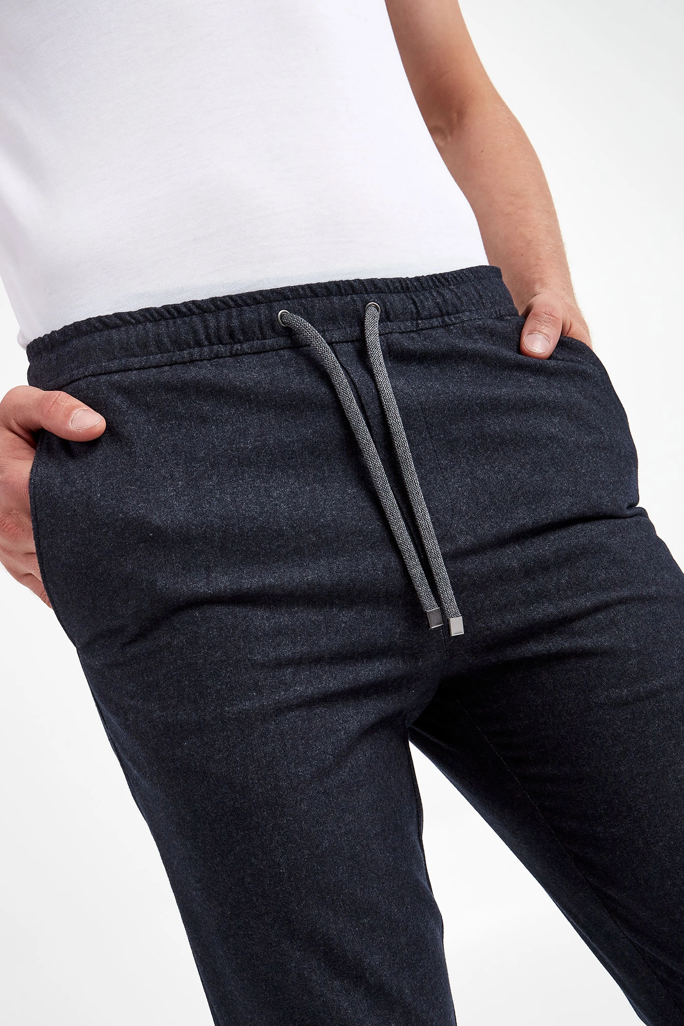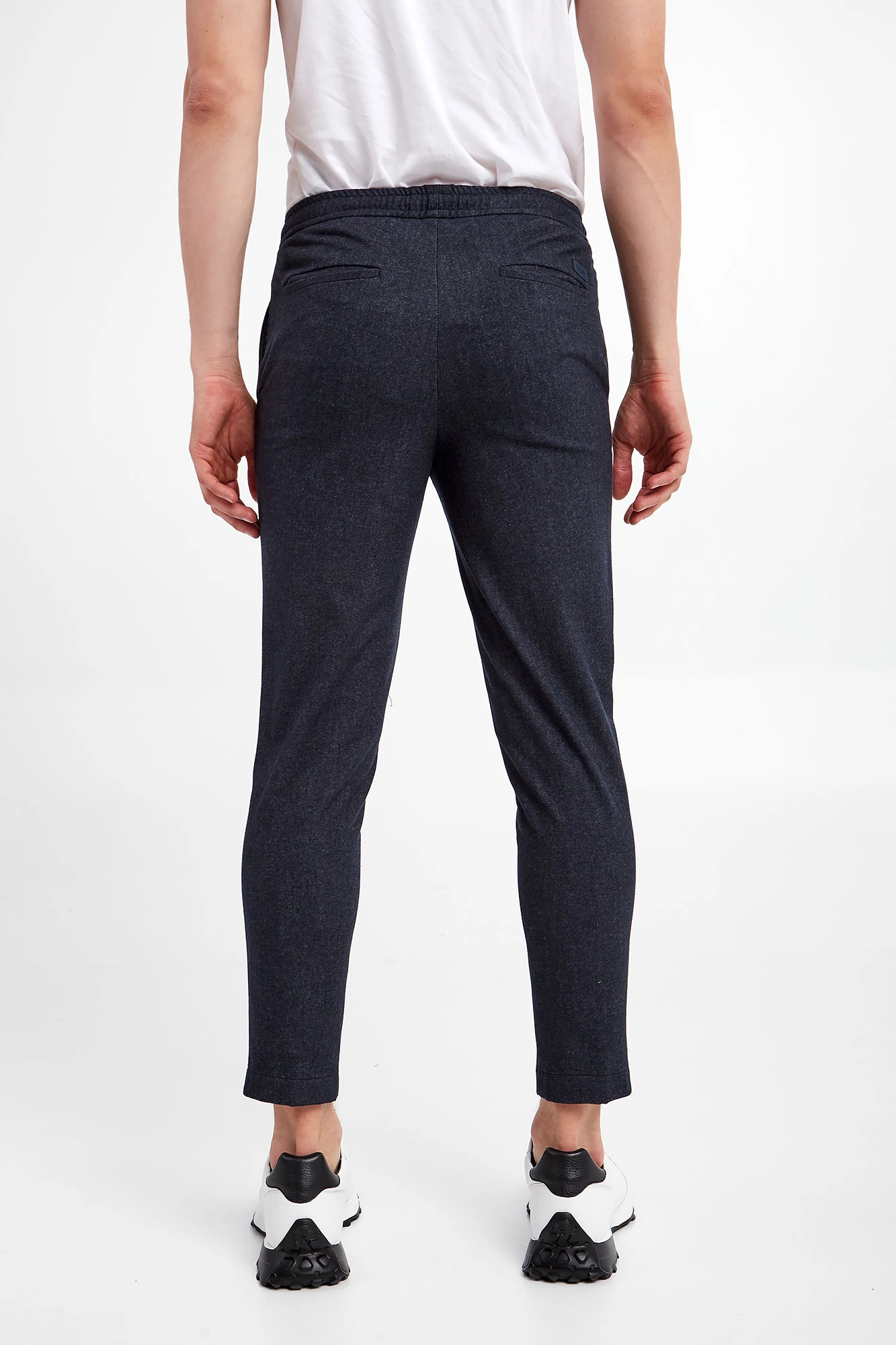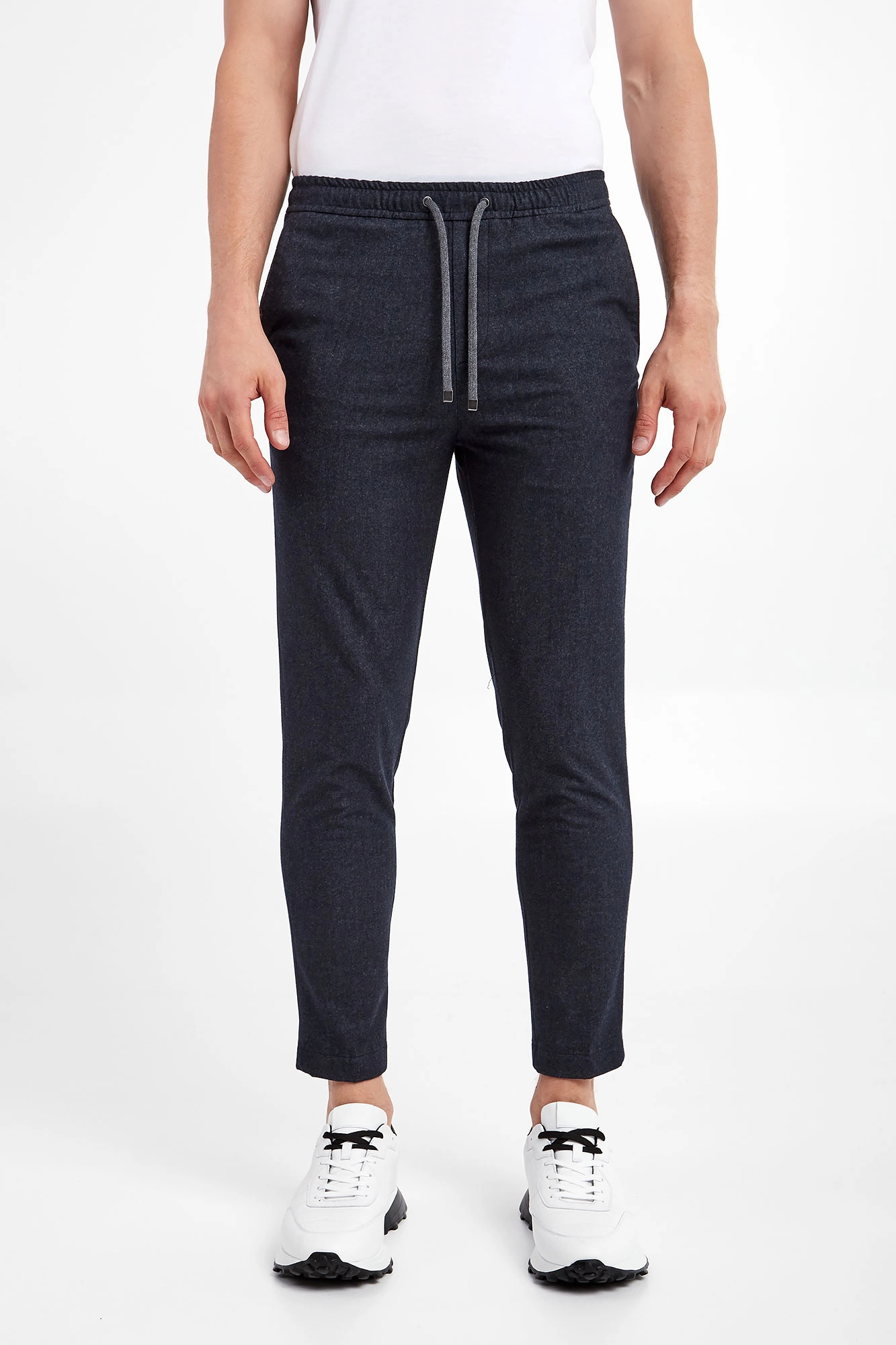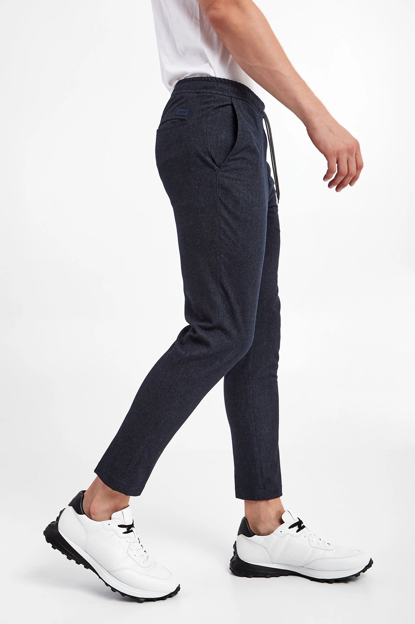 Spodnie marki Joop! w granatowym kolorze. W pasie ściągacz regulowany za pomocą troczków. Model z czterema wpuszczanymi kieszeniami. Nogawki zakończone lamówką. Fason typu loose. Wykonane z przyjemnej w dotyku tkaniny.
