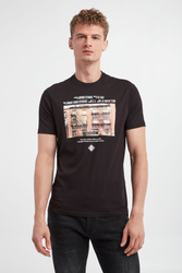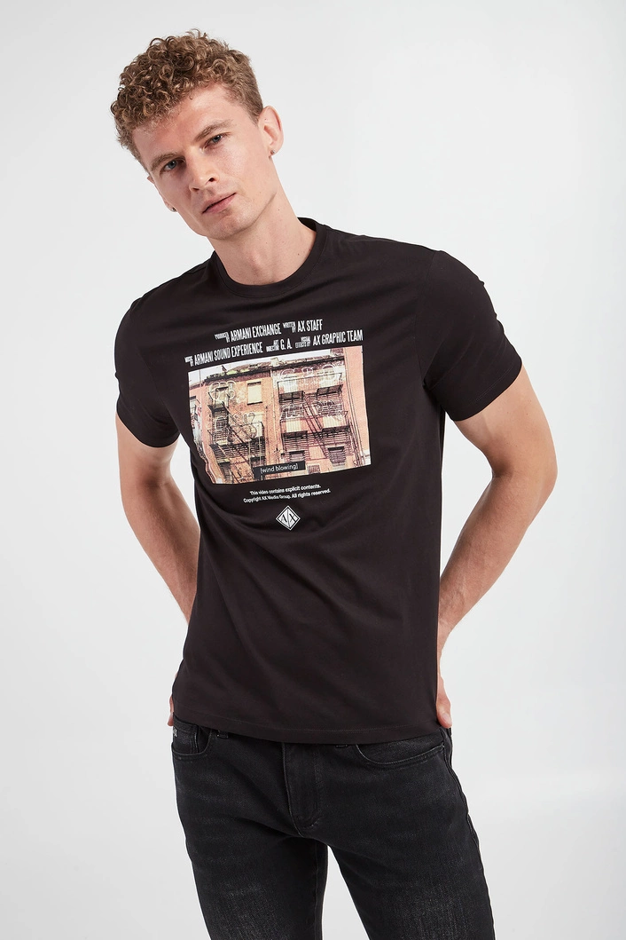 T-shirt marki Armani Exchange w czarnym kolorze. Na froncie kolorowy nadruk oraz białe napisy z nazwą marki. Dekolt typu o-neck zakończony ściągaczem. Krótkie rękawy i dół wykończone lamówką. Fason typu regular. Wykonany ze stuprocentowej bawełny.