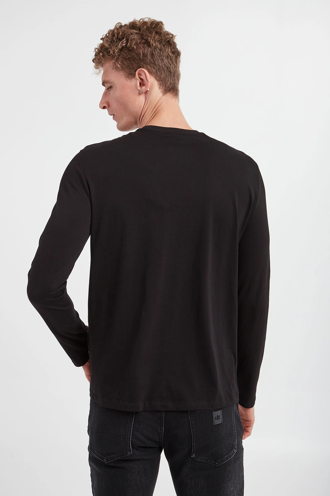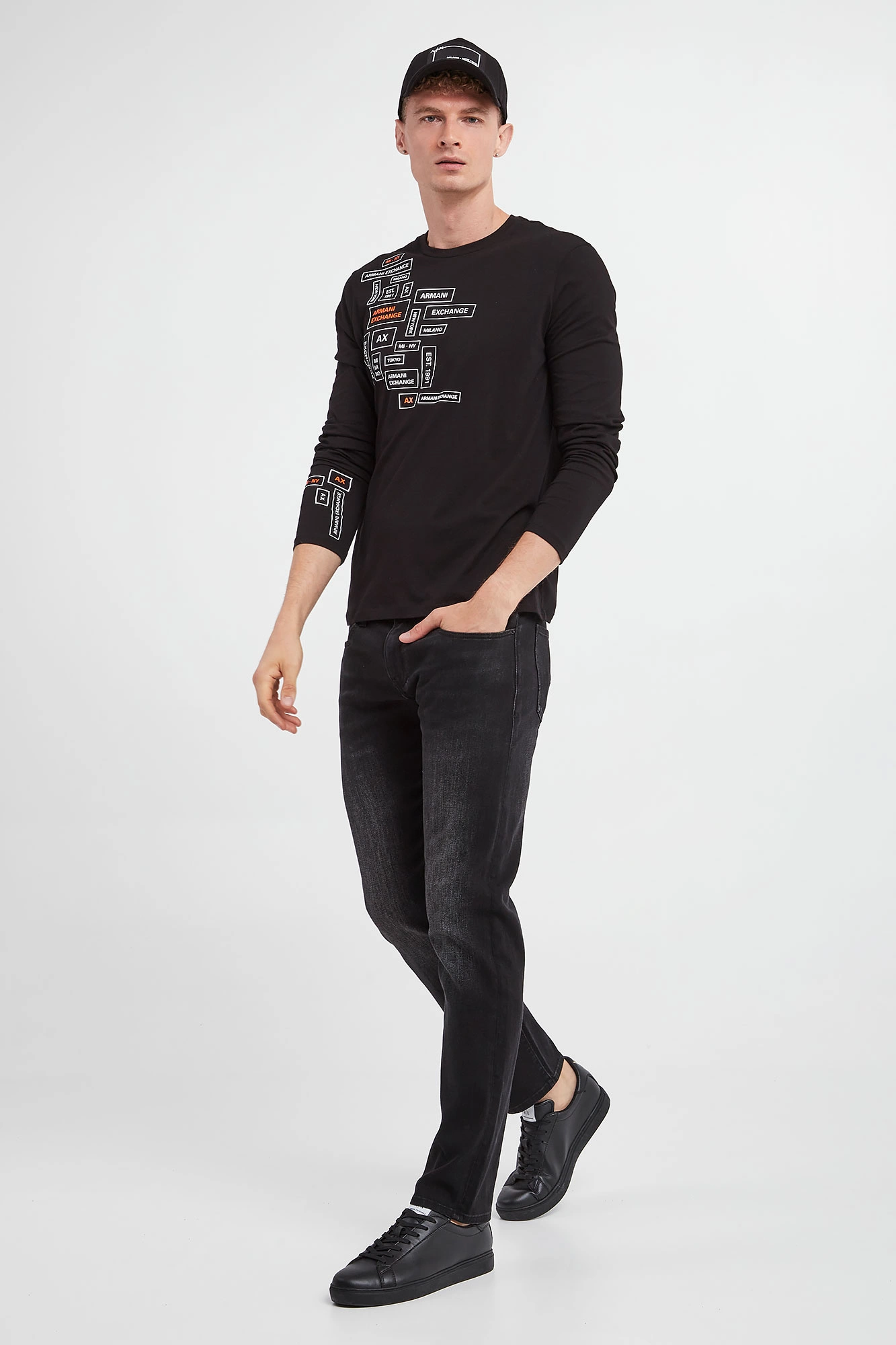 Longsleeve marki Armani Exchange w czarnym kolorze. Na froncie gumowane, biało-pomarańczowe nadruki z logo. Dekolt typu o-neck zakończony ściągaczem. Rękawy i dół wykończone lamówką. Fason typu slim. Wykonany ze stuprocentowej bawełny.