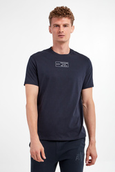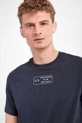 Bawełniany T-shirt marki Armani Exchange w granatowym kolorze. Na froncie nadruk z nazwą marki w kontrastowym kolorze. Dekolt o-neck wykończony elastycznym ściągaczem. Fason typu regular.