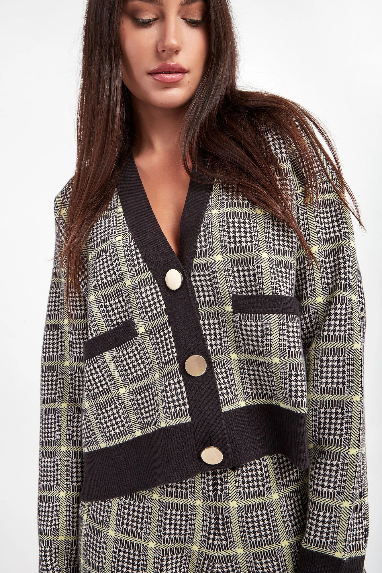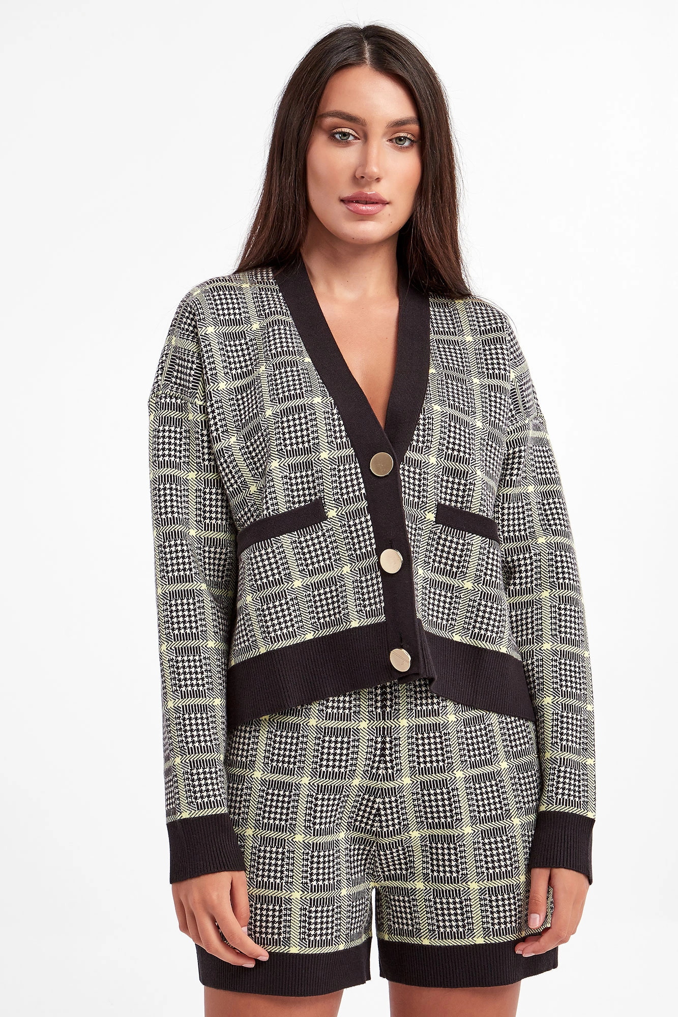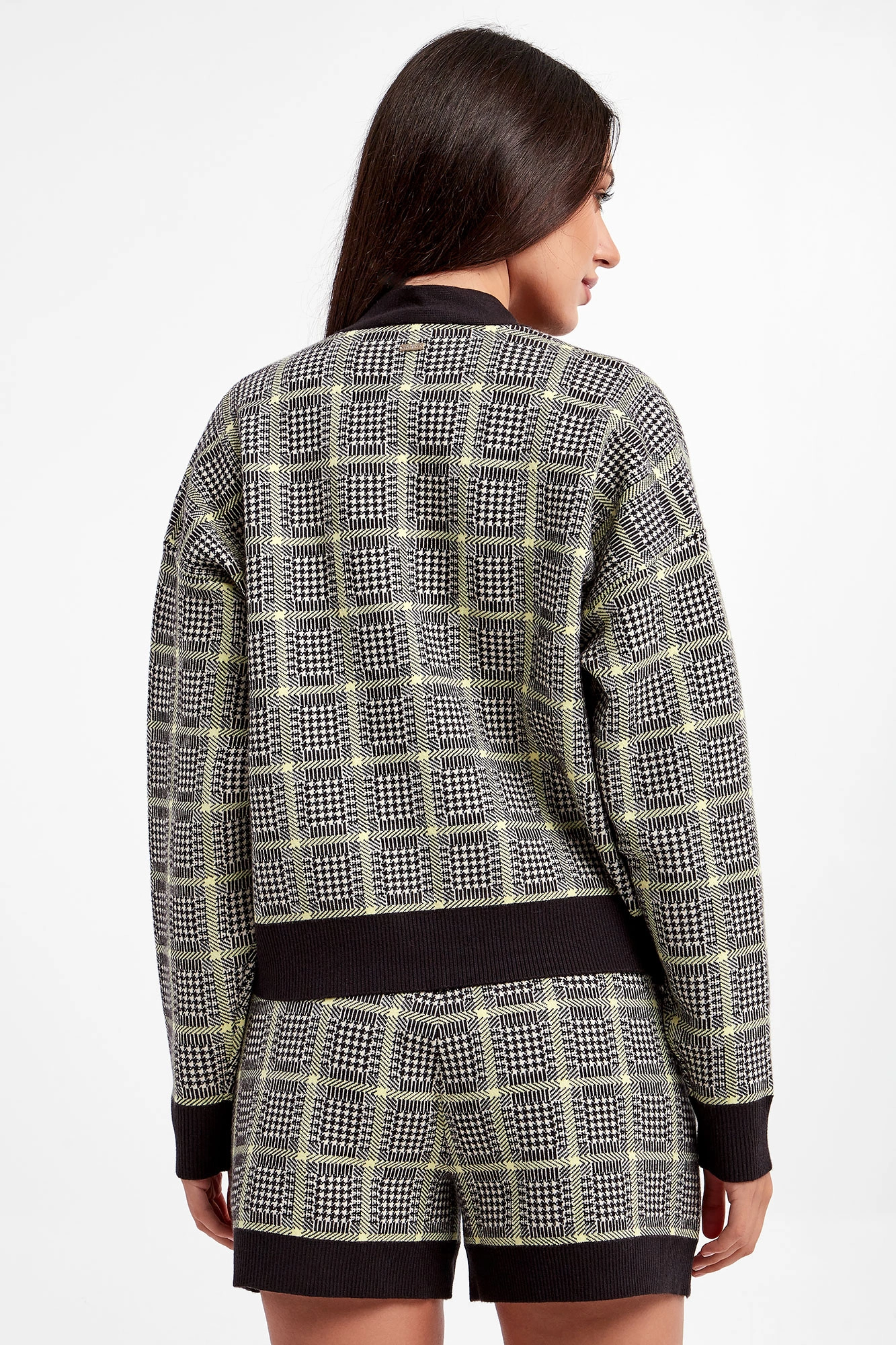 Dzianinowy kardigan marki Armani Exchange w biało-czarnym kolorze. Na całości krata glencheck przeplata się z limonkowymi paskami. Zapinany za pomocą złotych guzików. Dekolt typu v-neck, rękawy i dół wykończone czarnymi ściągaczami. Dwie boczne, naszywane kieszenie. Obniżona linia ramion. Fason typu relaxed.