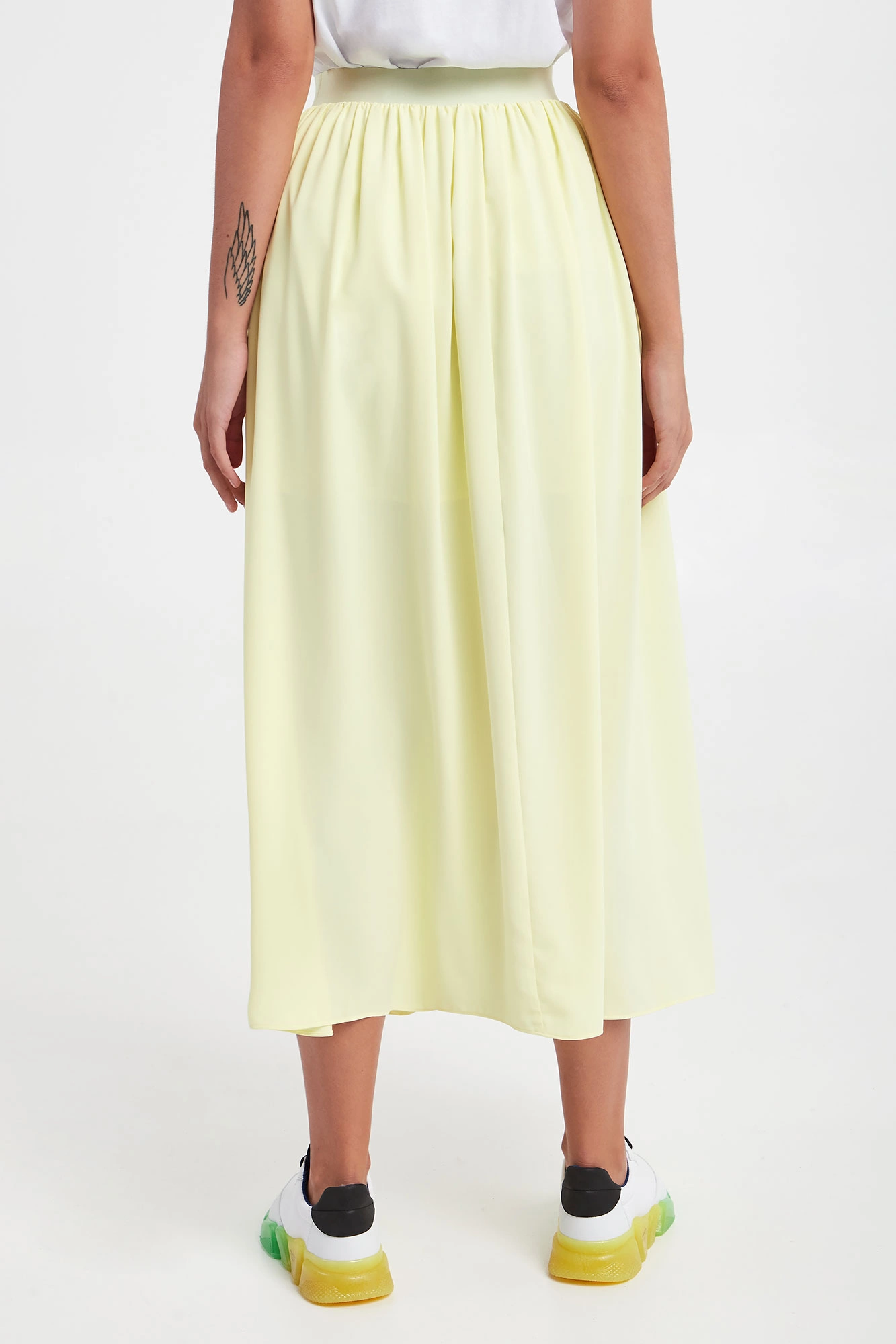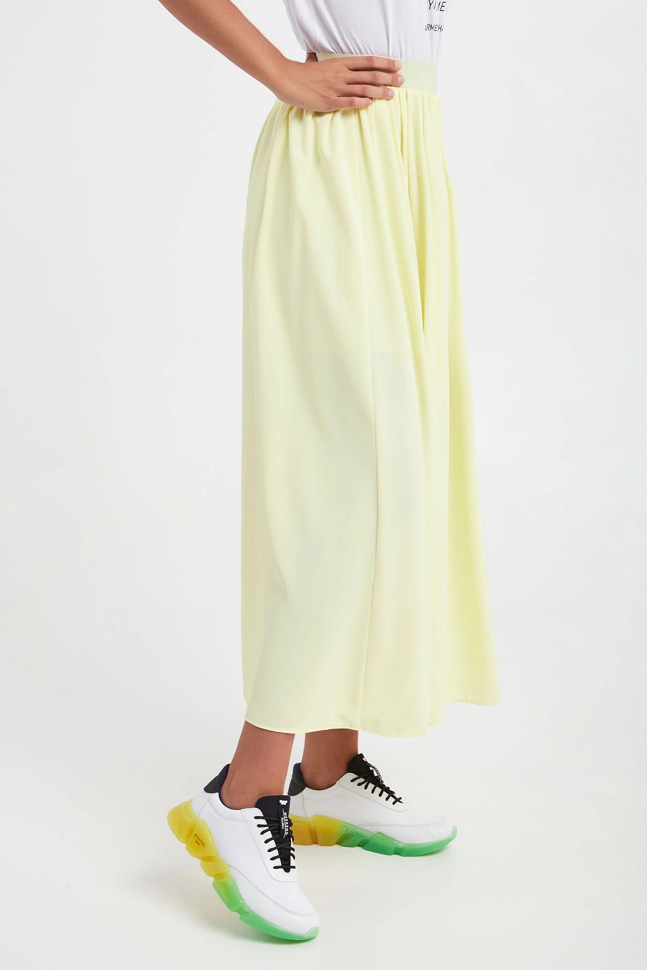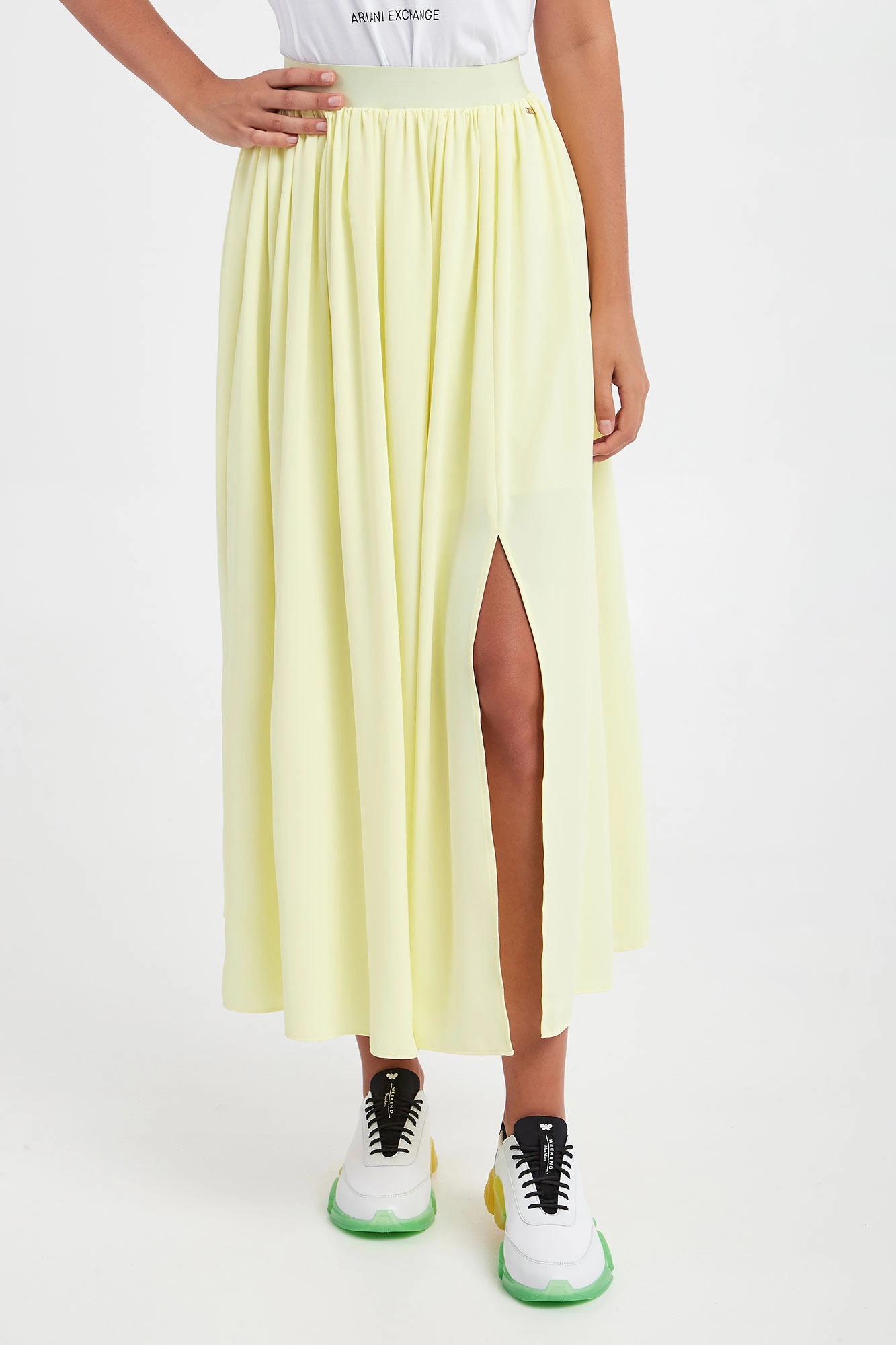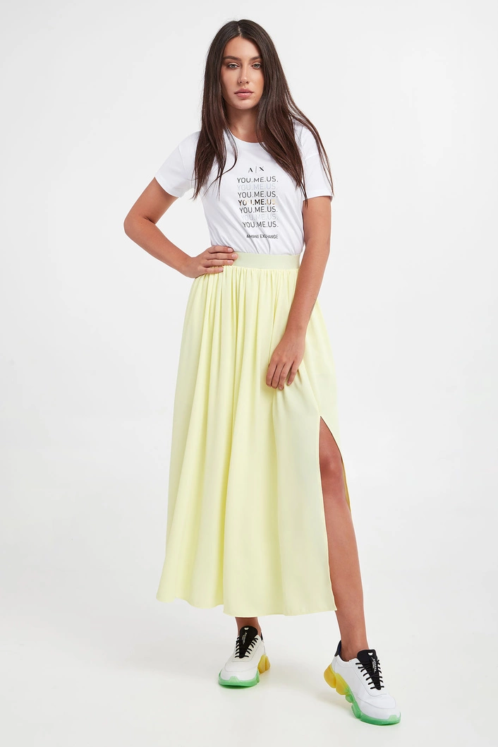 Spódnica marki Armani Exchange w pastelowym, cytrynowym kolorze. Fason regular, długość midi. W pasie elastyczny ściągacz. Pod nim marszczenie. Z boku logowana, srebrna naszywka. Rozcięcie na nogę. Lekka i zwiewna.