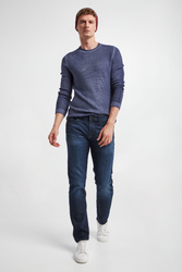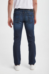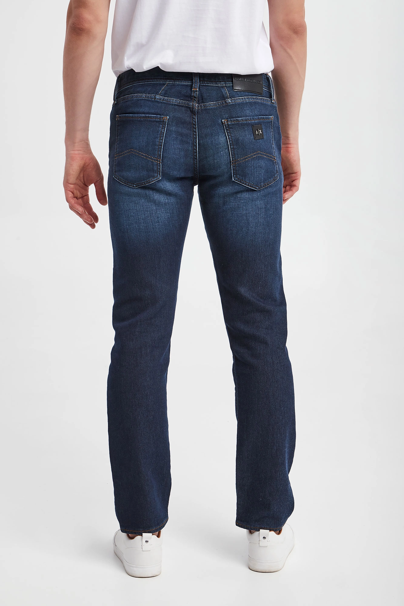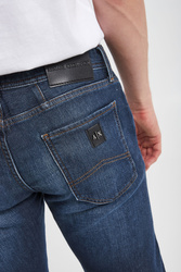 Jeansy marki Armani Exchange w granatowym kolorze. Fason typu slim. Zapinane za pomocą zamka oraz sygnowanego guzika. Model z pięcioma kieszeniami. Z boku haft z logo. W pasie szlufki. Z tyłu sygnowane naszywki. Nogawki wykończone lamówką. Wykonane z bawełnianej tkaniny z dodatkiem elastycznych włókien.