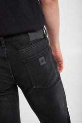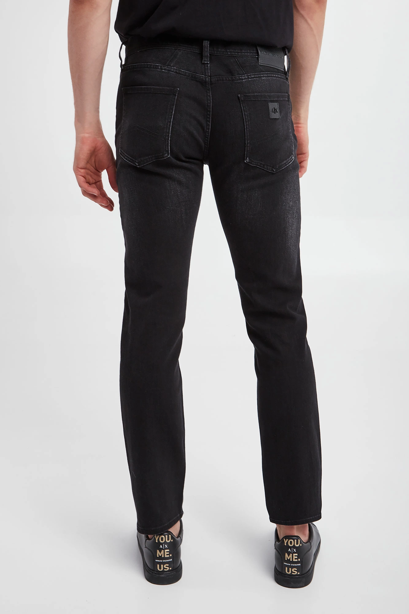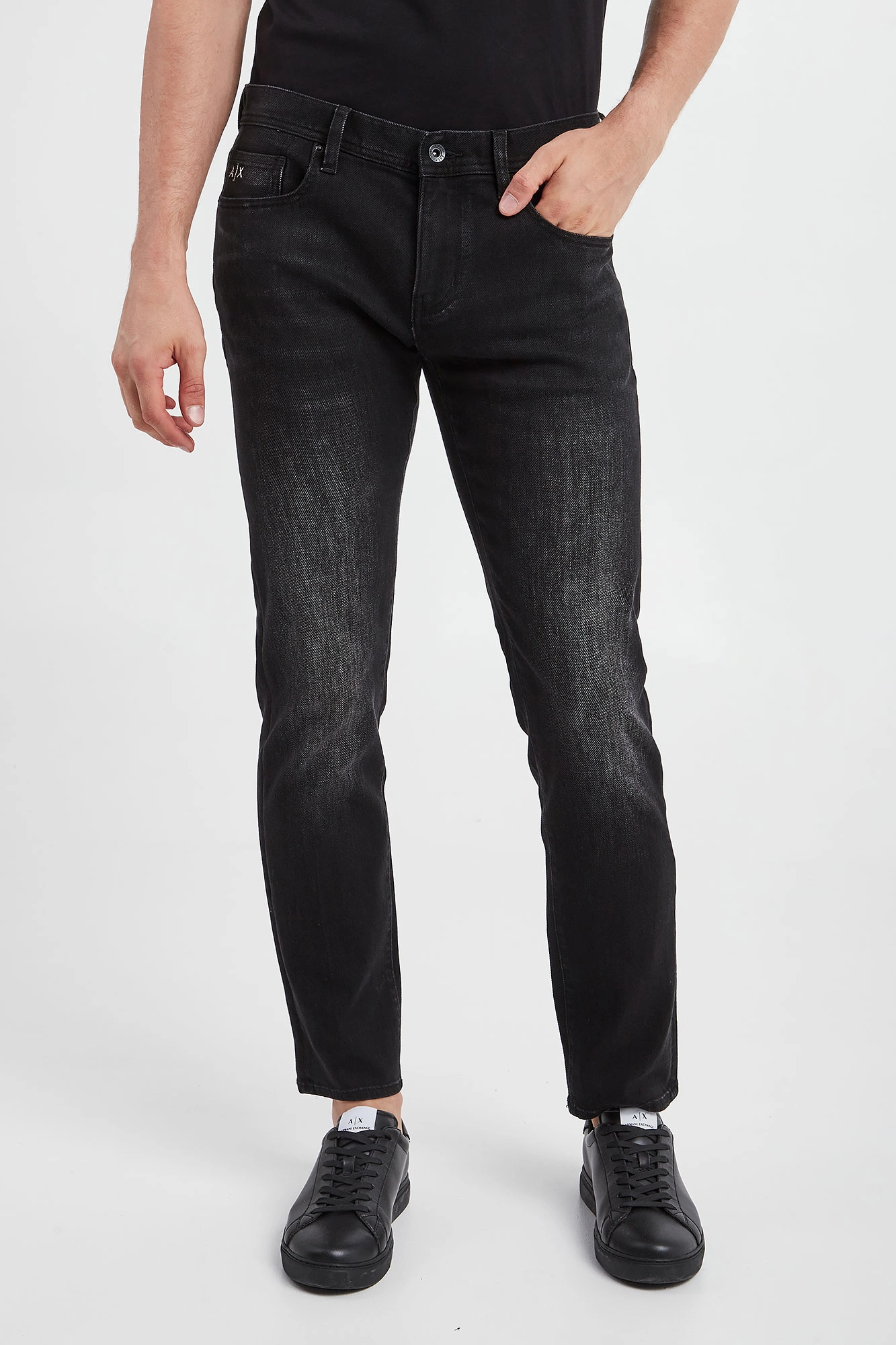 Jeansy marki Armani Exchange w czarnym kolorze. Fason typu slim. Zapinane za pomocą zamka oraz sygnowanego guzika. Model z pięcioma kieszeniami. Z boku haft z logo. W pasie szlufki. Z tyłu sygnowane naszywki. Nogawki wykończone lamówką. Wykonane z bawełnianej tkaniny z dodatkiem elastycznych włókien.