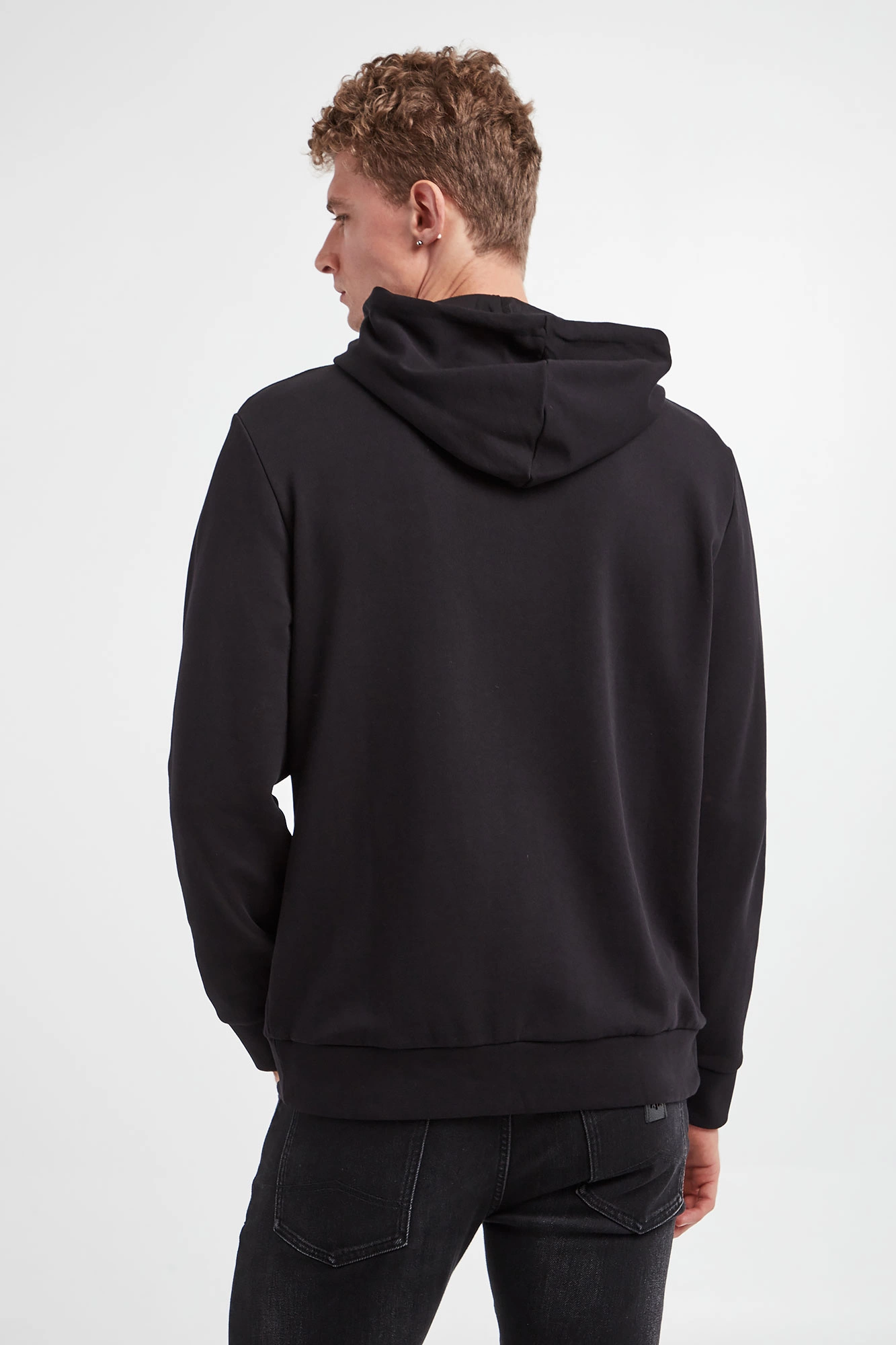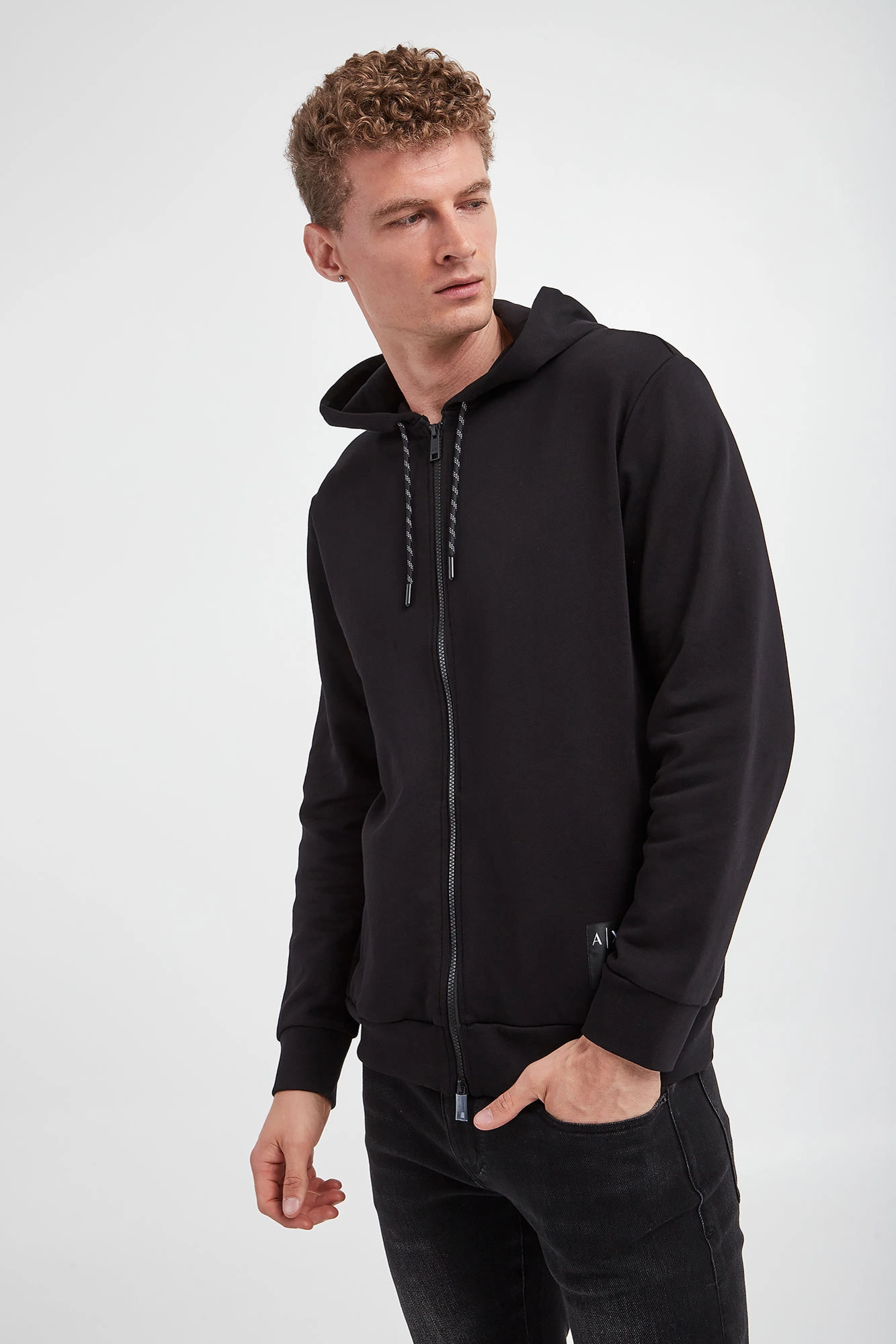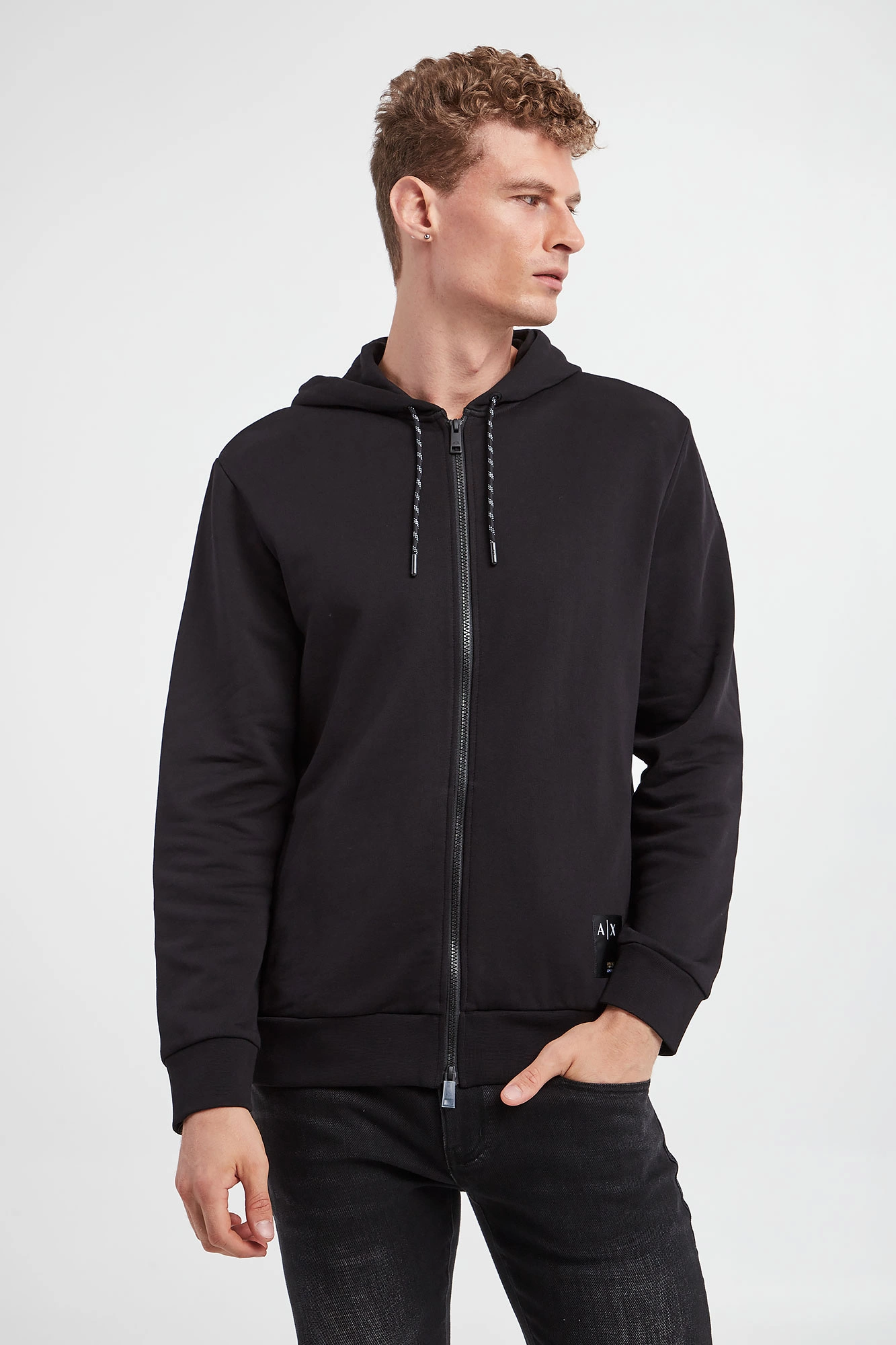 Bluza z kapturem marki Armani Exchange w czarnym kolorze. Zapinana za pomocą dwustronnego zamka z sygnowanymi zawieszkami. U dołu czarna naszywka z logo. Dwie boczne kieszenie. Rękawy i dół wykończone prążkowanymi ściągaczami. Kaptur regulowany za pomocą dwukolorowych troczków. Fason typu regular. Wykonana z czystej bawełny.