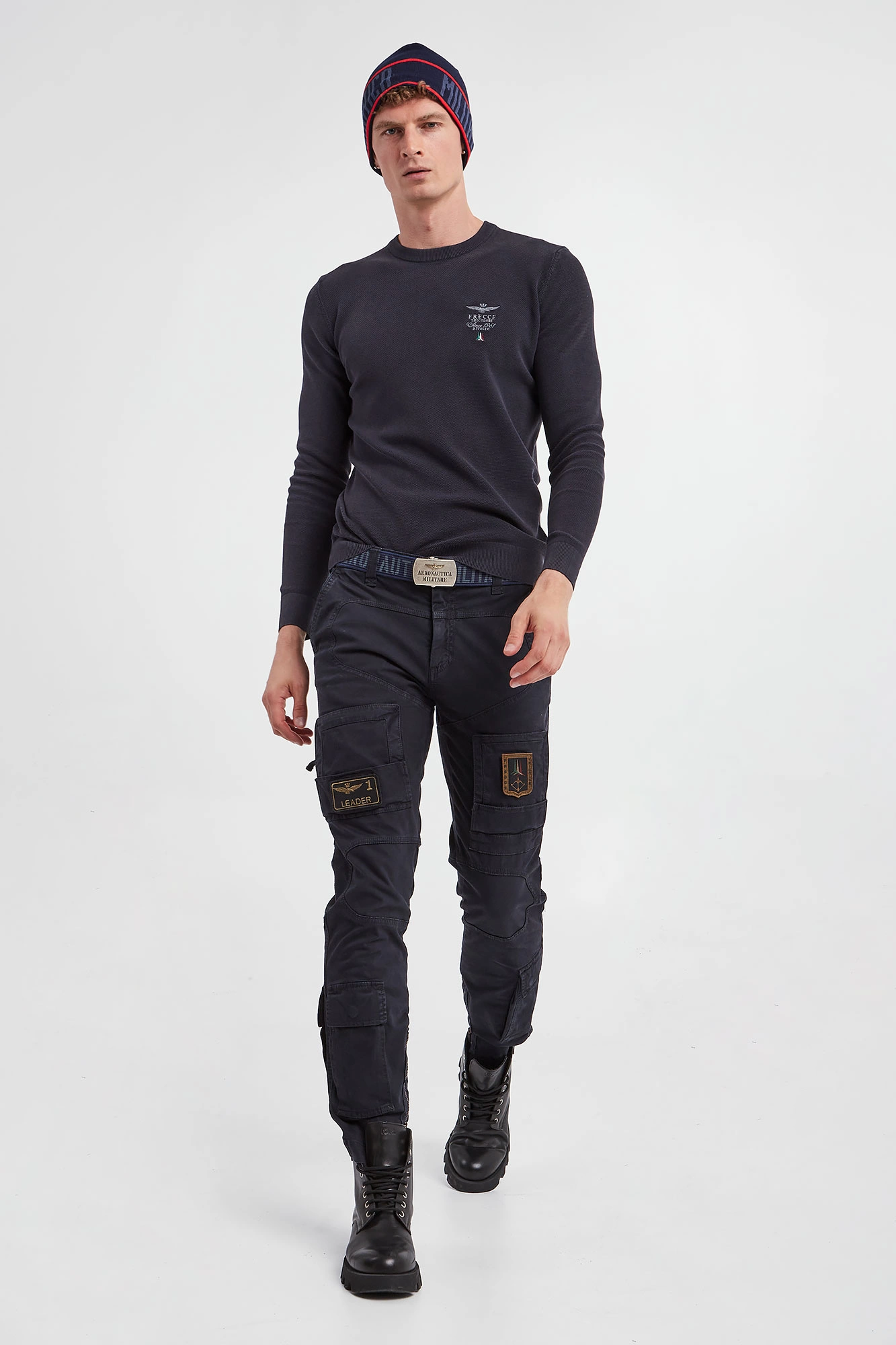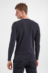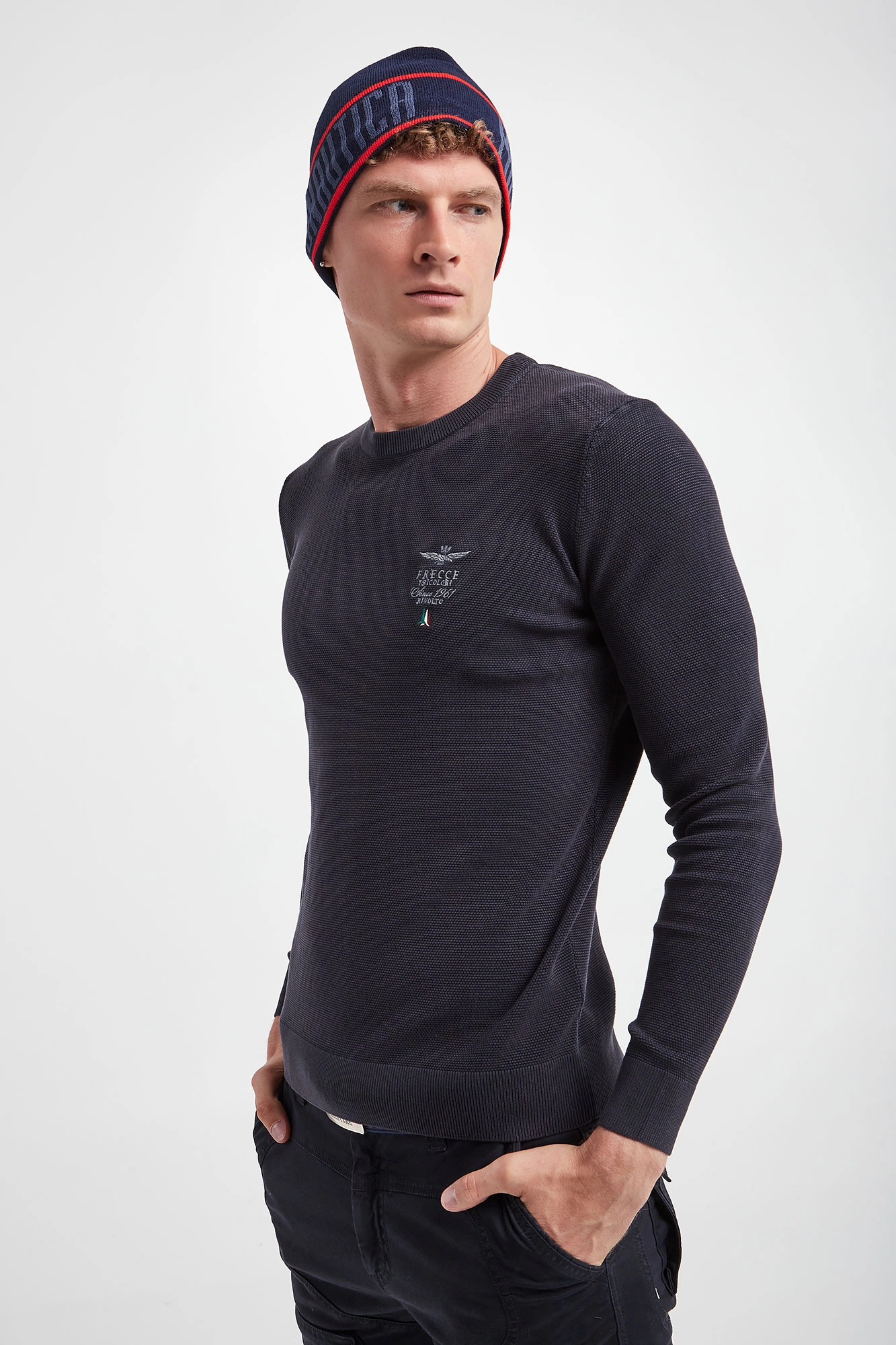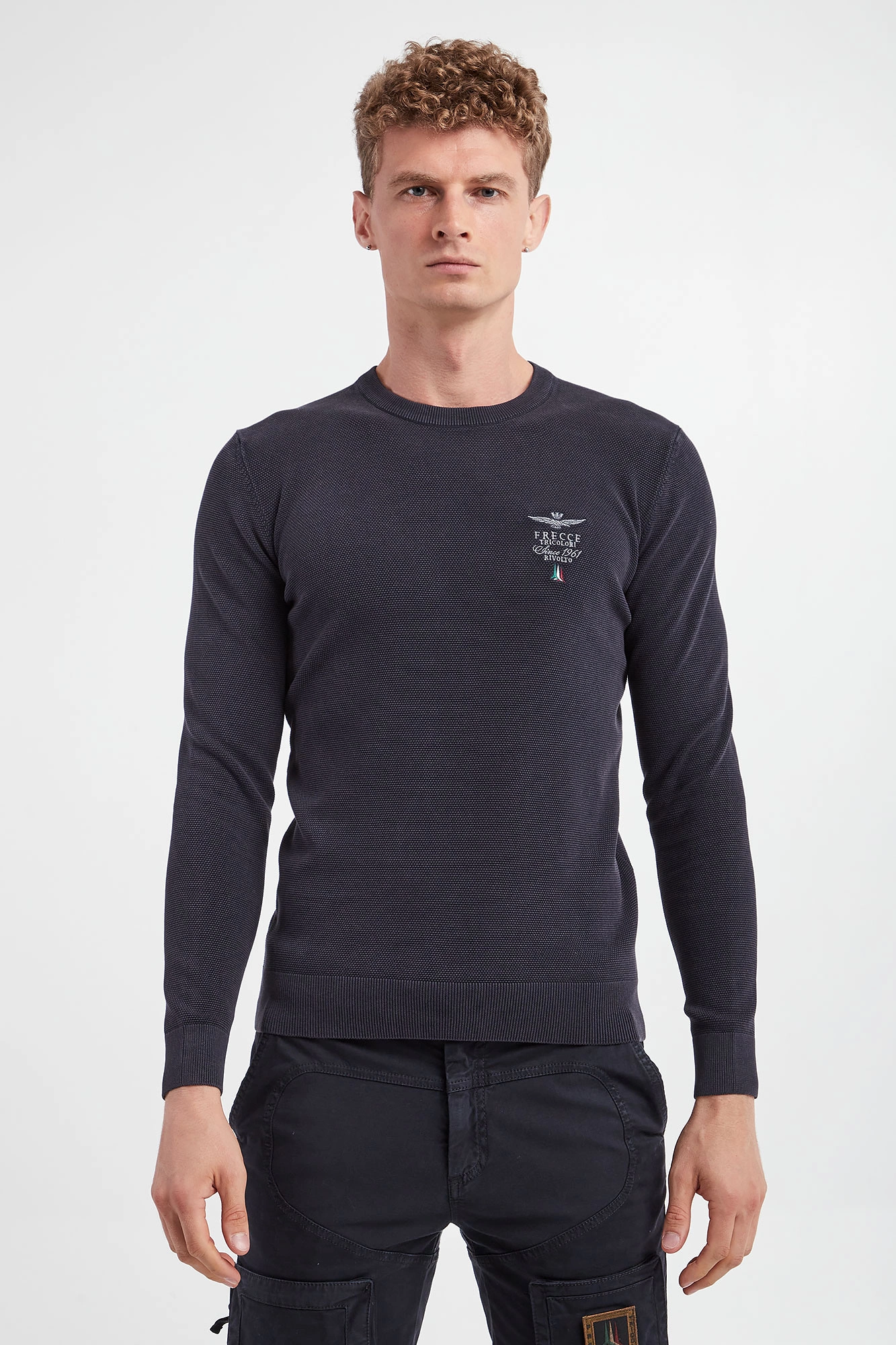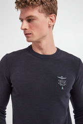 Sweter marki Aeronautica Militare w granatowym kolorze. Fason prosty. Z boku niewielki haft z logo marki. Dekolt typu o-neck, rękawy i dół wykończone ściągaczem. Na całości małe prążki. Wykonany z miękkiej, bawełnianej tkaniny.