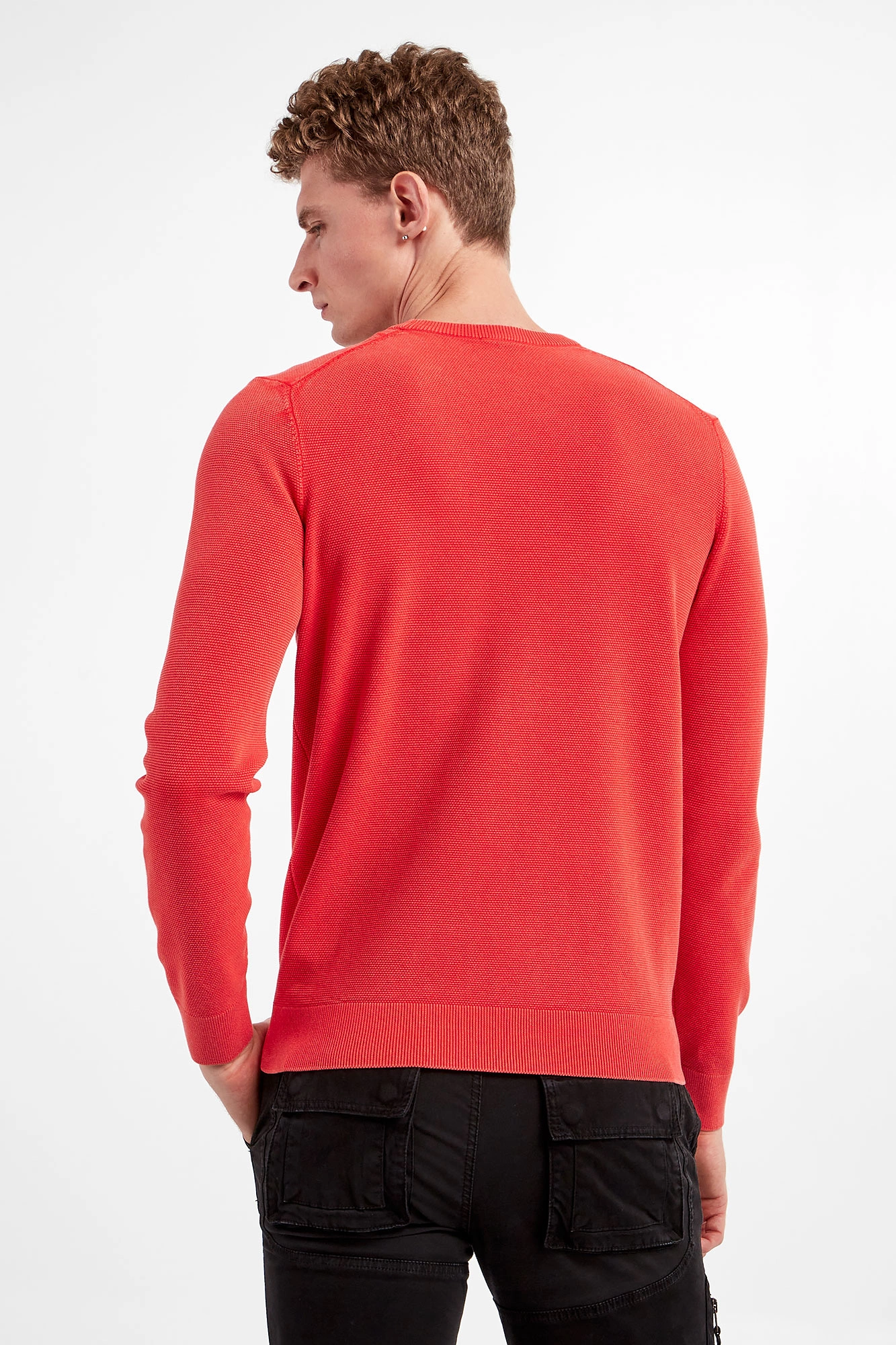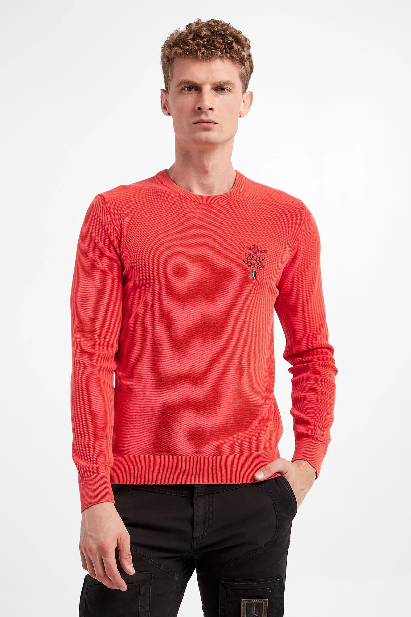 Sweter marki Aeronautica Militare w kolorze koralowym. Fason prosty. Z boku niewielki haft z logo marki. Dekolt typu o-neck, rękawy i dół wykończone ściągaczem. Na całości małe prążki. Wykonany z miękkiej, bawełnianej tkaniny.
