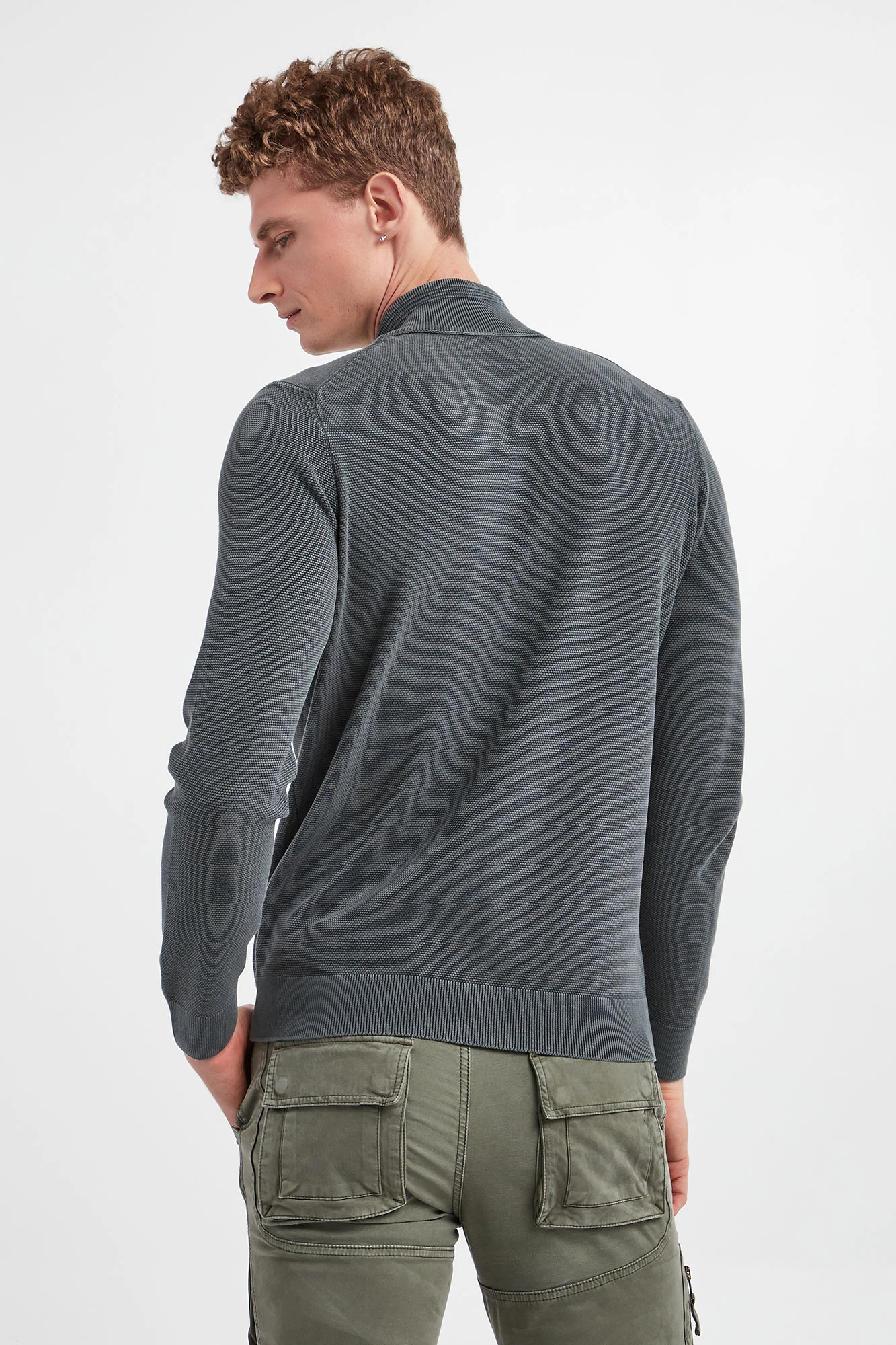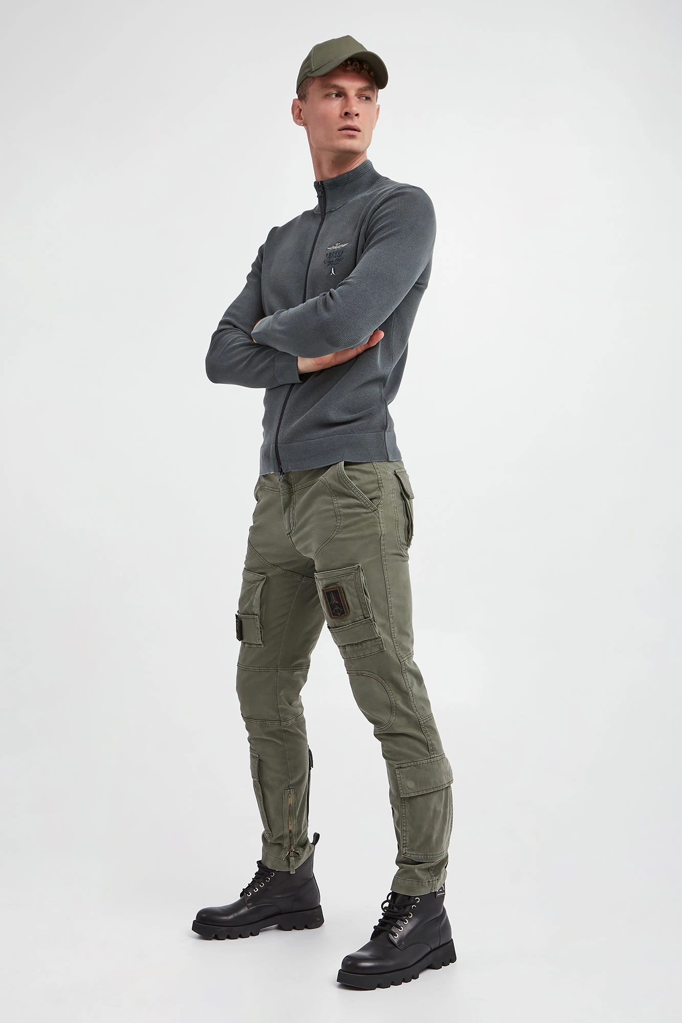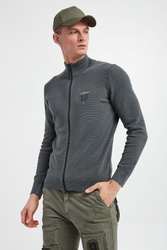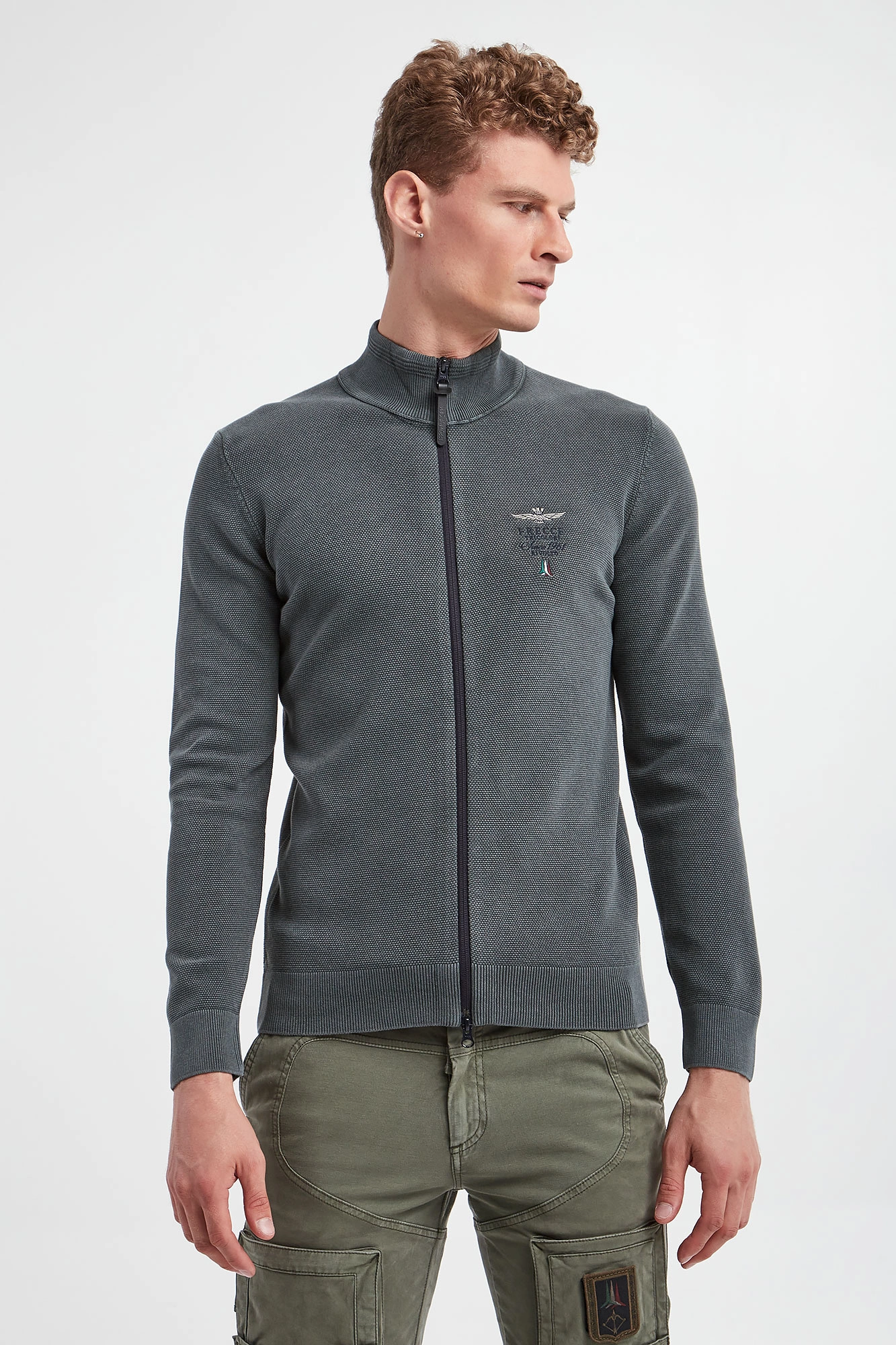 Sweter marki Aeronautica Militare w zielonym kolorze. Na całości prążki. Z boku haftowane logo. Zapinany za pomocą dwukierunkowego zamka. Dekolt ze stójką, długie rękawy i dół zakończone ściągaczami. Fason typu regular. Wykonany z mieszanki bawełny i lyocellu.