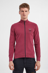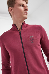 Sweter marki Aeronautica Militare w bordowym kolorze. Na całości prążki. Z boku haftowane logo. Zapinany za pomocą dwukierunkowego zamka. Dekolt ze stójką, długie rękawy i dół zakończone ściągaczami. Fason typu regular. Wykonany z mieszanki bawełny i lyocellu.