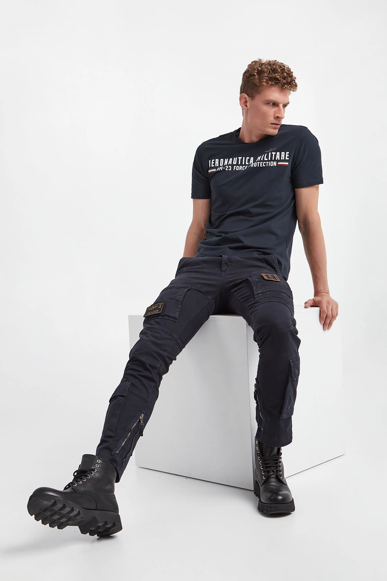 Bawełniany T-shirt marki Aeronautica Militare w granatowym kolorze. Na froncie gumowany nadruk z nazwą marki i haft w postaci logo marki. Dekolt o-neck wykończony gładkim ściągaczem. Fason typu regular.