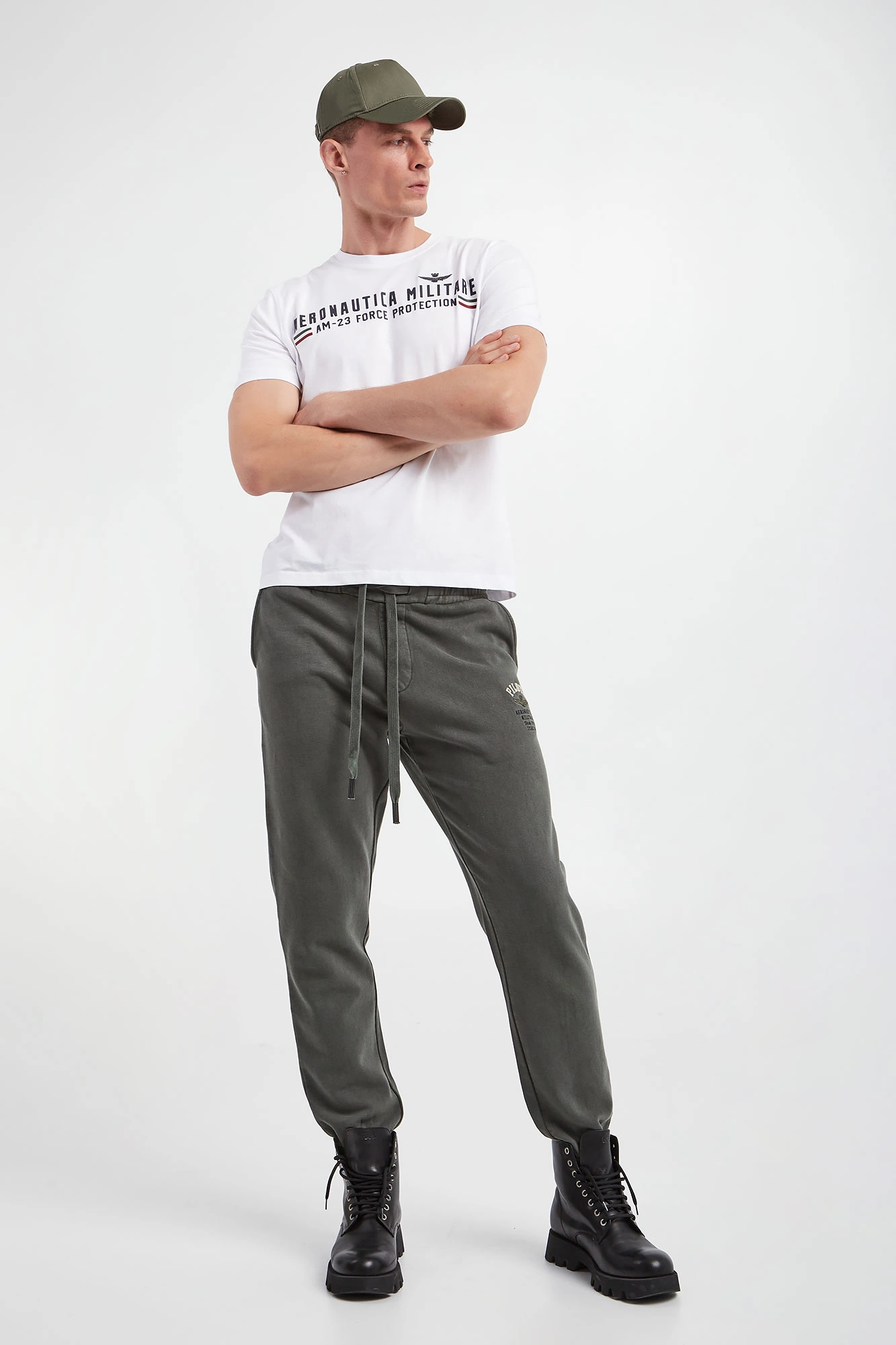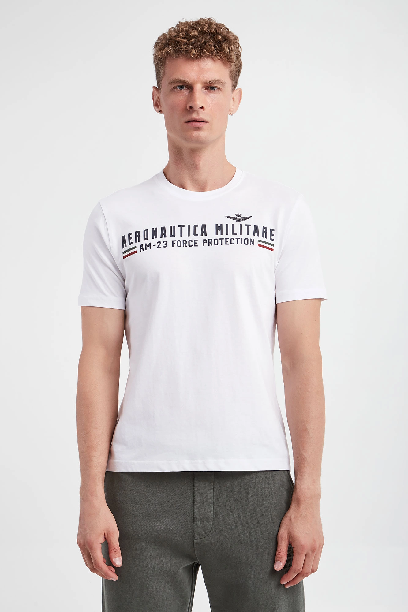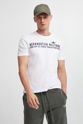 Bawełniany T-shirt marki Aeronautica Militare w białym kolorze. Na froncie gumowany nadruk z nazwą marki i haft w postaci logo marki. Dekolt o-neck wykończony gładkim ściągaczem. Fason typu regular.