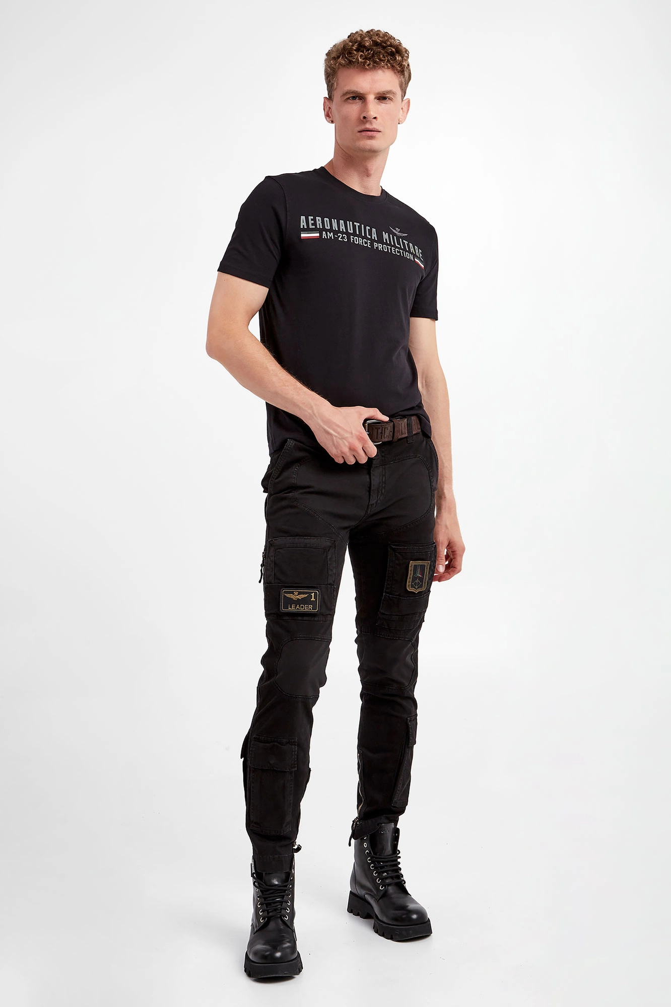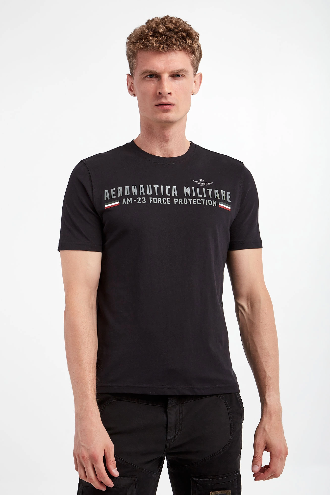 Bawełniany T-shirt marki Aeronautica Militare w czarnym kolorze. Na froncie gumowany nadruk z nazwą marki i haft w postaci logo marki. Dekolt o-neck wykończony gładkim ściągaczem. Fason typu regular.