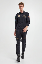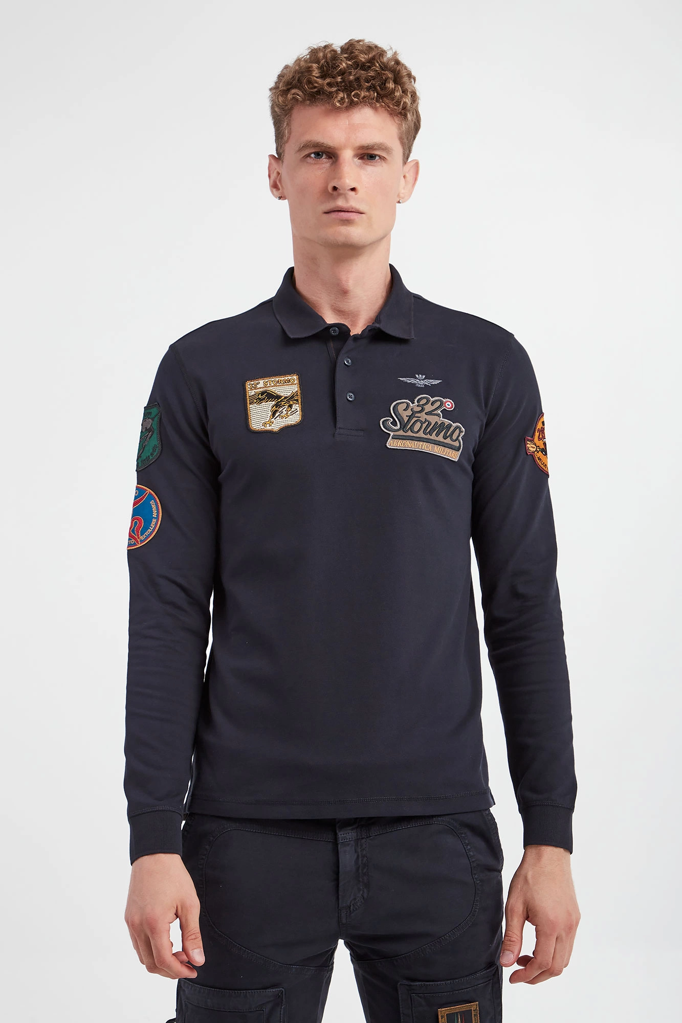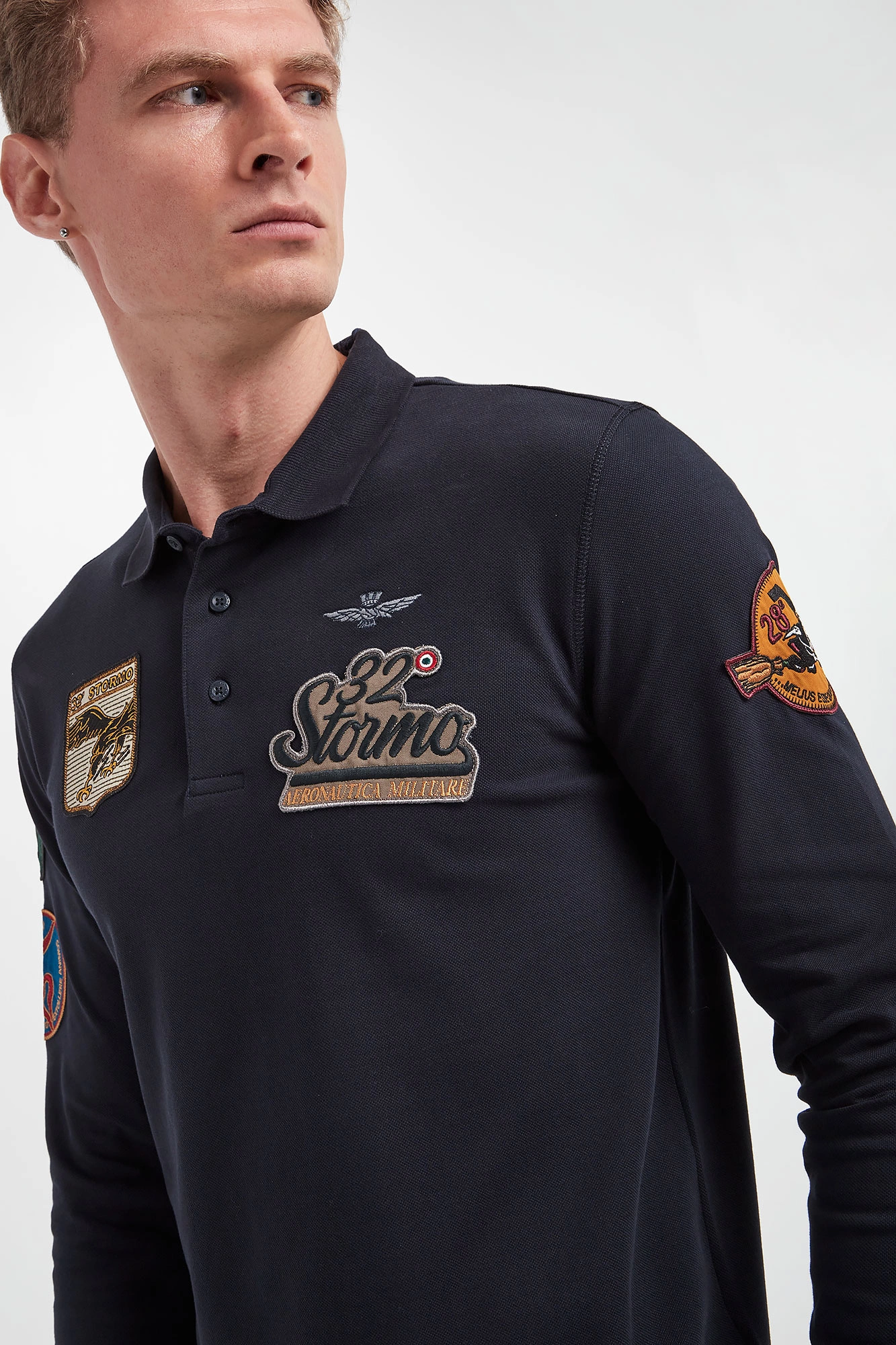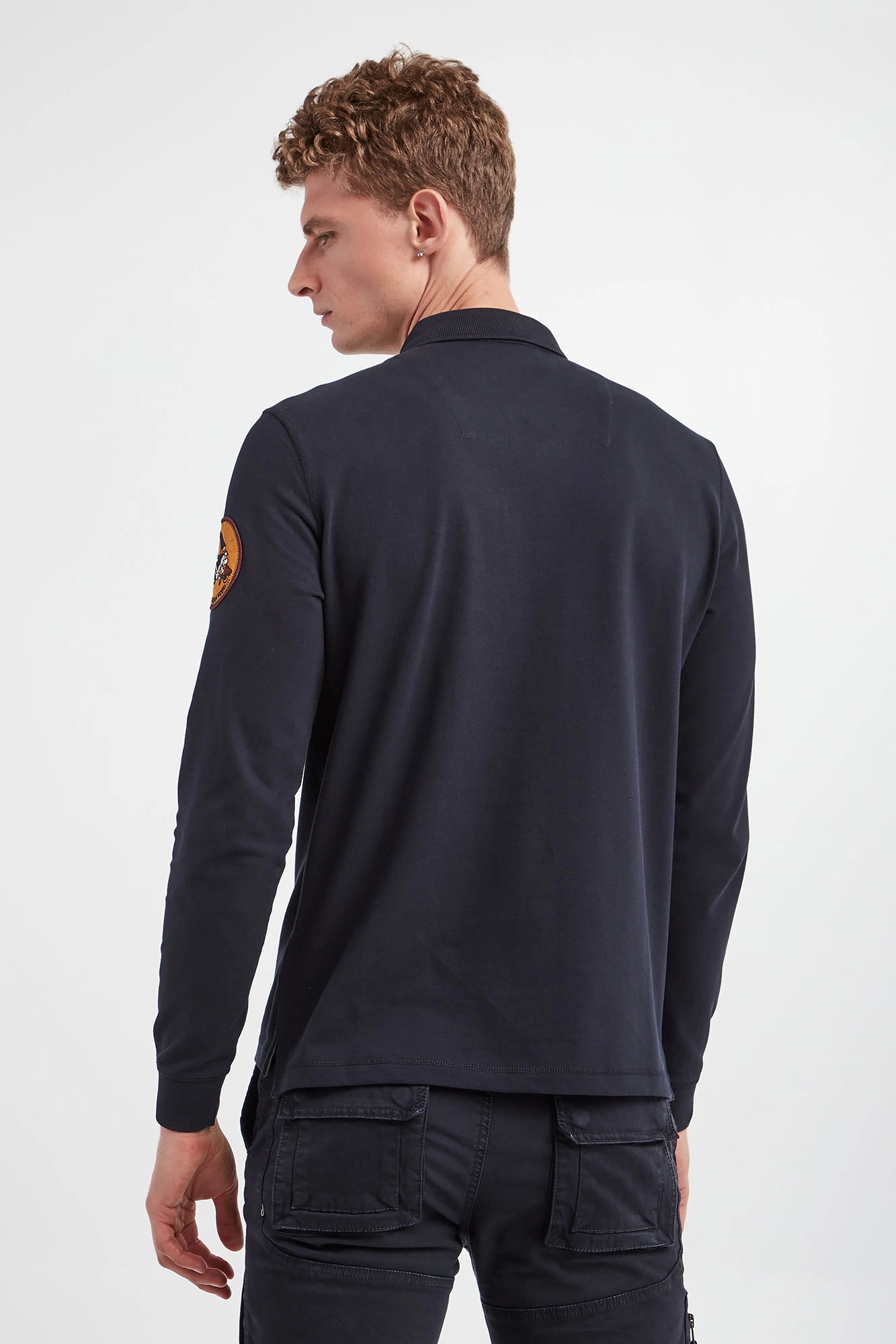 Polo z długim rękawem marki Aeronautica Militare w kolorze granatowym. Wykonane z bawełny pika. Z klasycznym kołnierzykiem i trzema guzikami. Na froncie i rękawach naszywki z motywem charakterystycznym dla marki. Rękawy i kołnierzyk wykończone ściągaczem prążkowanym. Fason typu regular.