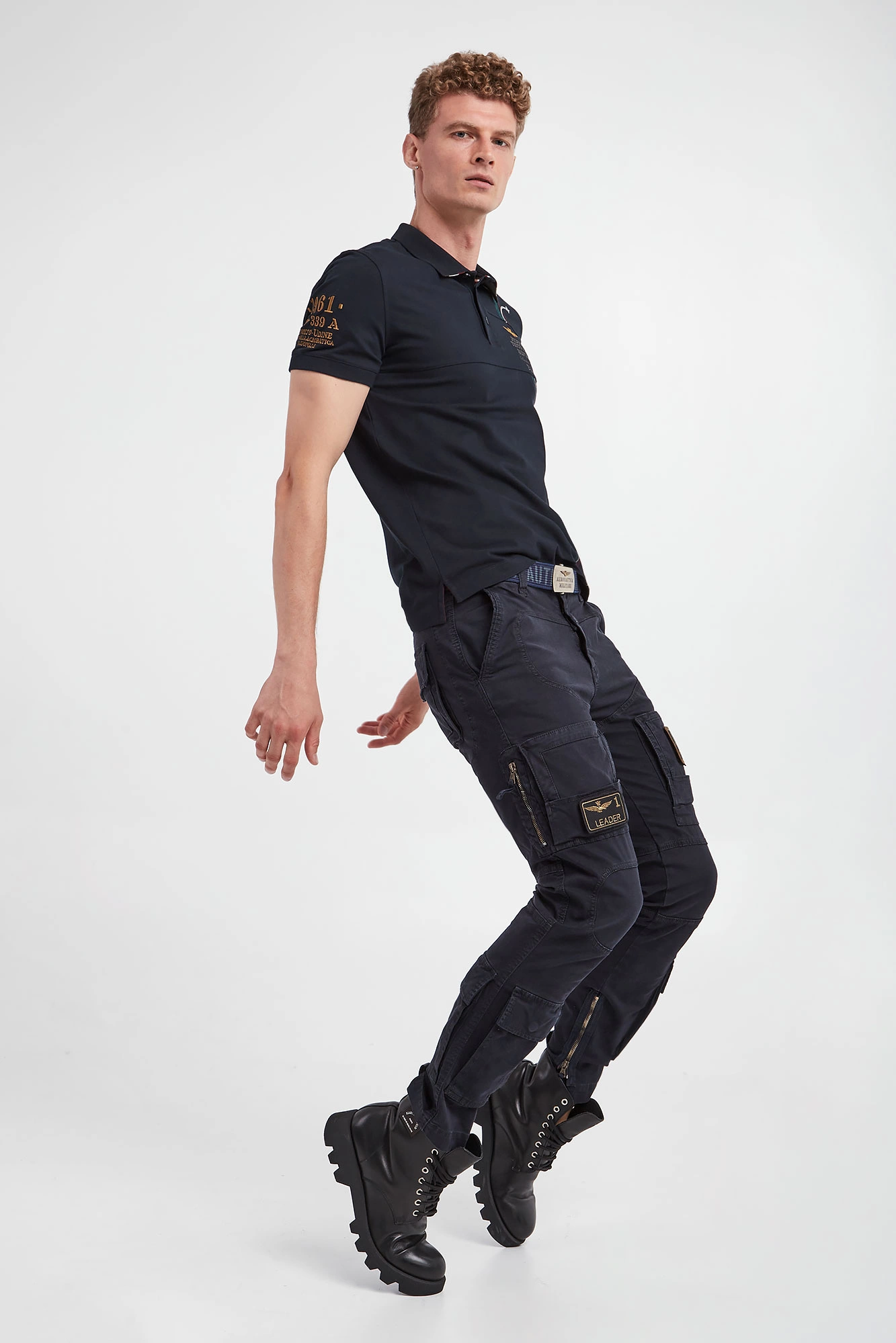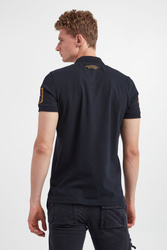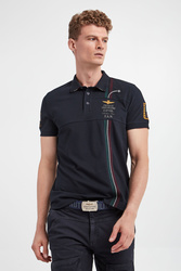 Polo marki Aeronautica Miltare w granatowym kolorze. Wykonane z bawełny pika. Z boku i na rękawach kolorowe hafty z logo. Klasyczny kołnierzy zapinany za pomocą sygnowanych guzików. Krótkie rękawki zakończone ściągaczami. Dół wykończony lamówką. Po bokach rozcięcia.