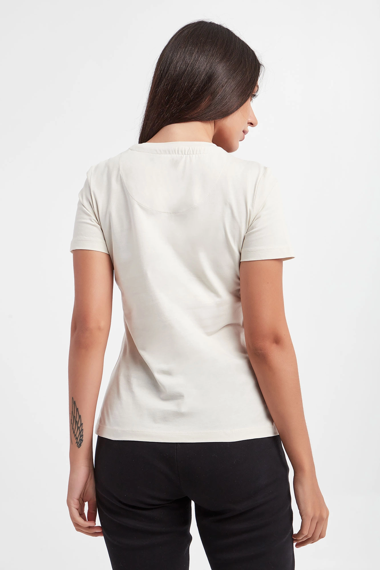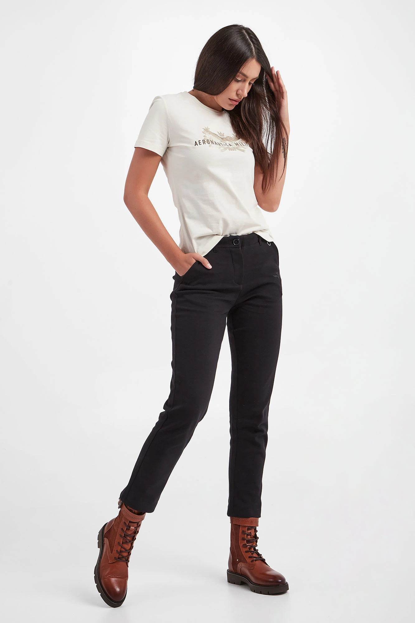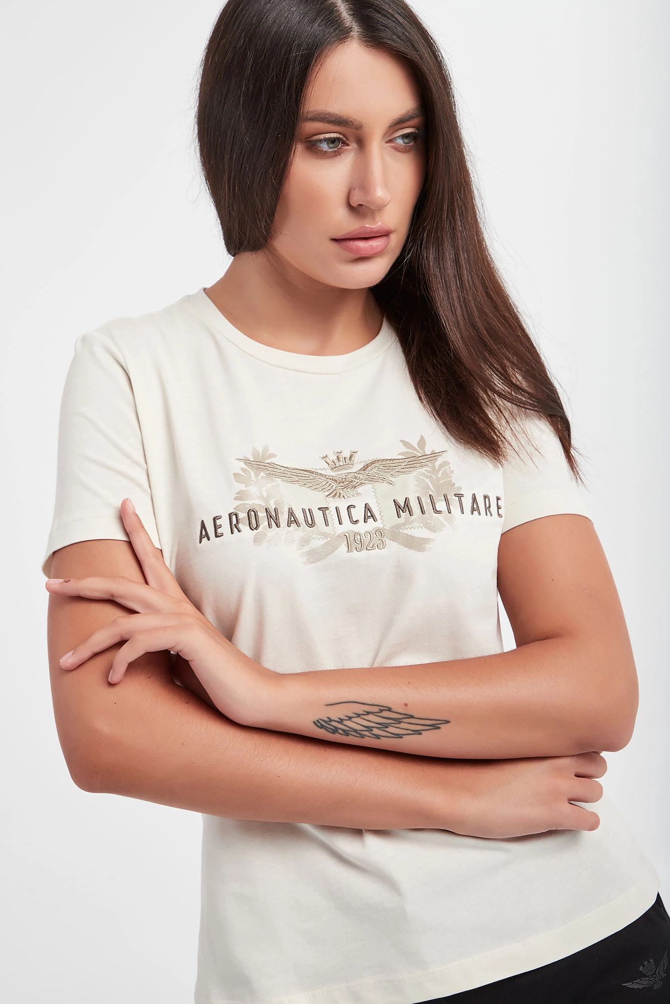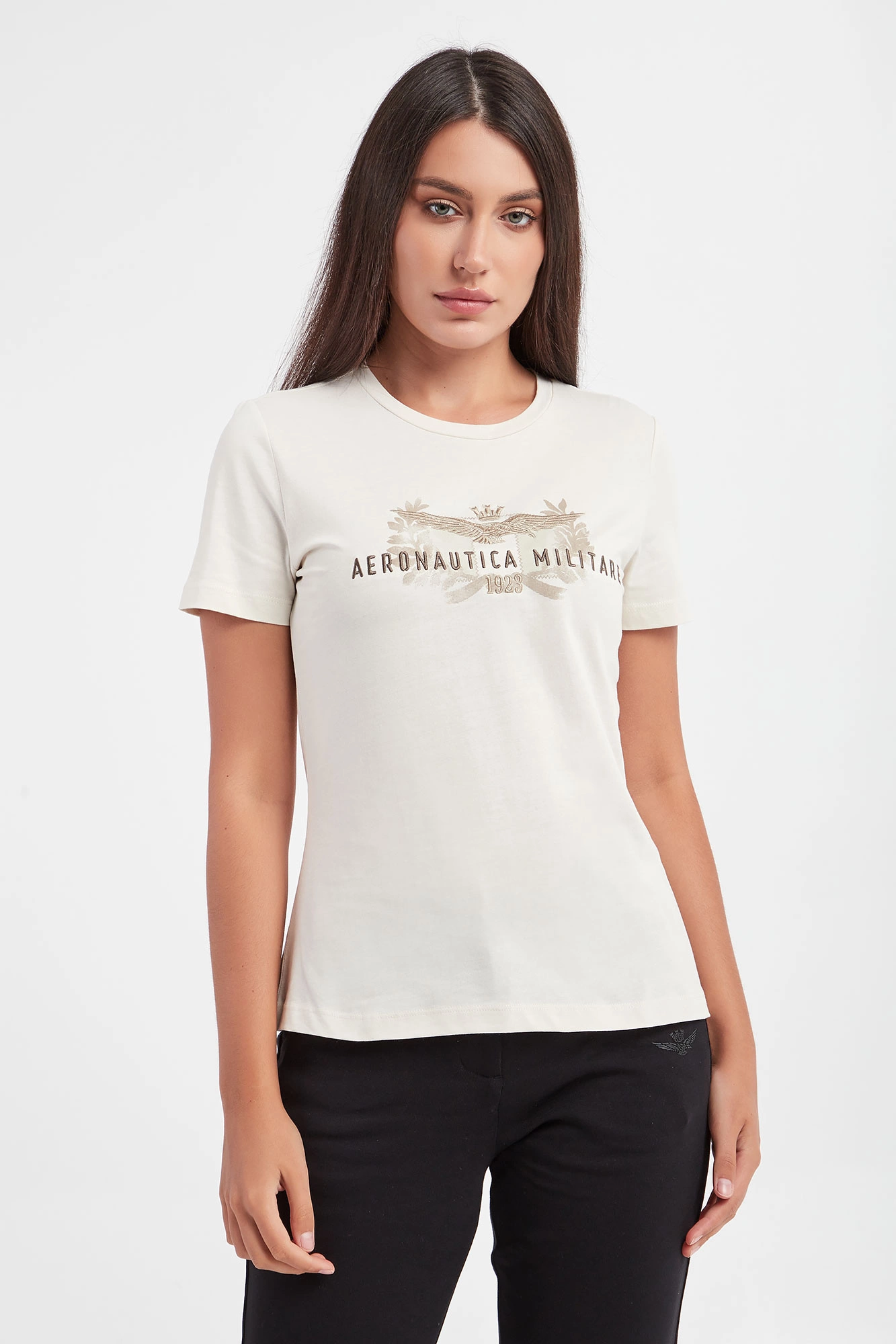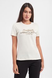 Bawełniany T-shirt marki Aeronautica Militare w kolorze ecru. Z przodu haft z logo i nazwą marki w beżowym kolorze. Dekolt typu o-nek wykończony wywinięciem. Krótkie rękawy. Wykonany z czystej bawełny. Fason typu regular.