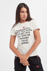 Bawełniany T-shirt marki Aeronautica Militare w kolorze ecru. Z przodu kolorowy nadruk z nazwą i logo marki. Dekolt typu o-nek wykończony wywinięciem. Krótkie rękawy. Wykonany z czystej bawełny. Fason typu regular.