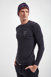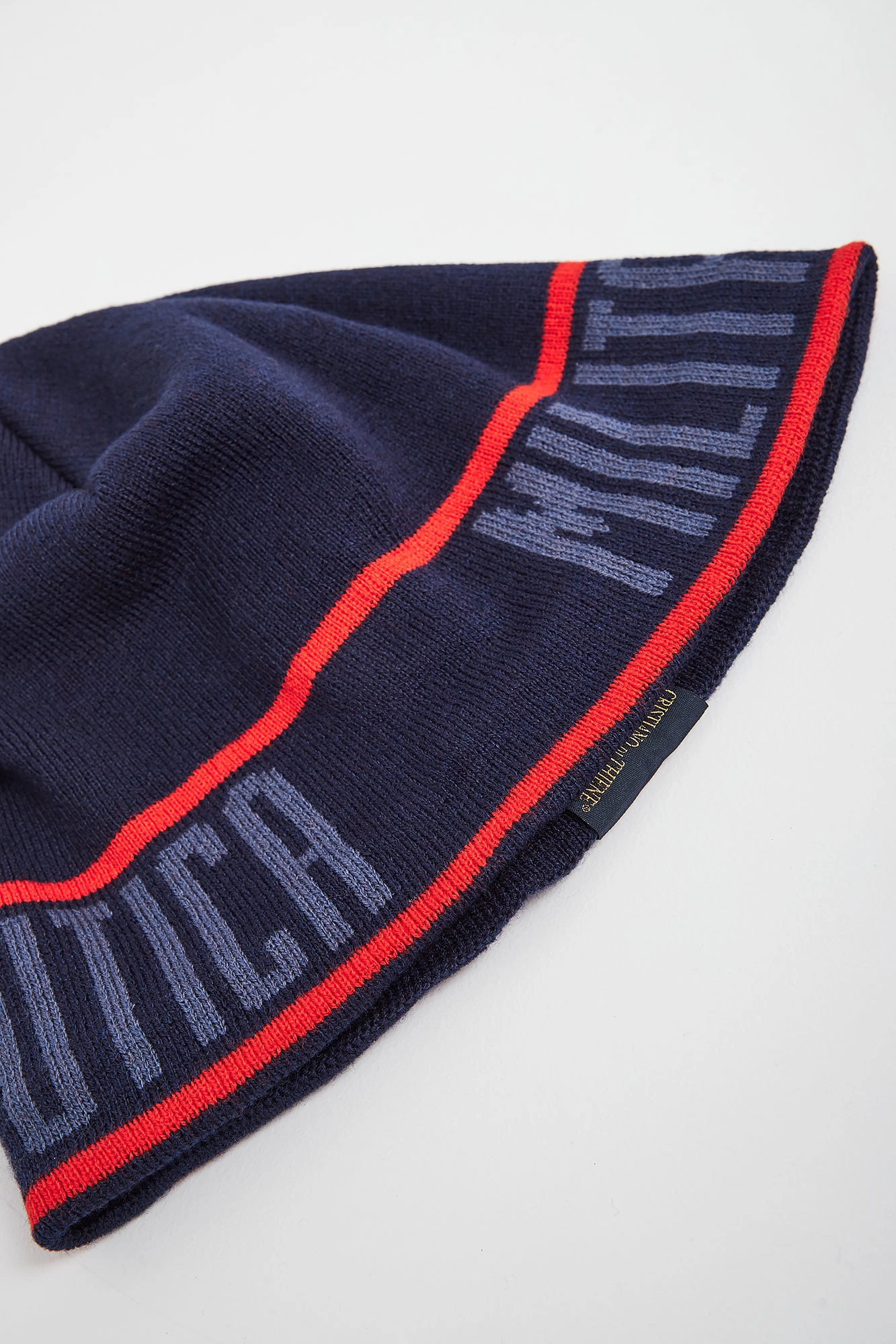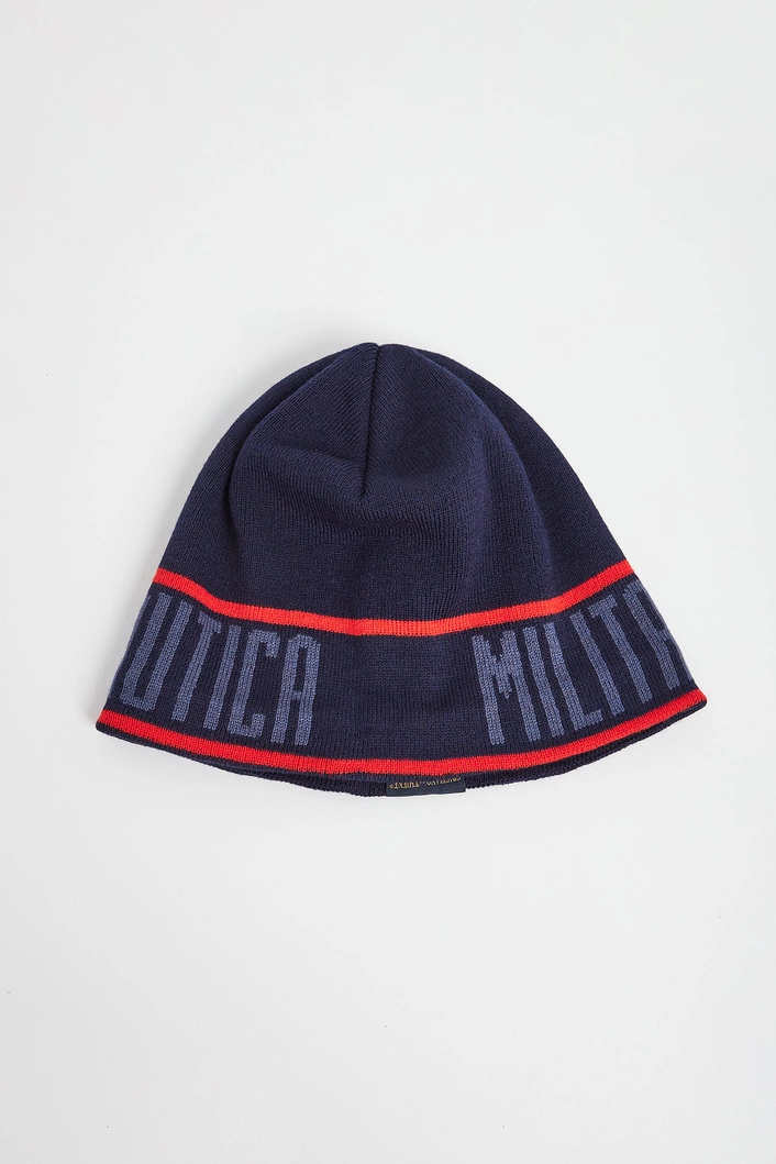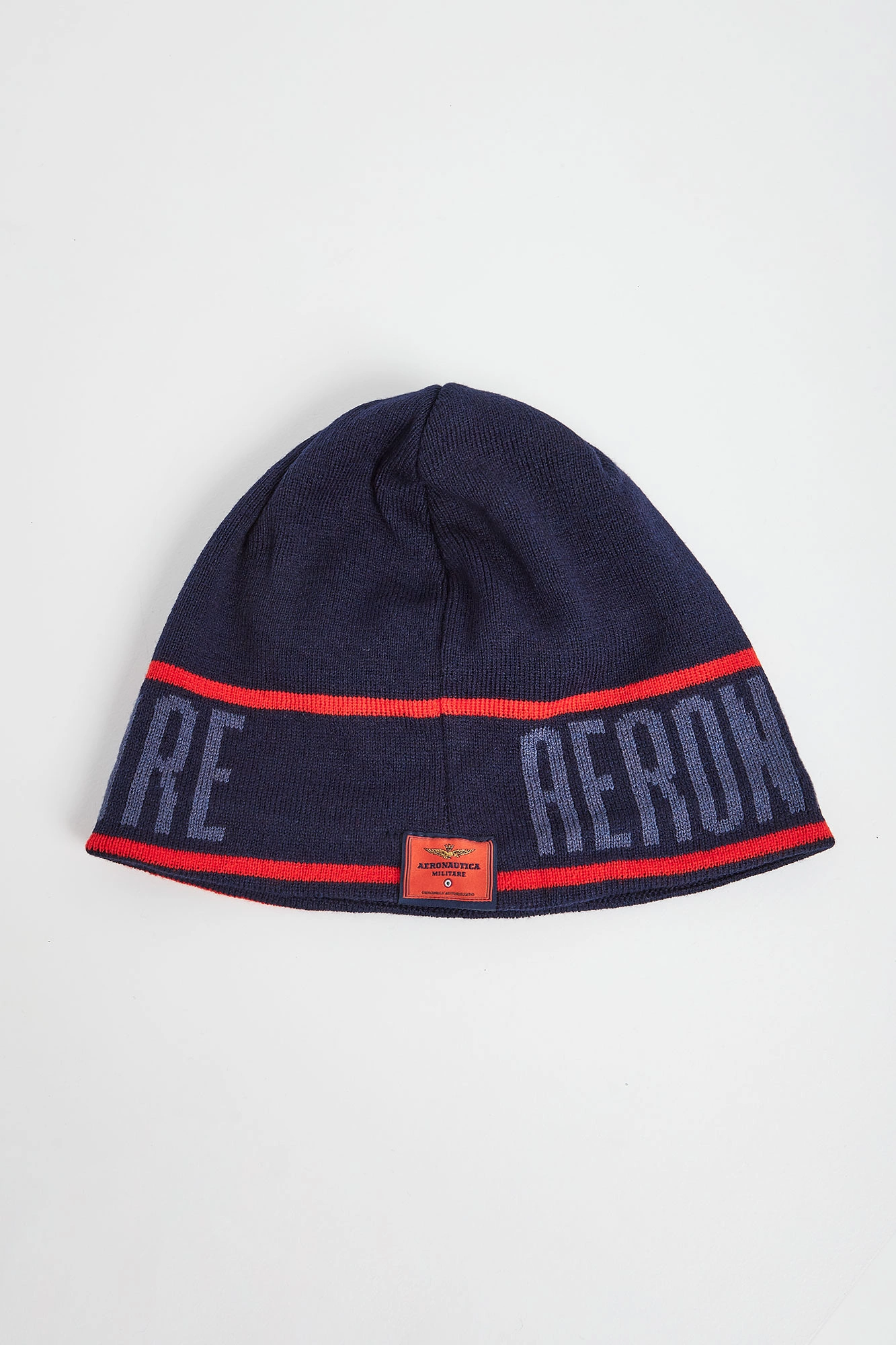 Dzianinowa czapka marki Aeronautica Militare w granatowym kolorze. Wykończona lampasem z nazwą marki i obwódką w kolorze czerwonym. Na brzegu sygnowana metka. Czapka z miękkim i przyjemnym w dotyku ociepleniem wewnątrz.