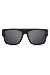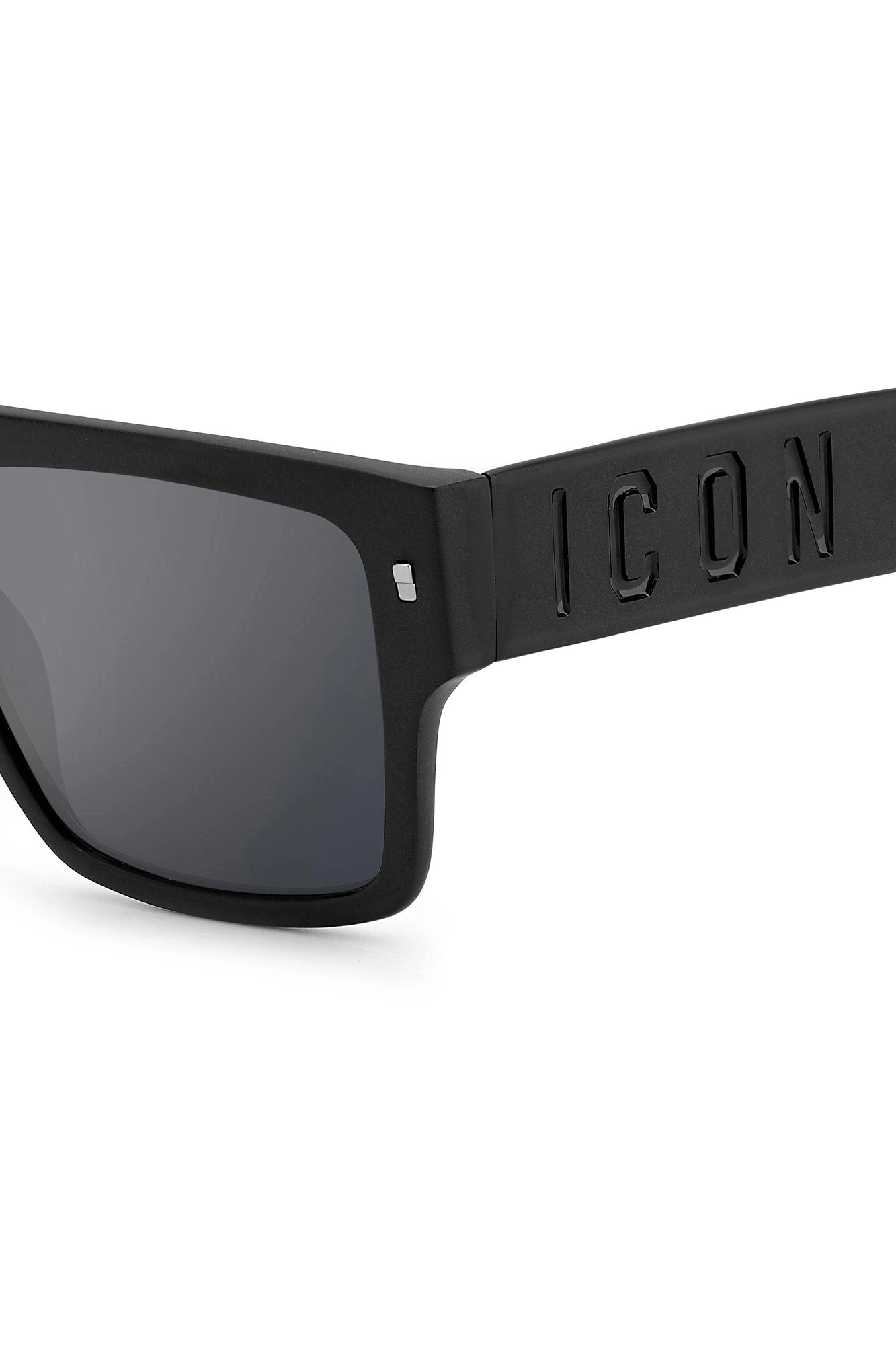 Okulary marki Dsquared2 w matowym czarnym kolorze. Zauszniki wyprofilowane, sygnowane tłoczonym, połyskującym napisem Icon, na końcach zwieńczone logo z charakterystycznym motywem liścia klonowego. Na froncie ozdobne, metalowe, srebrne wstawki. Szkła w ciemnoszarym kolorze.
